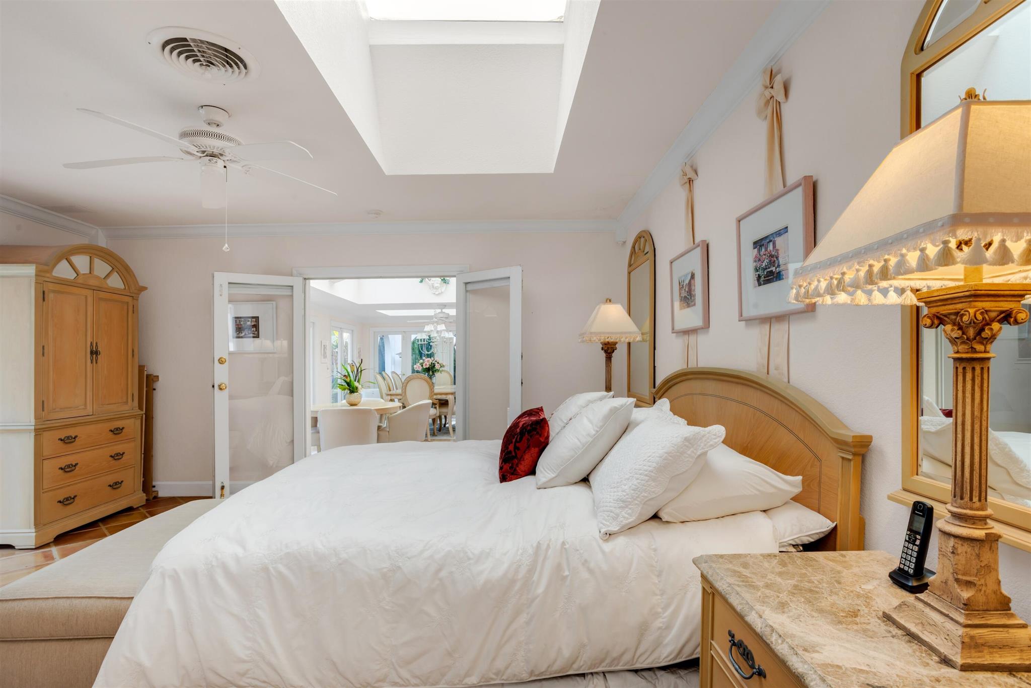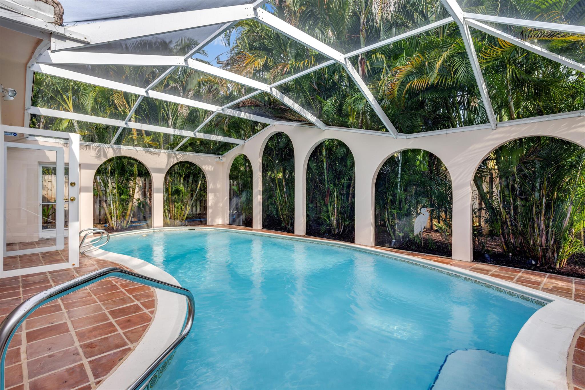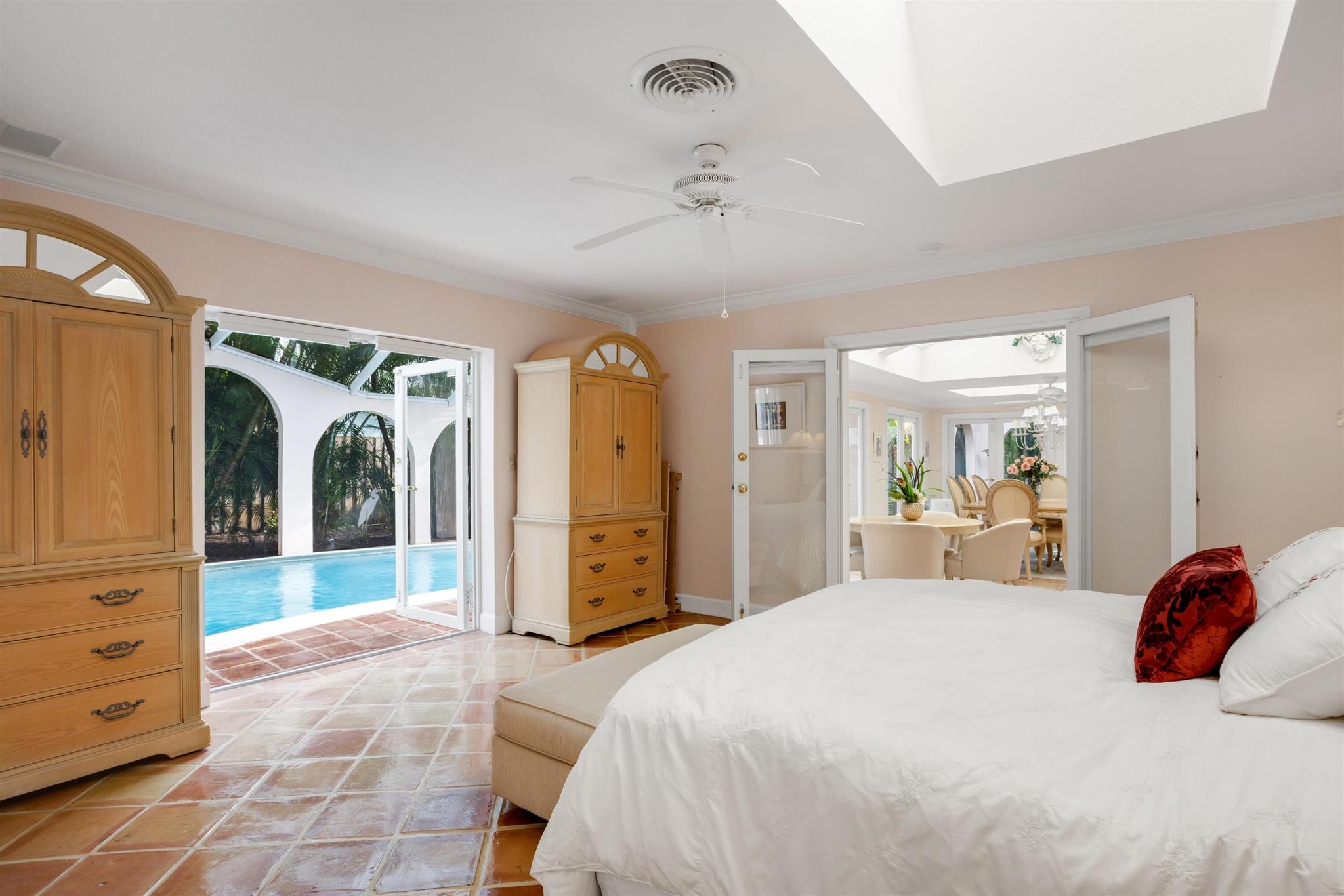 In an exquisite setting and radiating the charm of its era, this beautifully maintained residence is ideal for embracing South Florida's coveted lifestyle. With three bedrooms and 2,408+/- total square feet, its well-conceived floor plan was designed to optimize garden and pool views, seamlessly blending indoor and outdoor spaces. Details throughout include skylights making the interiors light and bright, custom built-in cabinetry, handsome moldings and clay-tile flooring. In the living room, a bay window overlooks the front gardens, while a fireplace adds a welcoming cordiality. The dining area comprises two areas, both defined by skylights and featuring French doors accessing the pool terrace. Just adjacent, the kitchen is fitted with cerused-wood cabinetry, mirrored backsplashes and a p