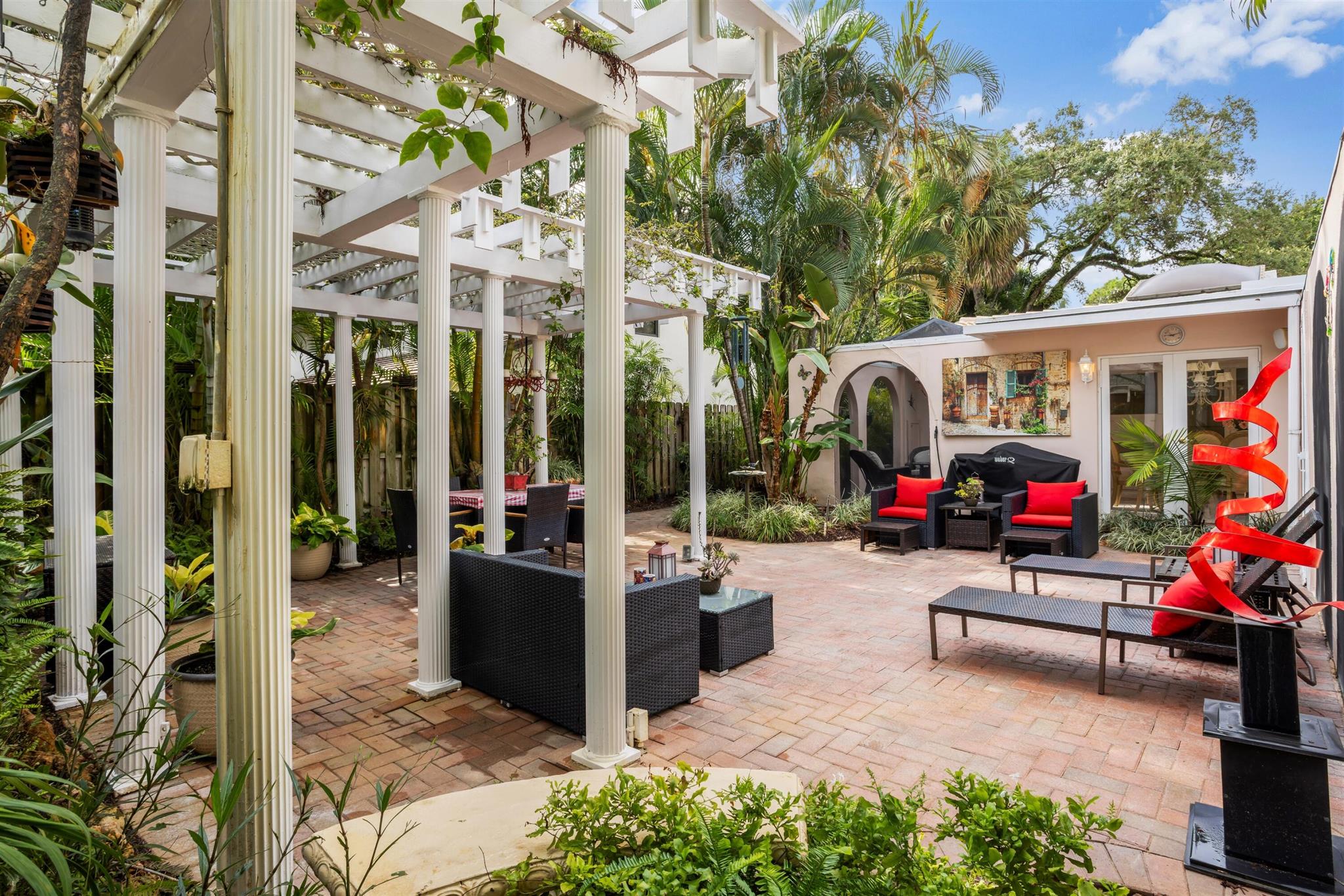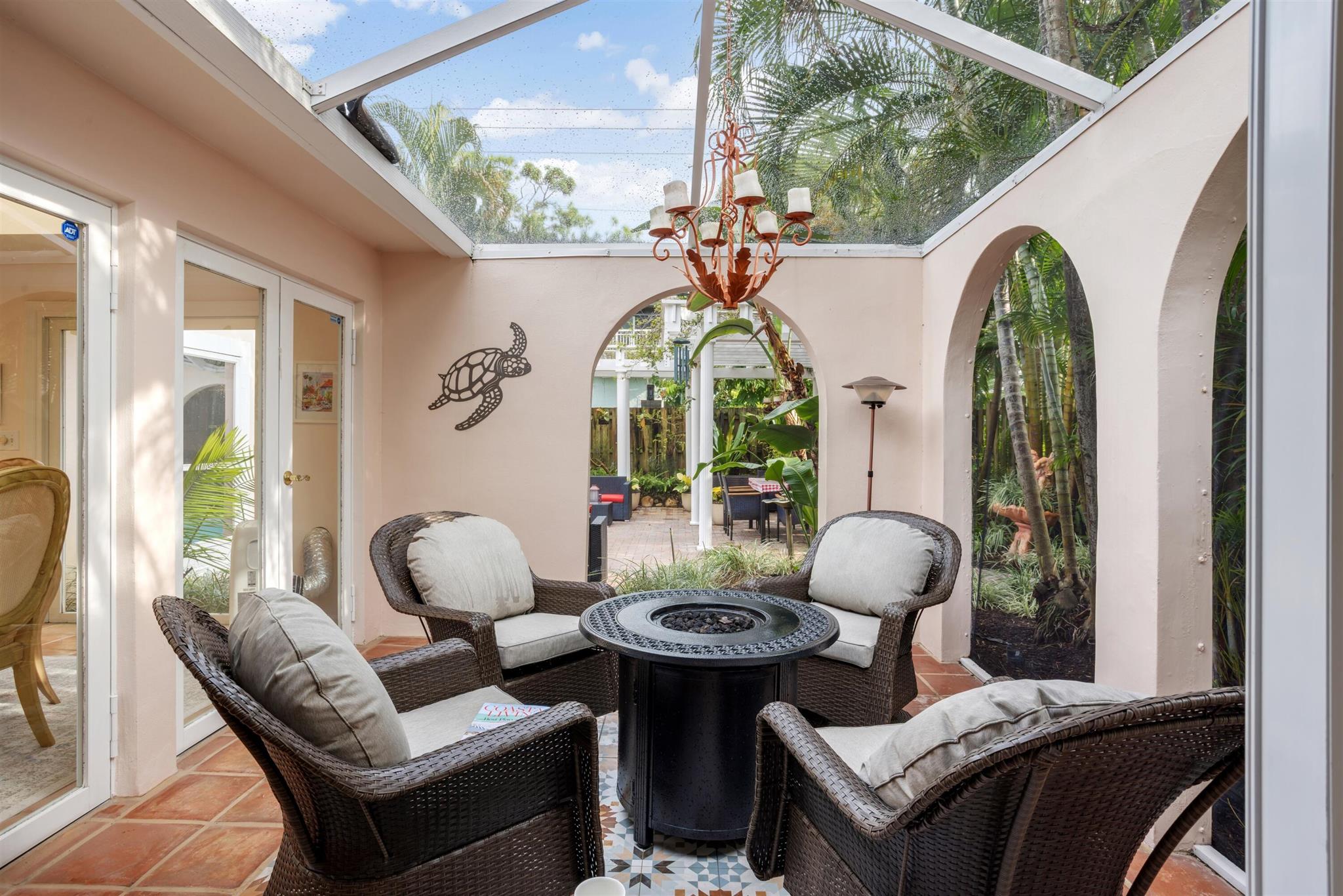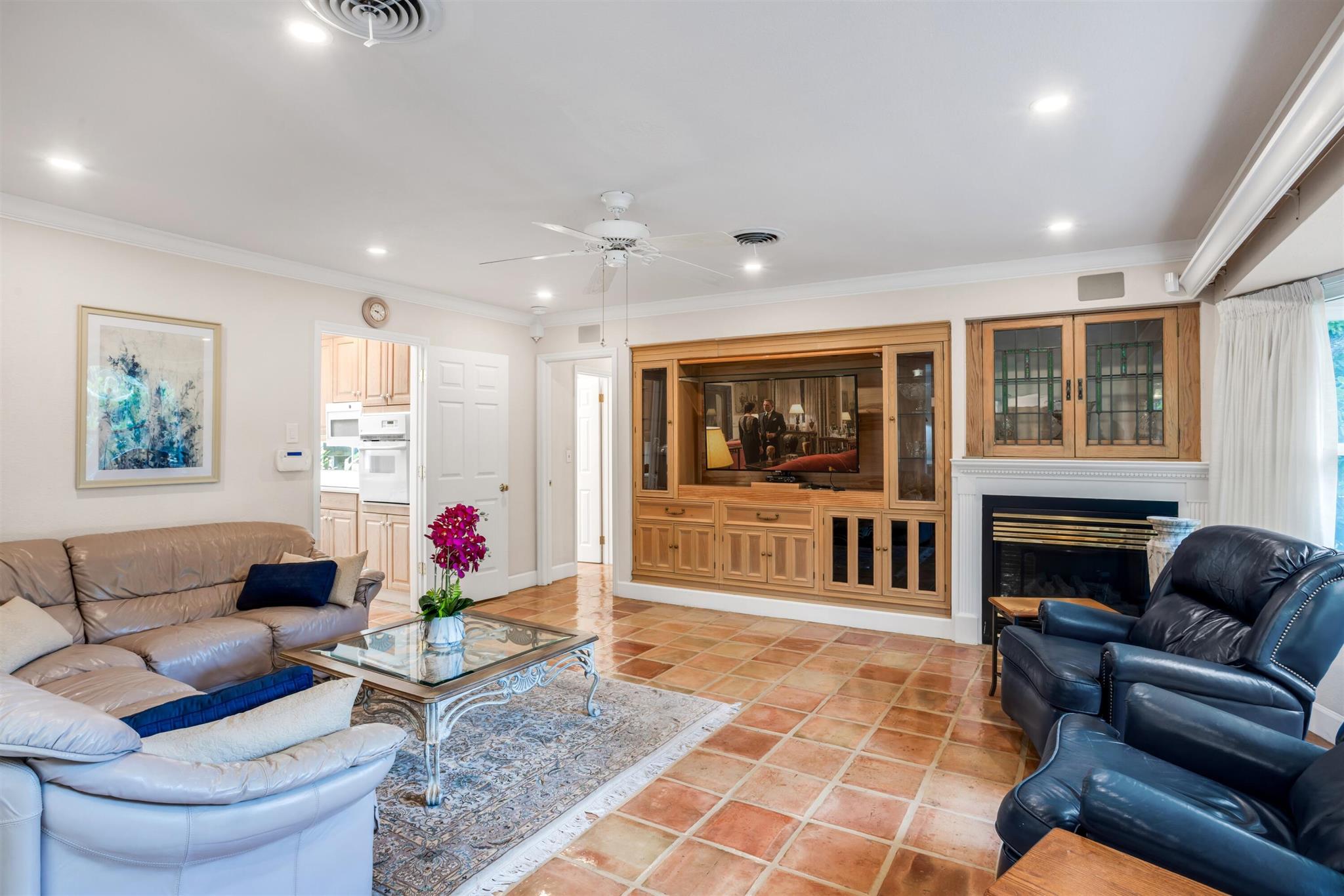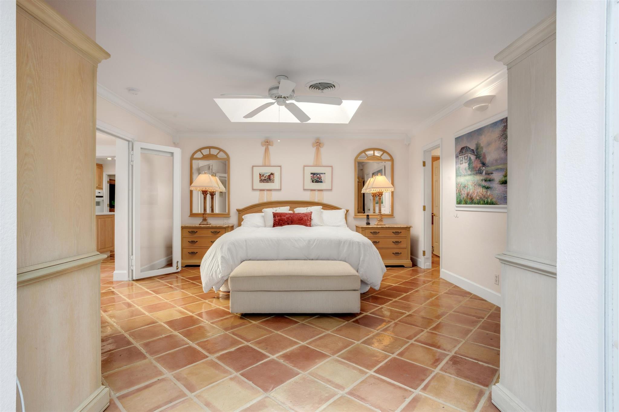 In an exquisite setting and radiating the charm of its era, this beautifully maintained residence is ideal for embracing South Florida's coveted lifestyle. With three bedrooms and 2,408+/- total square feet, its well-conceived floor plan was designed to optimize garden and pool views, seamlessly blending indoor and outdoor spaces. Details throughout include skylights making the interiors light and bright, custom built-in cabinetry, handsome moldings and clay-tile flooring. In the living room, a bay window overlooks the front gardens, while a fireplace adds a welcoming cordiality. The dining area comprises two areas, both defined by skylights and featuring French doors accessing the pool terrace. Just adjacent, the kitchen is fitted with cerused-wood cabinetry, mirrored backsplashes and a p