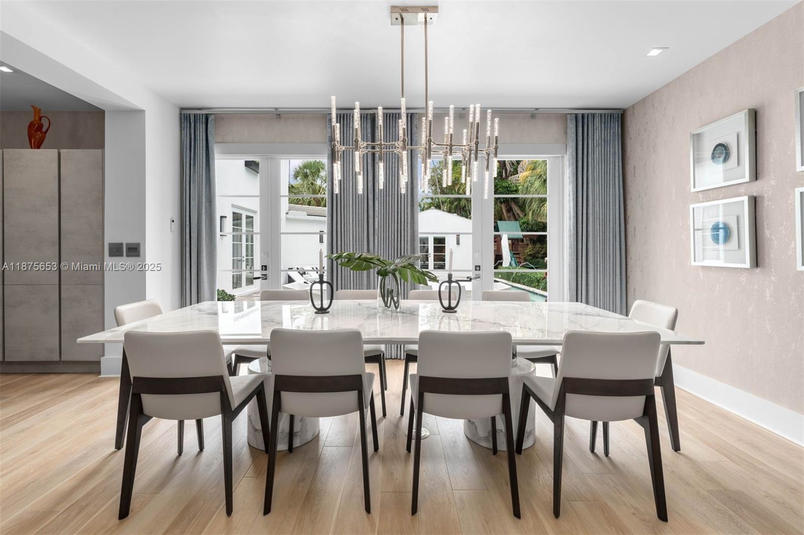 This luxurious Miami Beach estate presents a seamless blend of grandeur and chateau elegance. With 6 beds and 6.5 baths, the open-plan kitchen boasts high-end finishes and top-of-the-line Wolf, Miele, and Subzero appliances. Just steps from the kitchen is a spacious dining area and a relaxing family room. The exquisite master bedroom serves as a private retreat unto itself, featuring a sitting area overlooking the pool and patio. A chic office space, doubling as an ensuite bedroom, offers versatility and convenience. The guest suite impresses with a kitchenette, living area, and stunning lush outdoor views. Conveniently located near upscale restaurants and shops, and a short distance from the ocean, this residence embodies the ultimate Miami Beach lifestyle.