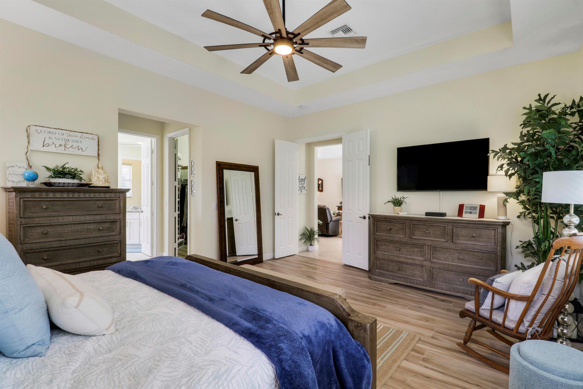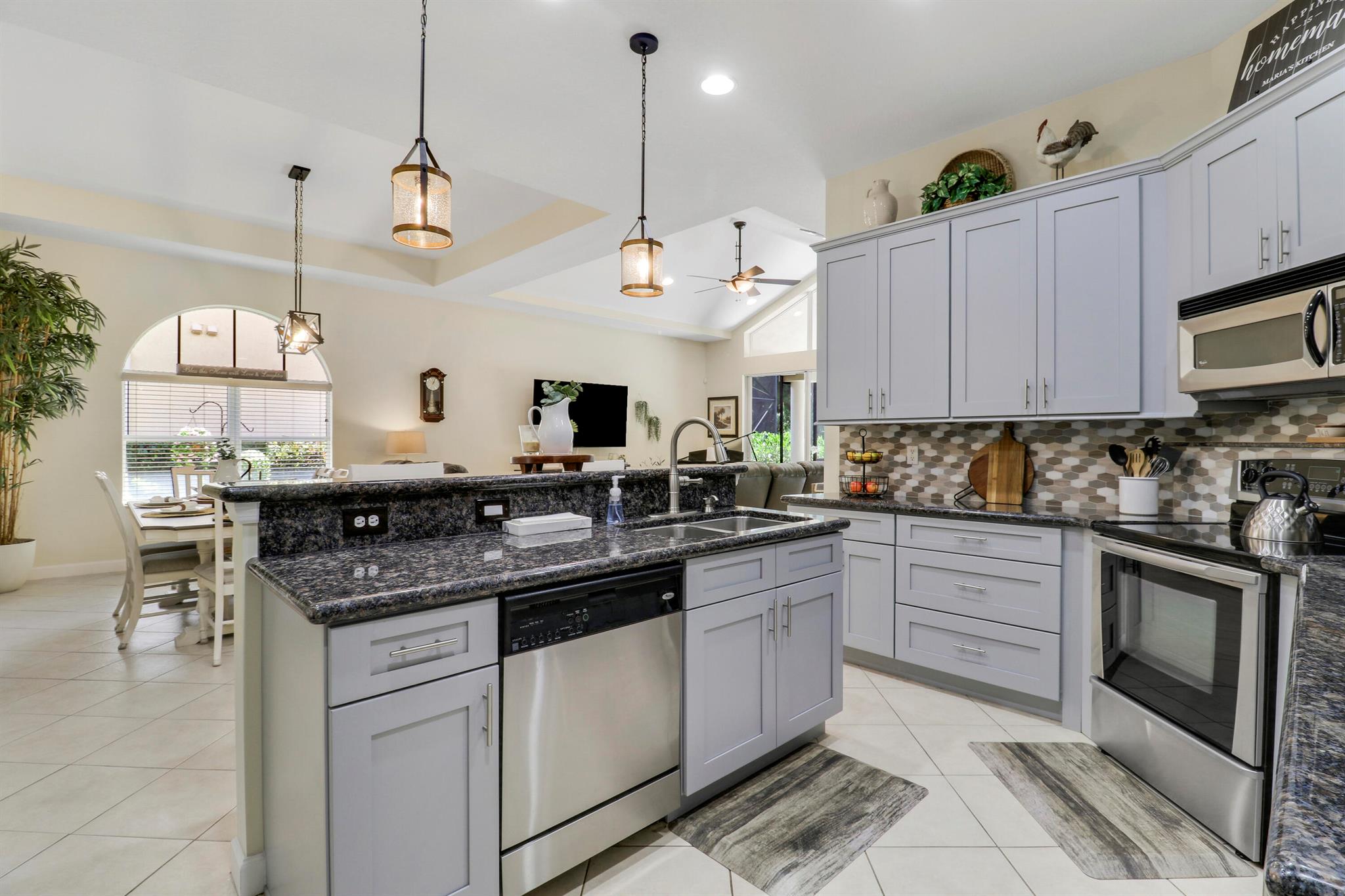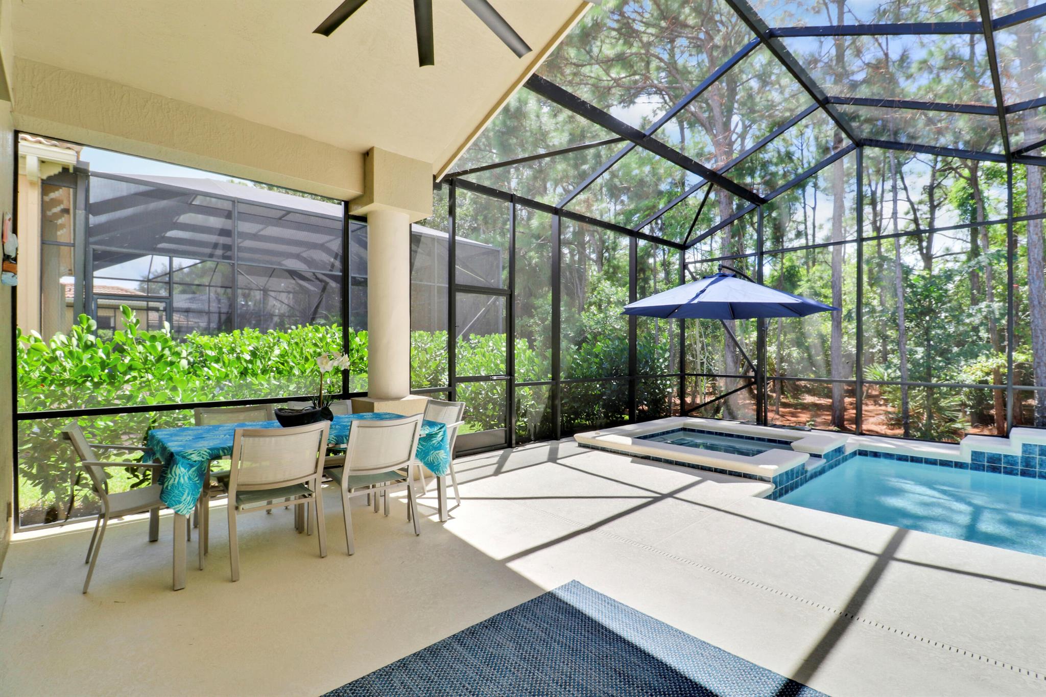 WELCOME HOME! Popular Fairview plan in PGA Village w/ NEW 2024 SALTWATER POOL & SPA! This 2BR+Den/2BA/2CG home has an open floor plan ideal for entertaining & modern living. Special features include tile flooring throughout, decorative glass entry front door, neutral interior paint, new refrigerator, washer, dryer and water heater, vaulted ceilings, updated cabinetry and more. The spacious kitchen features gray cabinetry, granite counters, tile backsplash, SS appliances, pantry closet and breakfast bar. Master Suite has large walk-in closets and a spa like ensuite w/ soaking tub, walk in shower and large vanity w/ dual sinks. The guest bedroom and den are both close to the hall bathroom. Spacious laundry room leads to the garage. The star of the show is the NEW POOL & SPA, built in 2024.