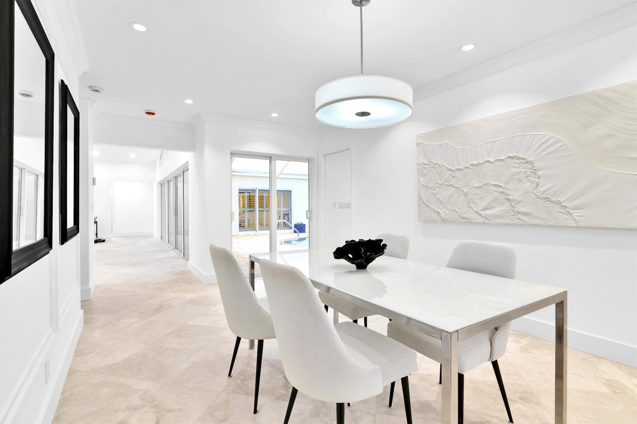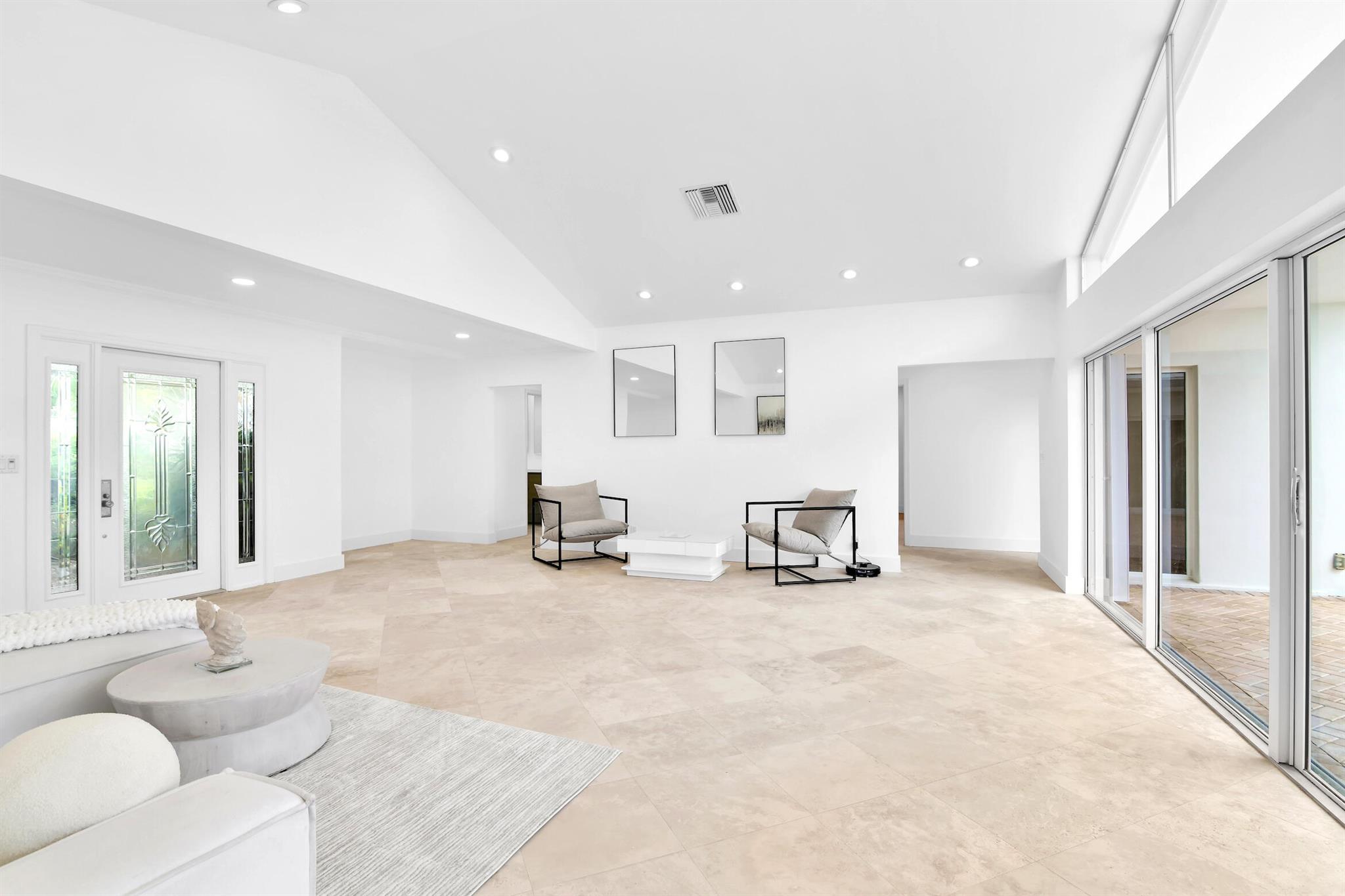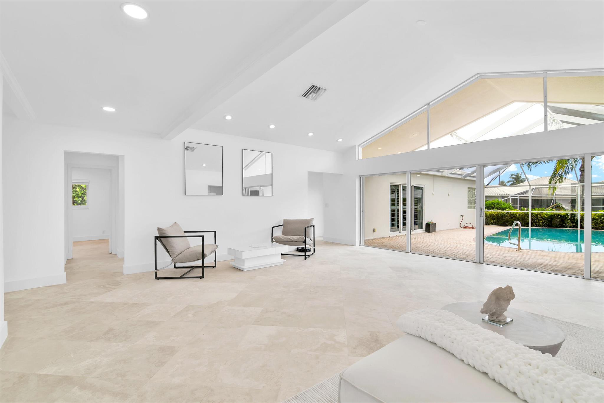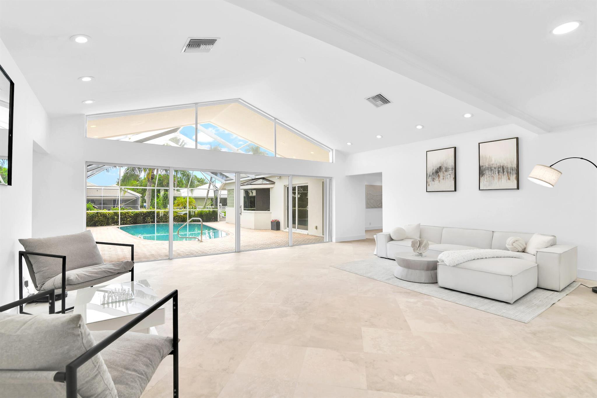 A rare, newly renovated Camino Gardens waterfront residence with 85+/- ft of frontage and ocean access. Features include a new kitchen and baths, sleek marble floors, vaulted-ceiling living room, contemporary chef's kitchen with island and casual dining, plus a versatile office/guest suite/gym. The primary suite offers pool access, a spa bath with freestanding tub, curbless shower, and custom closet. Two guest bedrooms have walk-ins. Outdoor living shines with a screened lanai, saltwater pool, and dock with lift and dual ramps. Additional perks: Wi-Fi irrigation, 2-bay garage with EV charger, and newer roof. Ideally close to Mizner Park, dining, beaches, and A-rated schools.