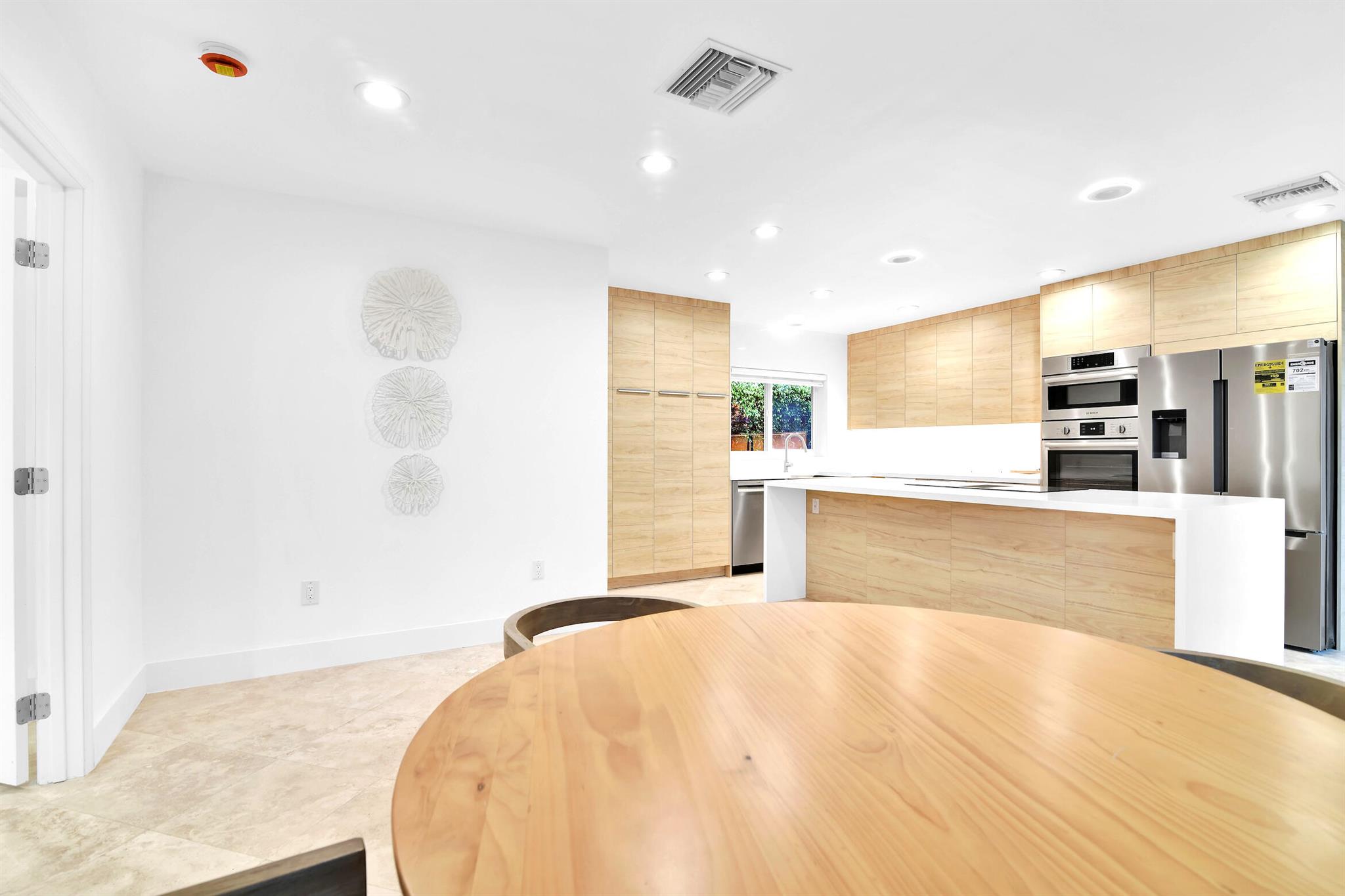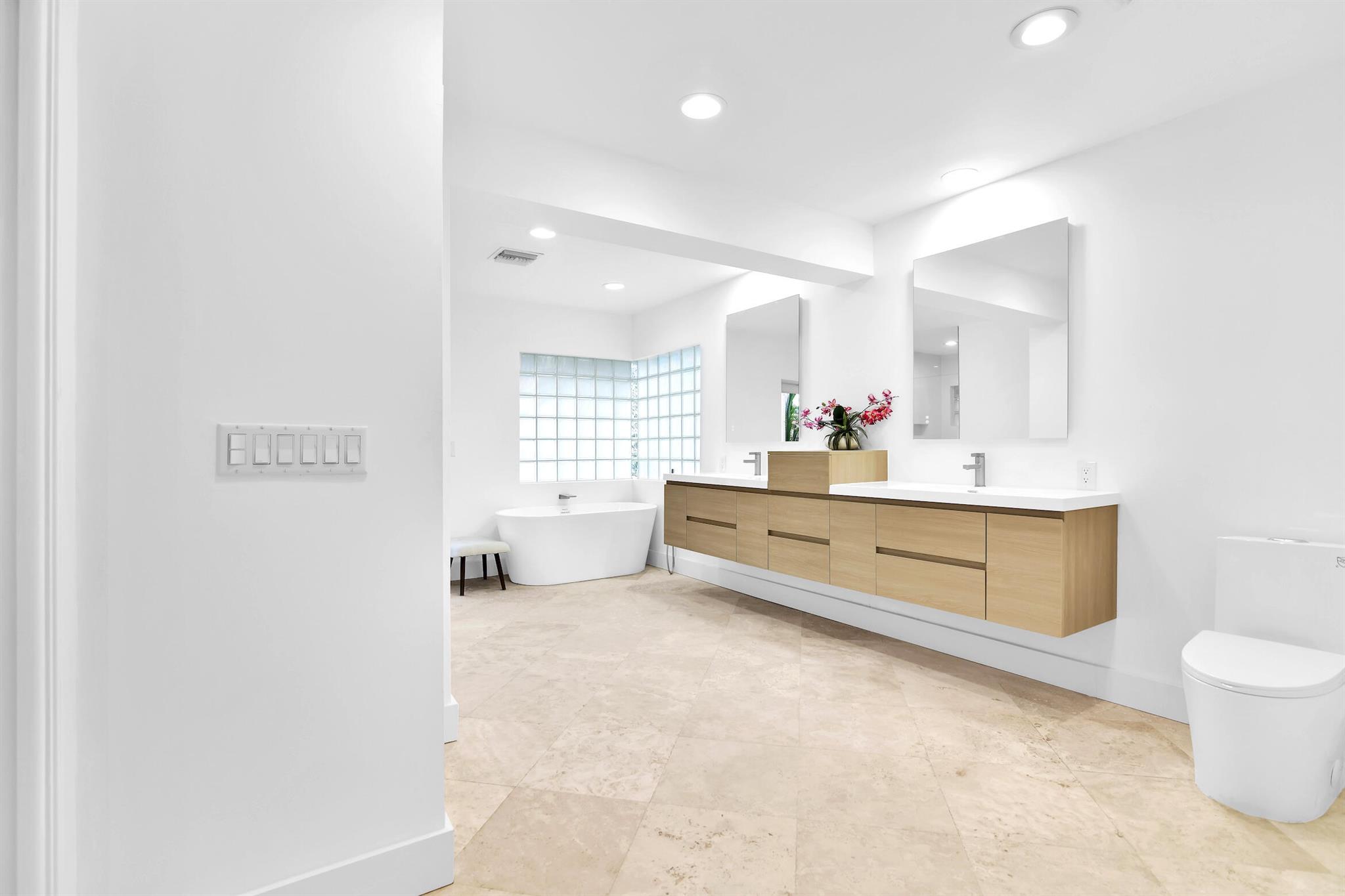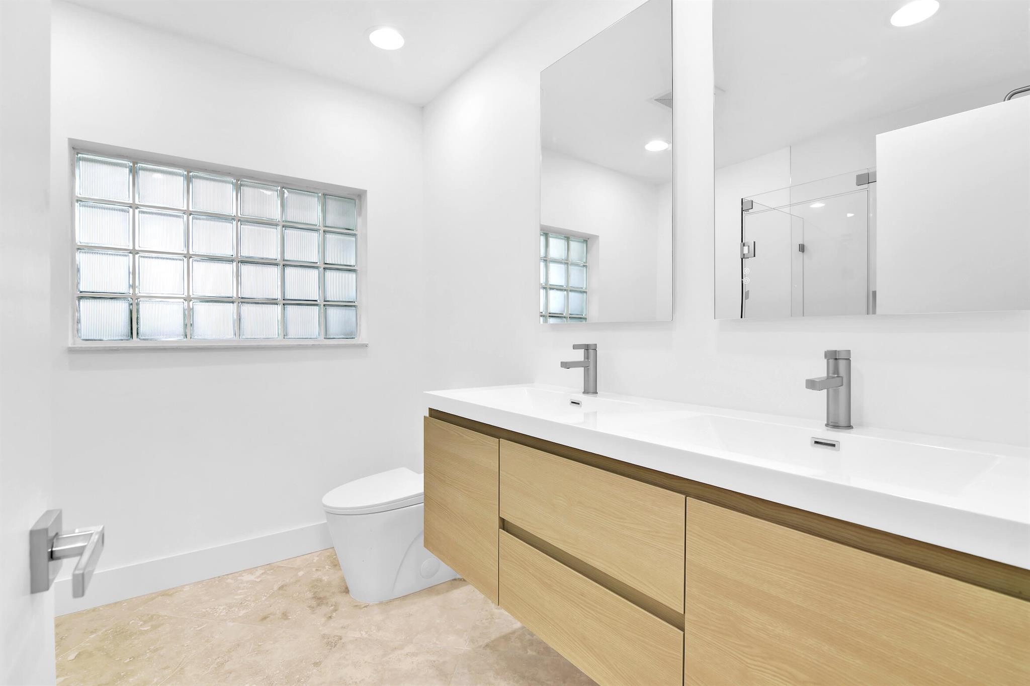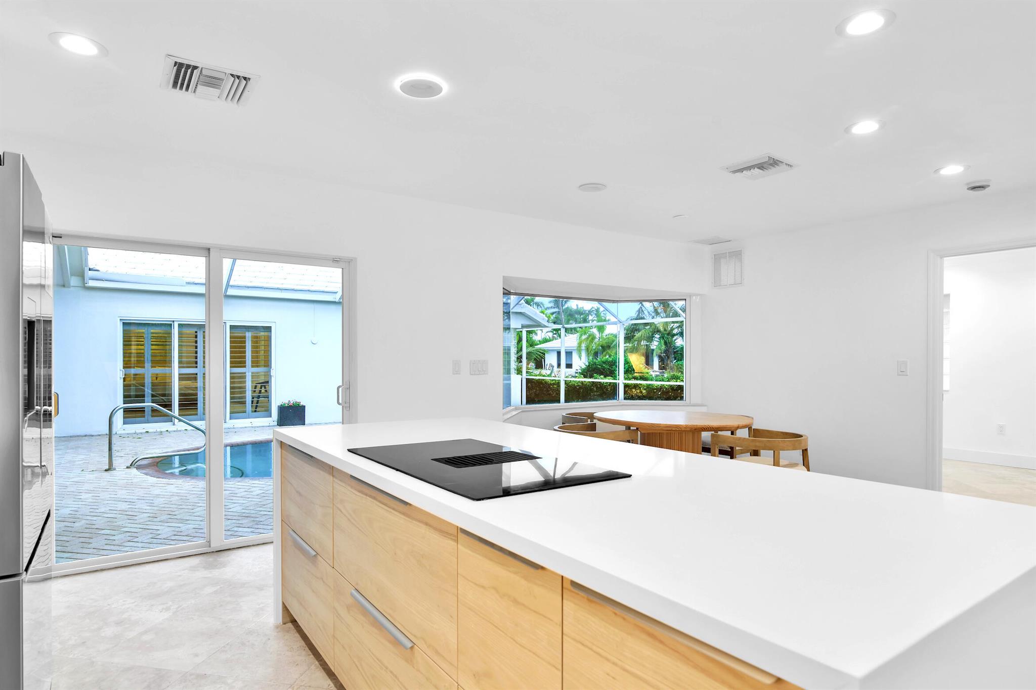 A rare, newly renovated Camino Gardens waterfront residence with 85+/- ft of frontage and ocean access. Features include a new kitchen and baths, sleek marble floors, vaulted-ceiling living room, contemporary chef's kitchen with island and casual dining, plus a versatile office/guest suite/gym. The primary suite offers pool access, a spa bath with freestanding tub, curbless shower, and custom closet. Two guest bedrooms have walk-ins. Outdoor living shines with a screened lanai, saltwater pool, and dock with lift and dual ramps. Additional perks: Wi-Fi irrigation, 2-bay garage with EV charger, and newer roof. Ideally close to Mizner Park, dining, beaches, and A-rated schools.