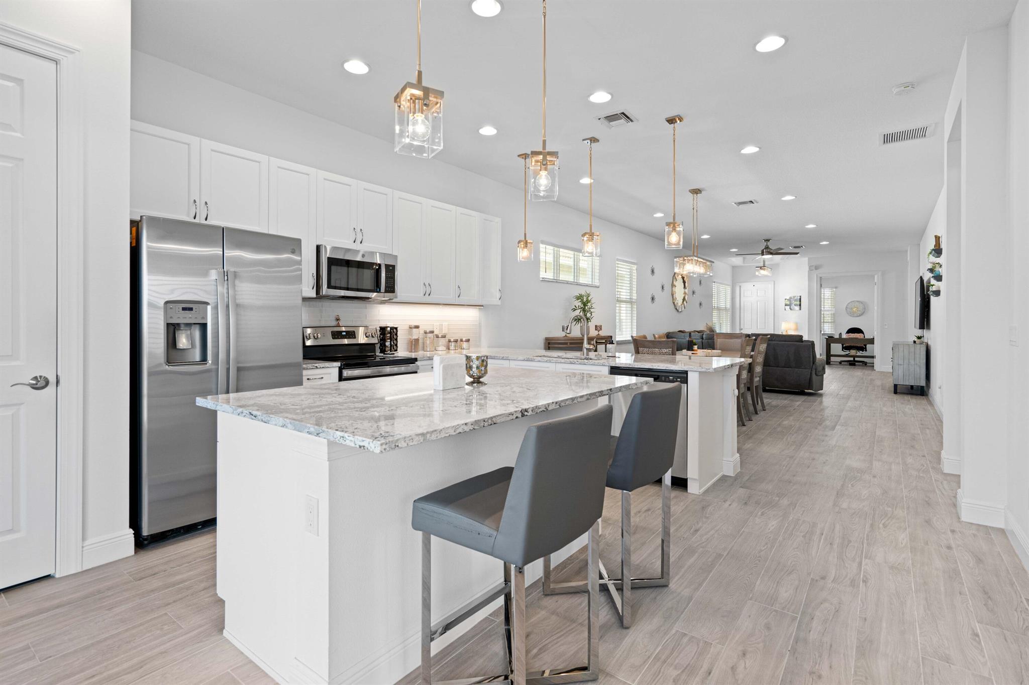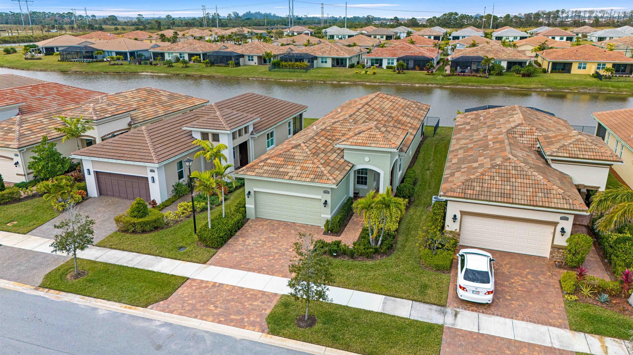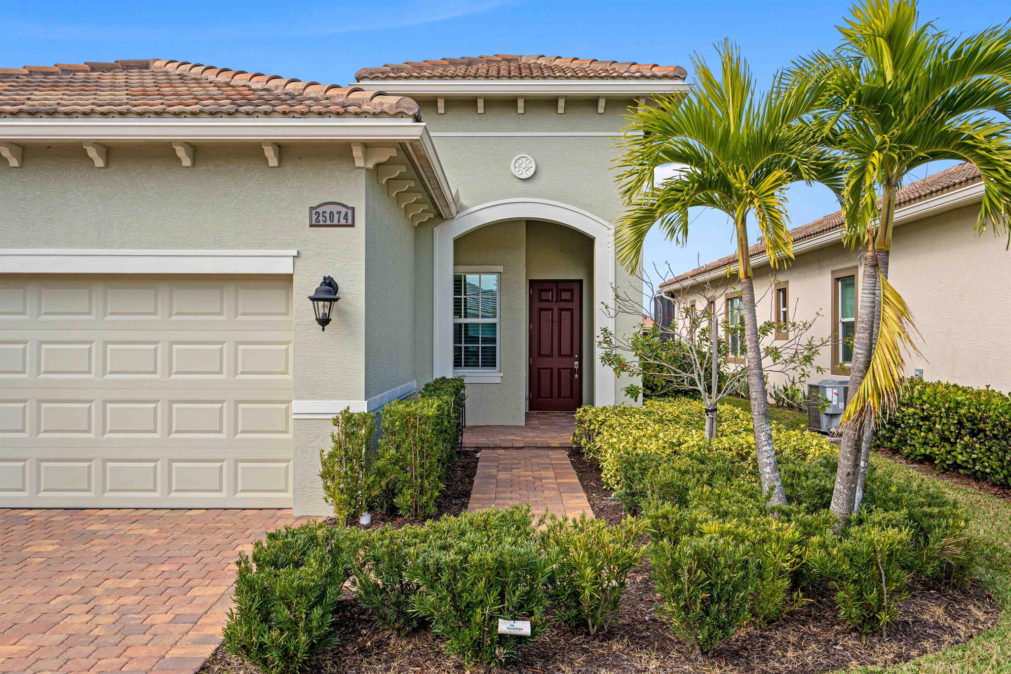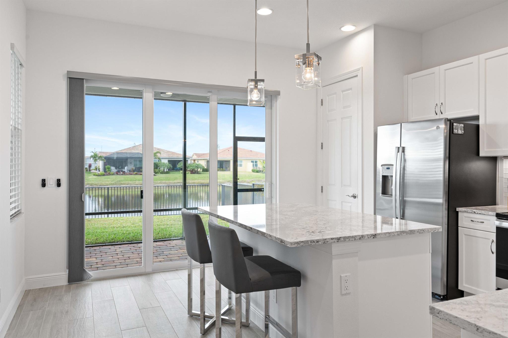 Waterfront 'Casita' Model in Verano PGA Village. Discover lakefront living in this well maintained 2 BR's, 2 BA's, plus large den/office & 2 car garage with epoxy flooring. Laundry room featuring cabinets and utility sink. Built with CBS construction, Barrel tile roof, hurricane impact windows and doors. Volume ceilings & tile in main areas. The open kitchen is a chef's dream, showcasing quartz countertops, a glass backsplash, stainless steel appliances (new refrigerator), 42'' soft-close cabinets, a breakfast bar, island & pantry. The spacious master suite includes a walk-in closet, dual sinks and a seamless glass shower, while the split floor plan ensures privacy. Beautiful Tranquil lake views includes screen enclosed lanai & spacious fenced backyard. ONE YEAR HOME WARRANTY INCLUDED!!
