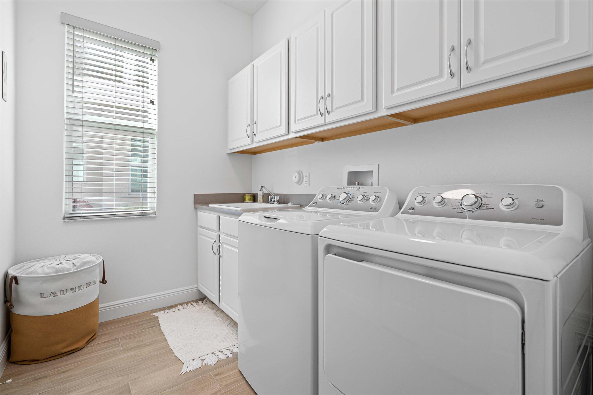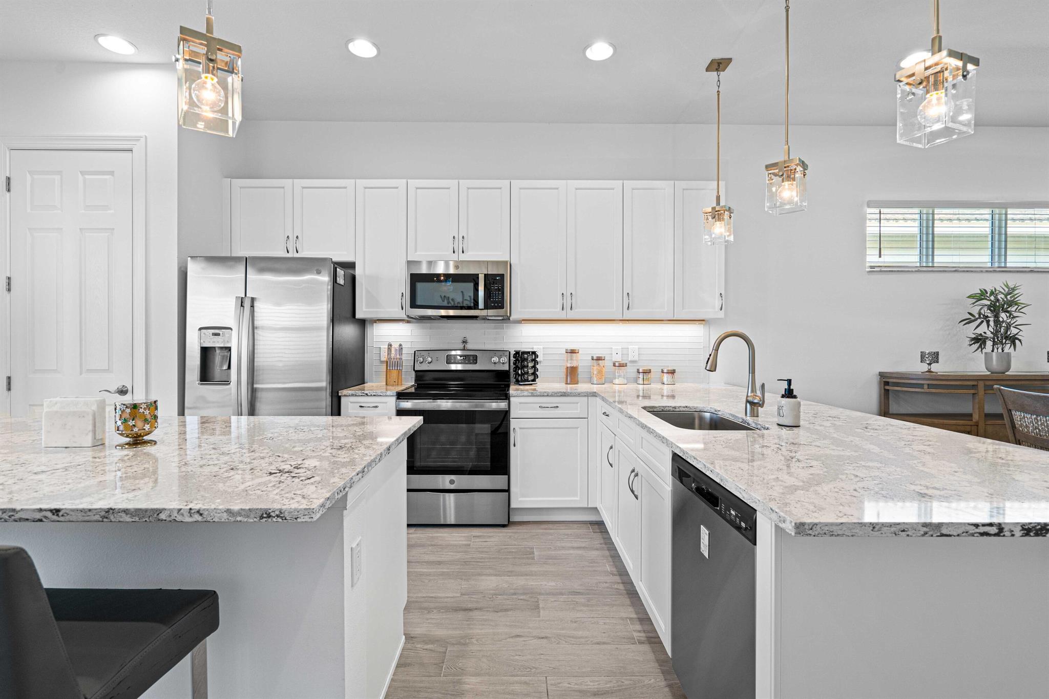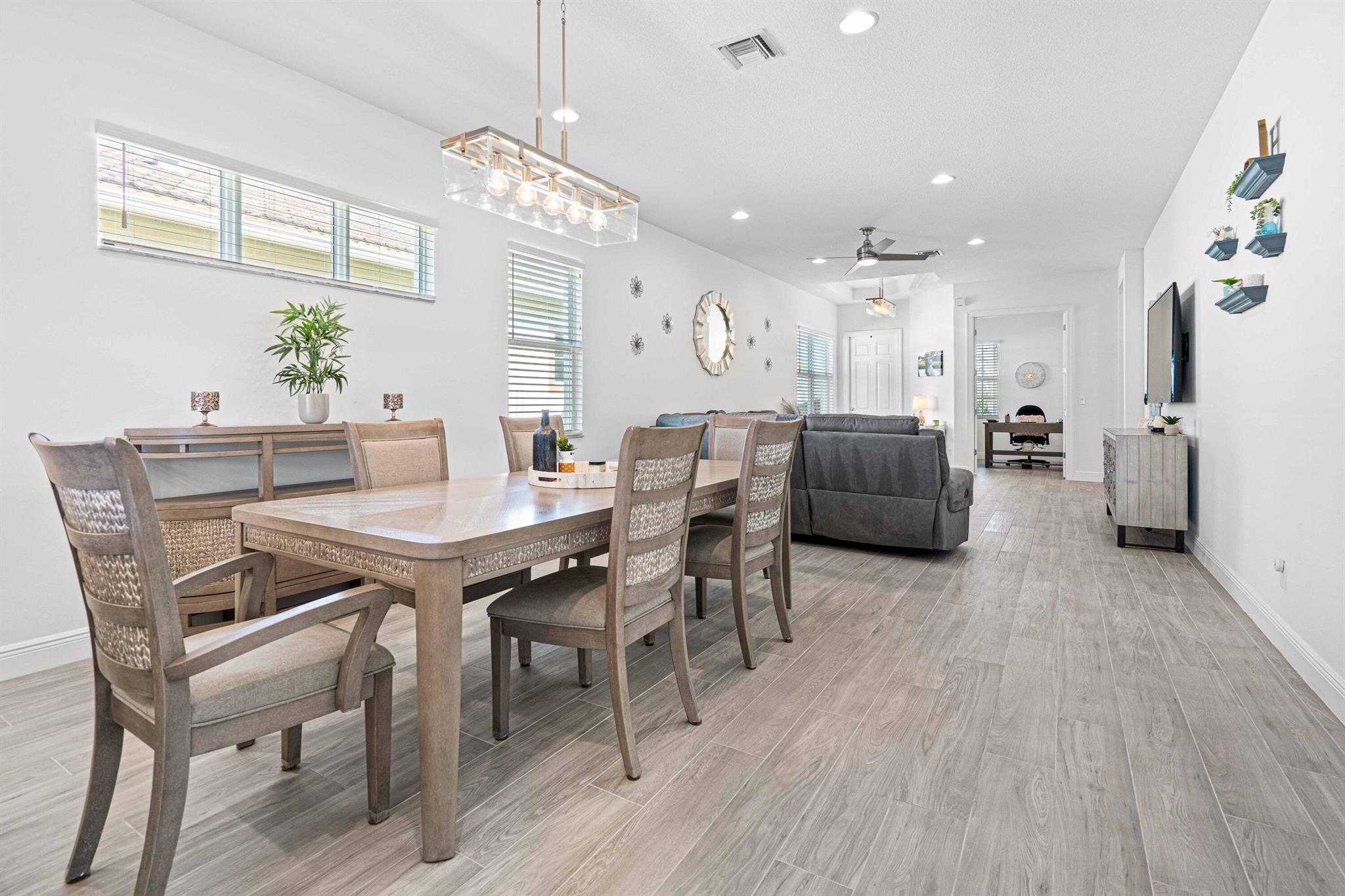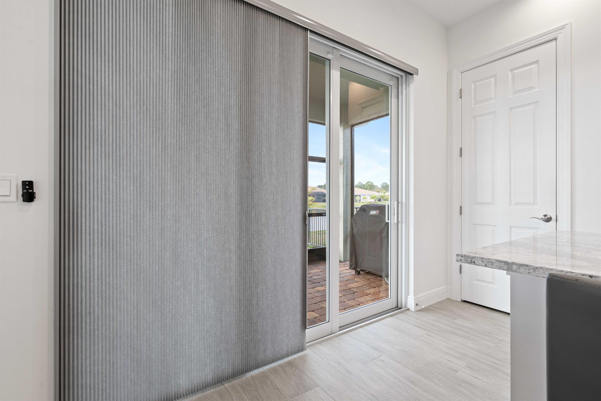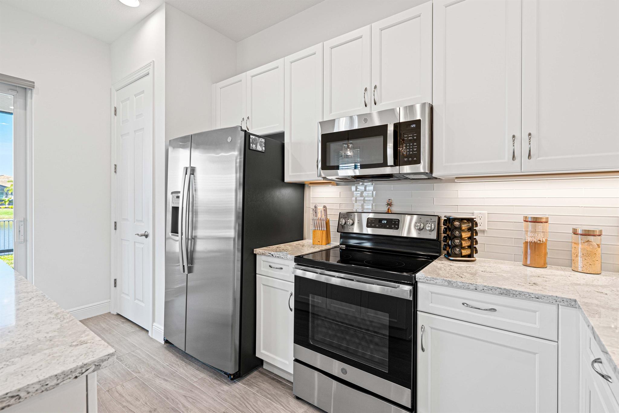 Waterfront 'Casita' Model in Verano PGA Village. Discover lakefront living in this well maintained 2 BR's, 2 BA's, plus large den/office & 2 car garage with epoxy flooring. Laundry room featuring cabinets and utility sink. Built with CBS construction, Barrel tile roof, hurricane impact windows and doors. Volume ceilings & tile in main areas. The open kitchen is a chef's dream, showcasing quartz countertops, a glass backsplash, stainless steel appliances (new refrigerator), 42'' soft-close cabinets, a breakfast bar, island & pantry. The spacious master suite includes a walk-in closet, dual sinks and a seamless glass shower, while the split floor plan ensures privacy. Beautiful Tranquil lake views includes screen enclosed lanai & spacious fenced backyard. ONE YEAR HOME WARRANTY INCLUDED!!