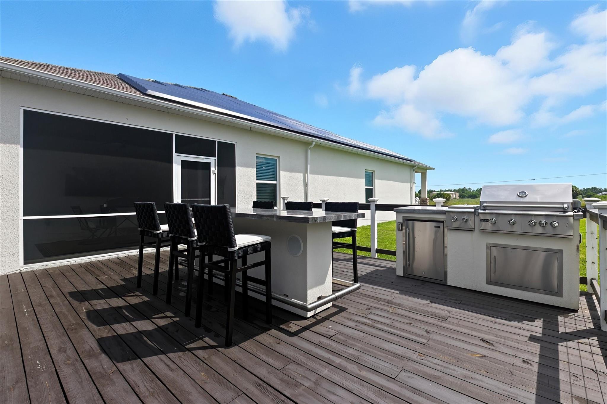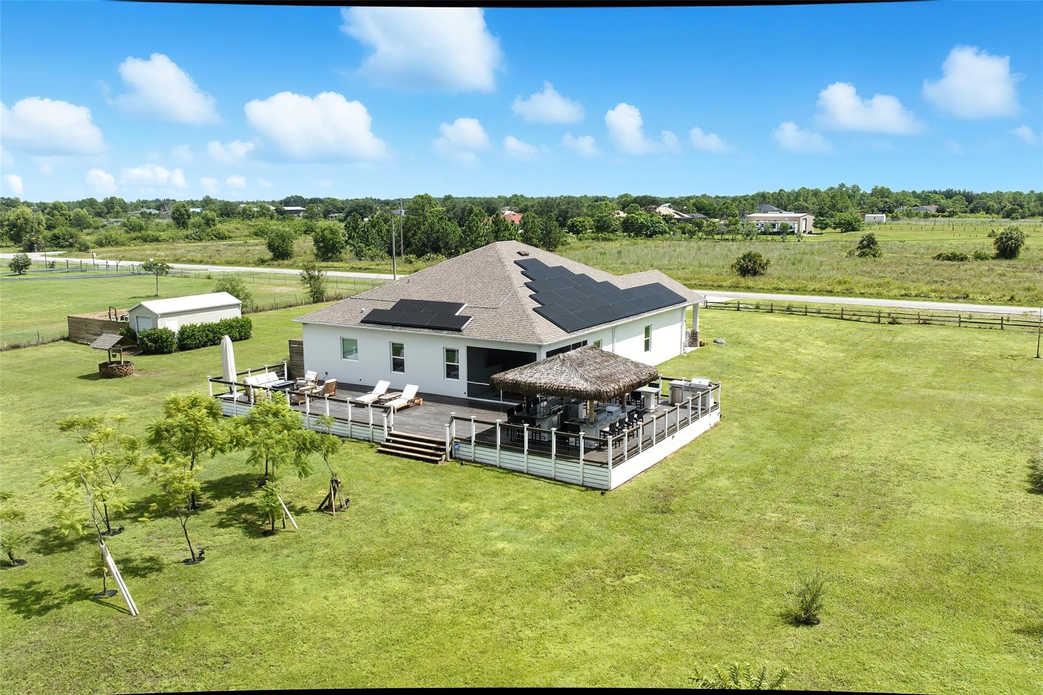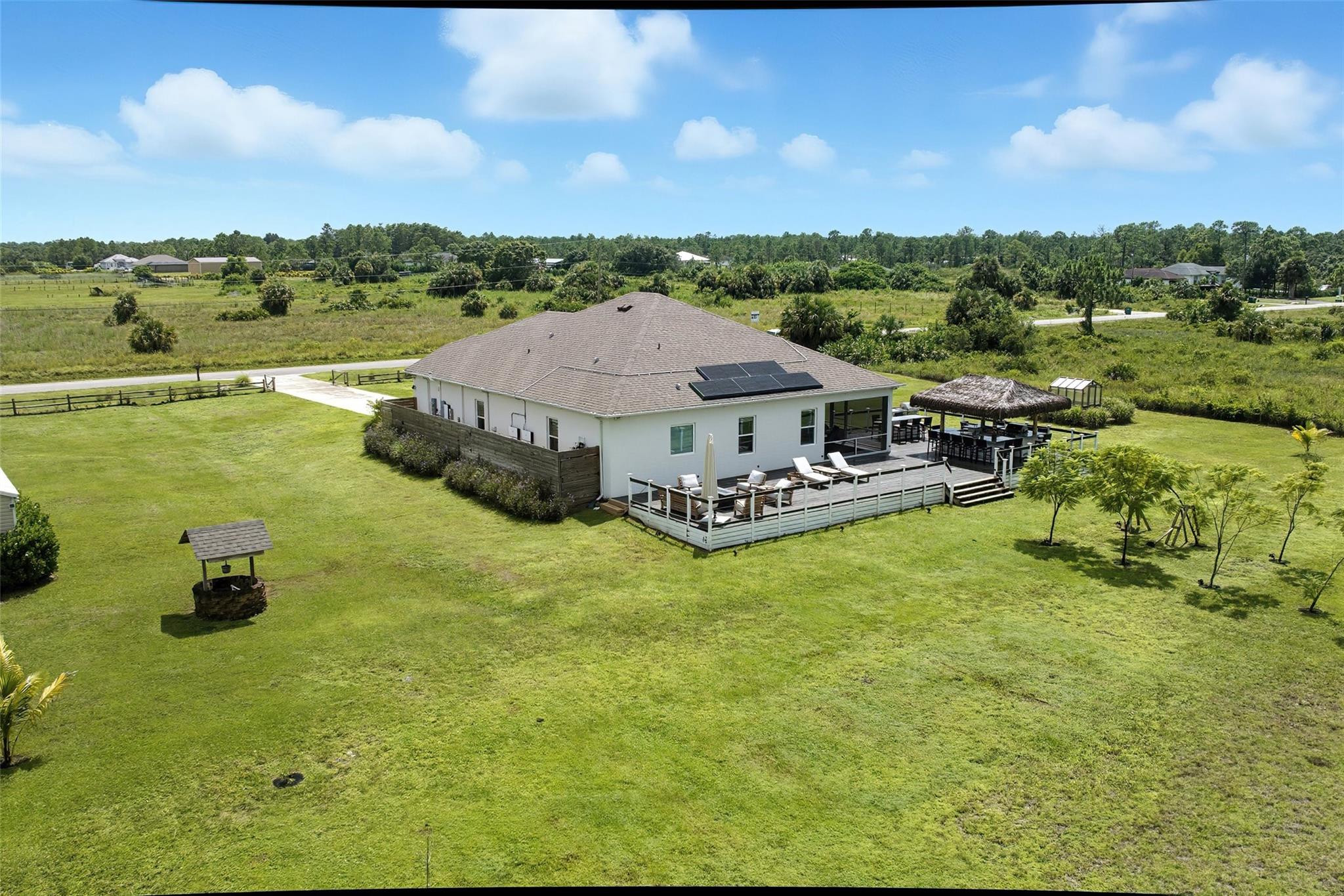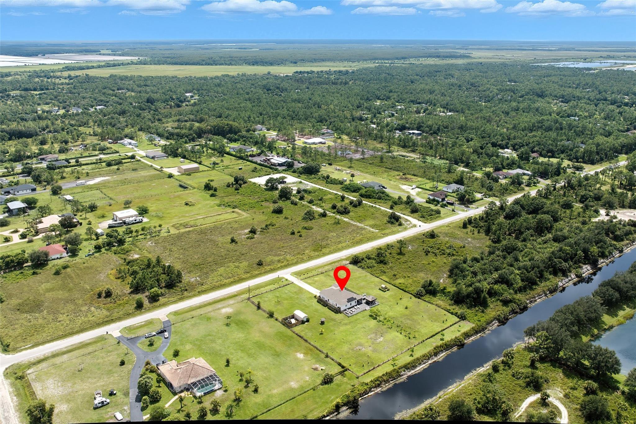 Gorgeous, 3 bed 2 bath + office/den canal front home on over 2 1/4 acres. Impact windows & doors Wood look tile throughout w/ modern farmhouse design. Kitchen boasts designer walk-in pantry & large island w/ storage. Great room has a stunning wood accent wall to match the oven hood in the kitchen. Master bedroom w/ huge walk-in closet w/built ins. Master bathroom has double vanity & walk-in power tub. Enjoy the 1800 sq ft deck w/ bar & outdoor kitchen featuring 2 grills, griddle, 2 mini fridges, wine fridge & two TVs. Organic insect misting system. Full solar power w/ 2 Tesla Power Cell Battery back ups. Aquasana water purifying system. Tankless water heater. Halo in-duct air purifier. Garage has AC split, insulated door & ceiling, storage racks & cabinets. Gigantic shed w/tons of storage.