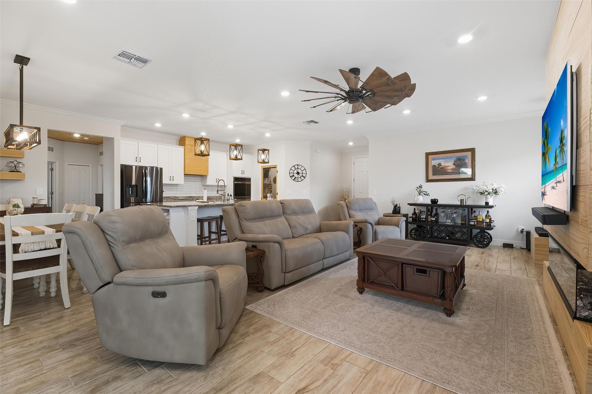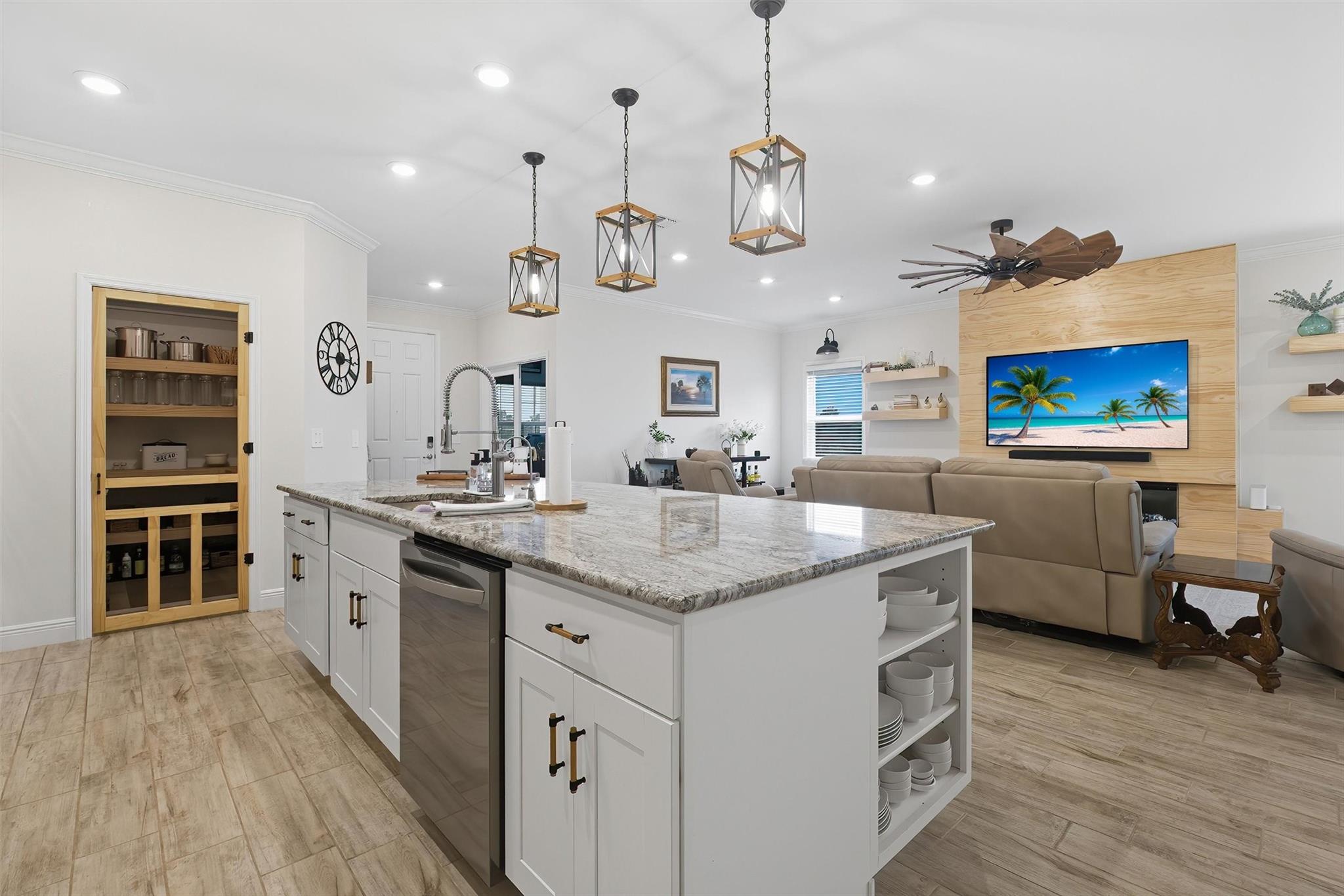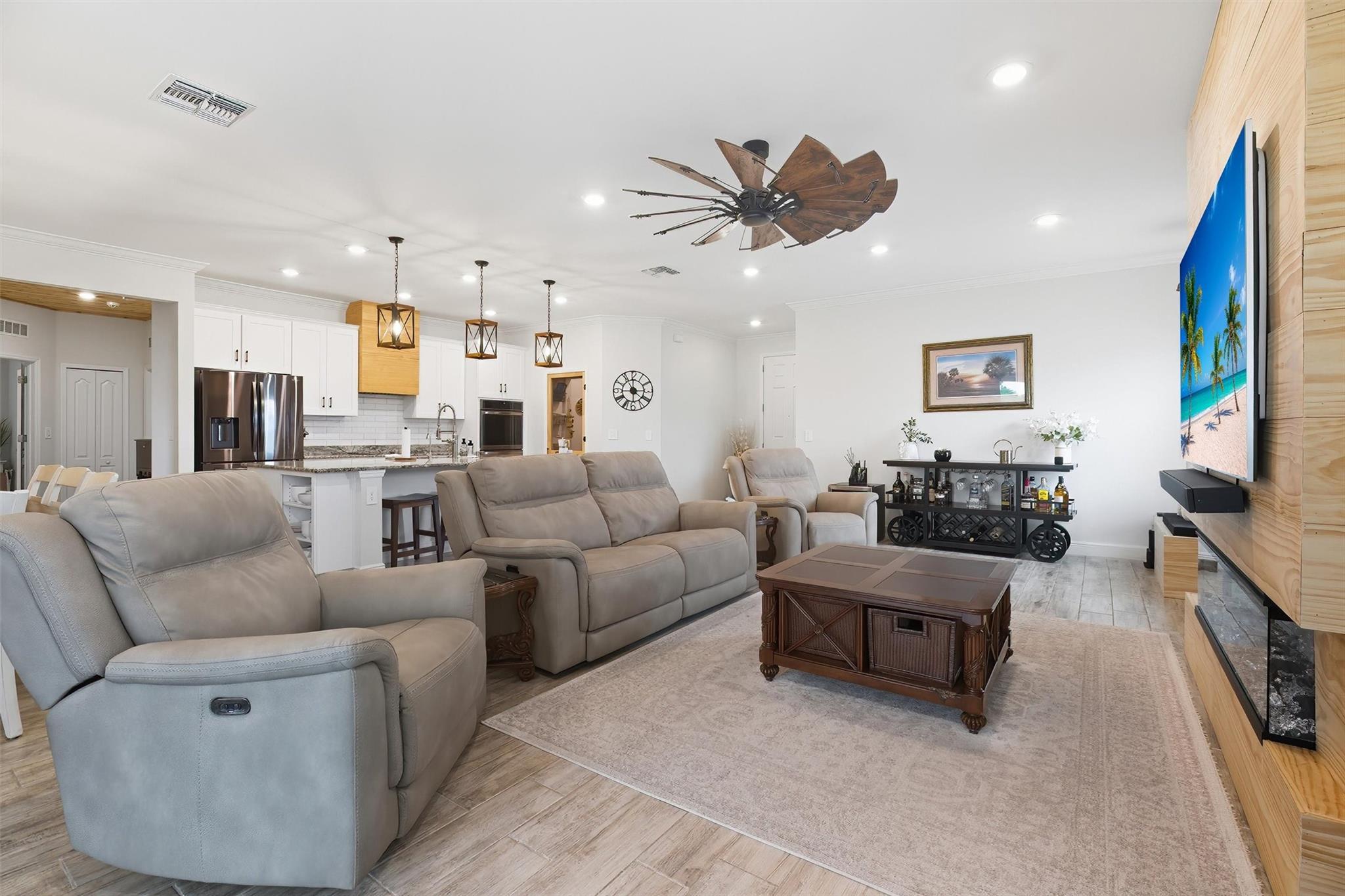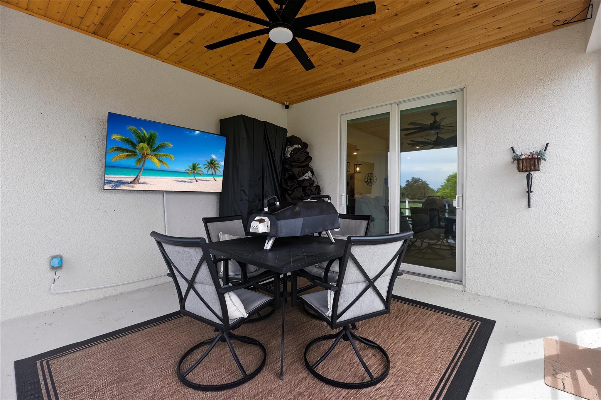 Gorgeous, 3 bed 2 bath + office/den canal front home on over 2 1/4 acres. Impact windows & doors Wood look tile throughout w/ modern farmhouse design. Kitchen boasts designer walk-in pantry & large island w/ storage. Great room has a stunning wood accent wall to match the oven hood in the kitchen. Master bedroom w/ huge walk-in closet w/built ins. Master bathroom has double vanity & walk-in power tub. Enjoy the 1800 sq ft deck w/ bar & outdoor kitchen featuring 2 grills, griddle, 2 mini fridges, wine fridge & two TVs. Organic insect misting system. Full solar power w/ 2 Tesla Power Cell Battery back ups. Aquasana water purifying system. Tankless water heater. Halo in-duct air purifier. Garage has AC split, insulated door & ceiling, storage racks & cabinets. Gigantic shed w/tons of storage.