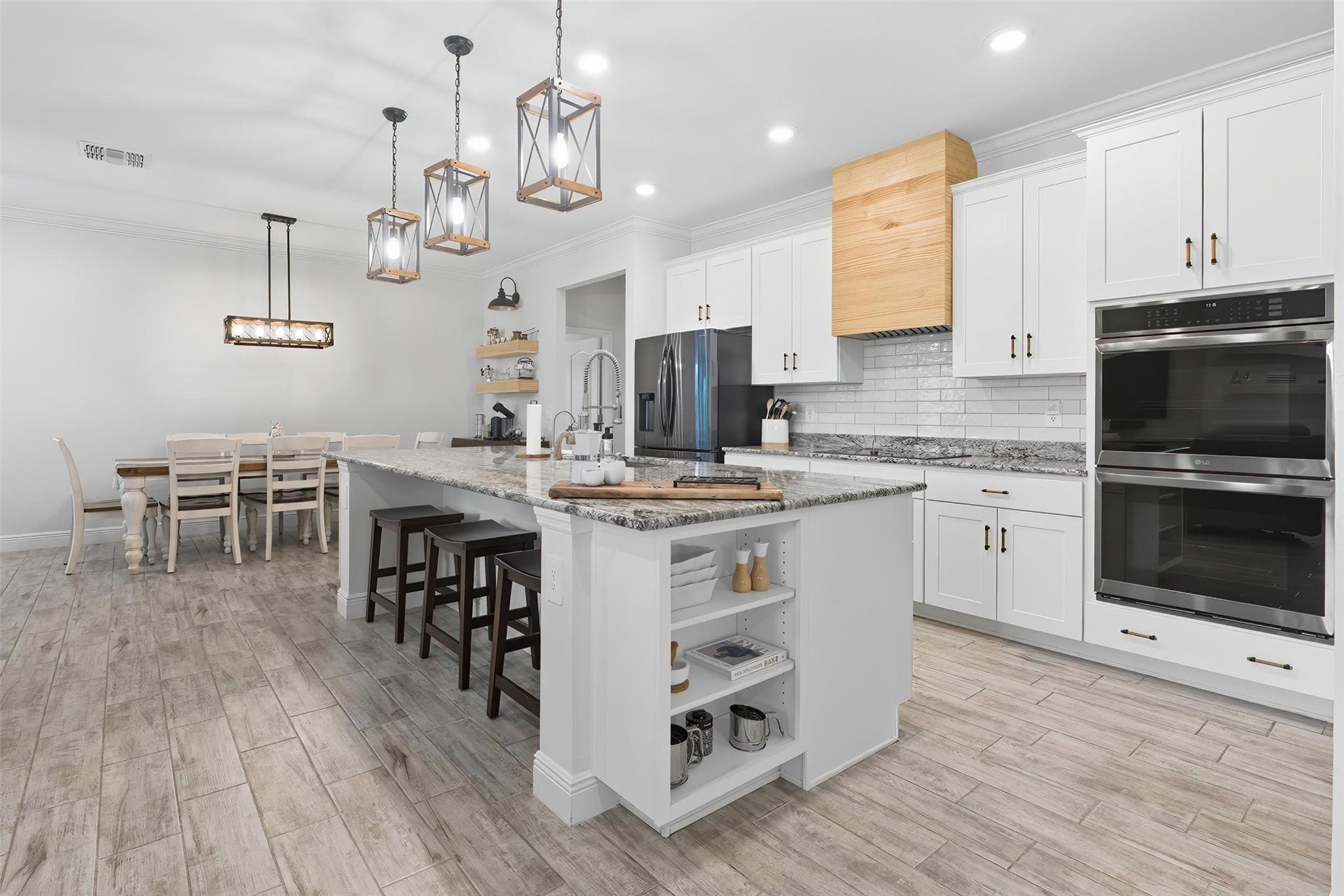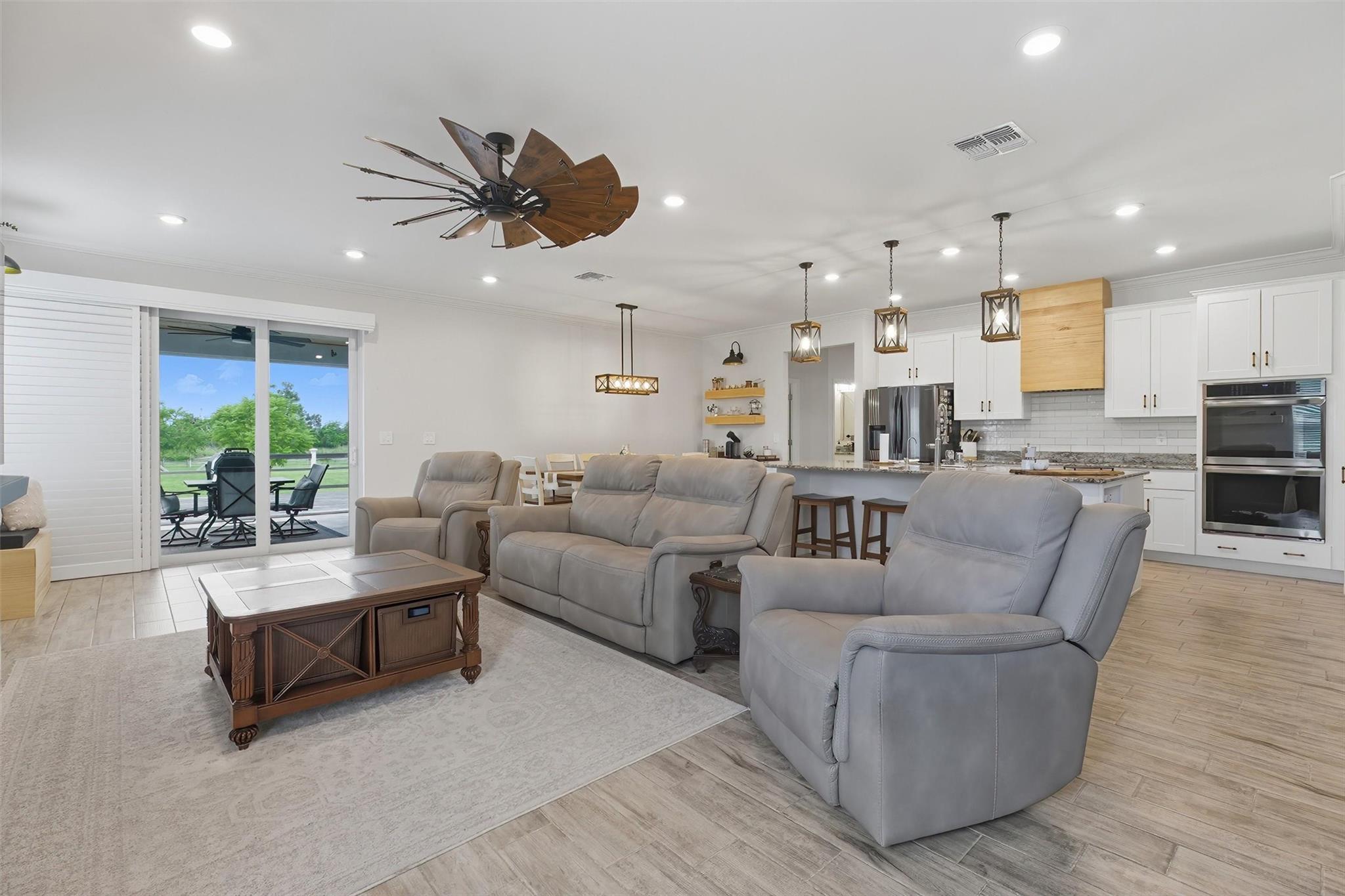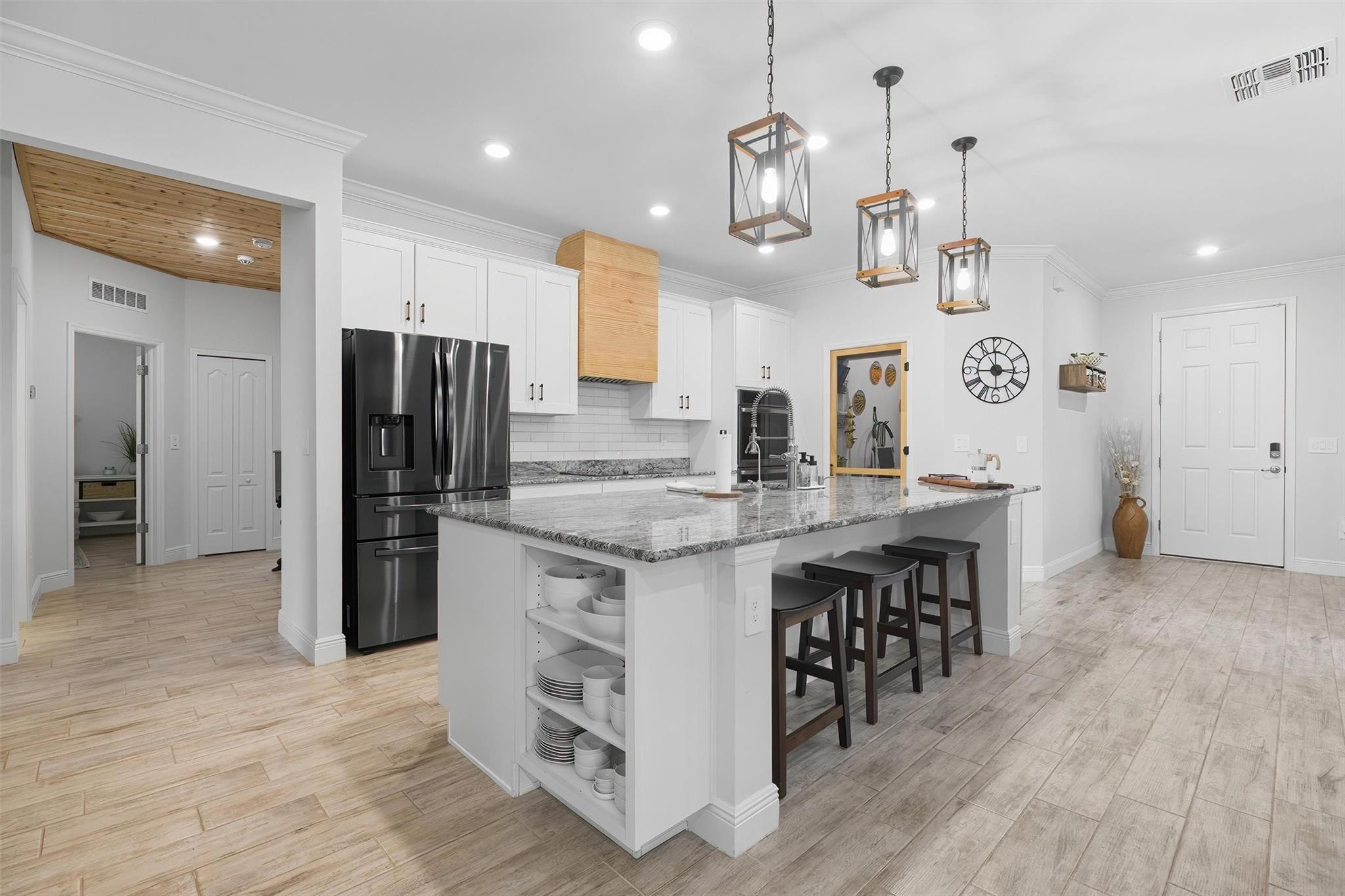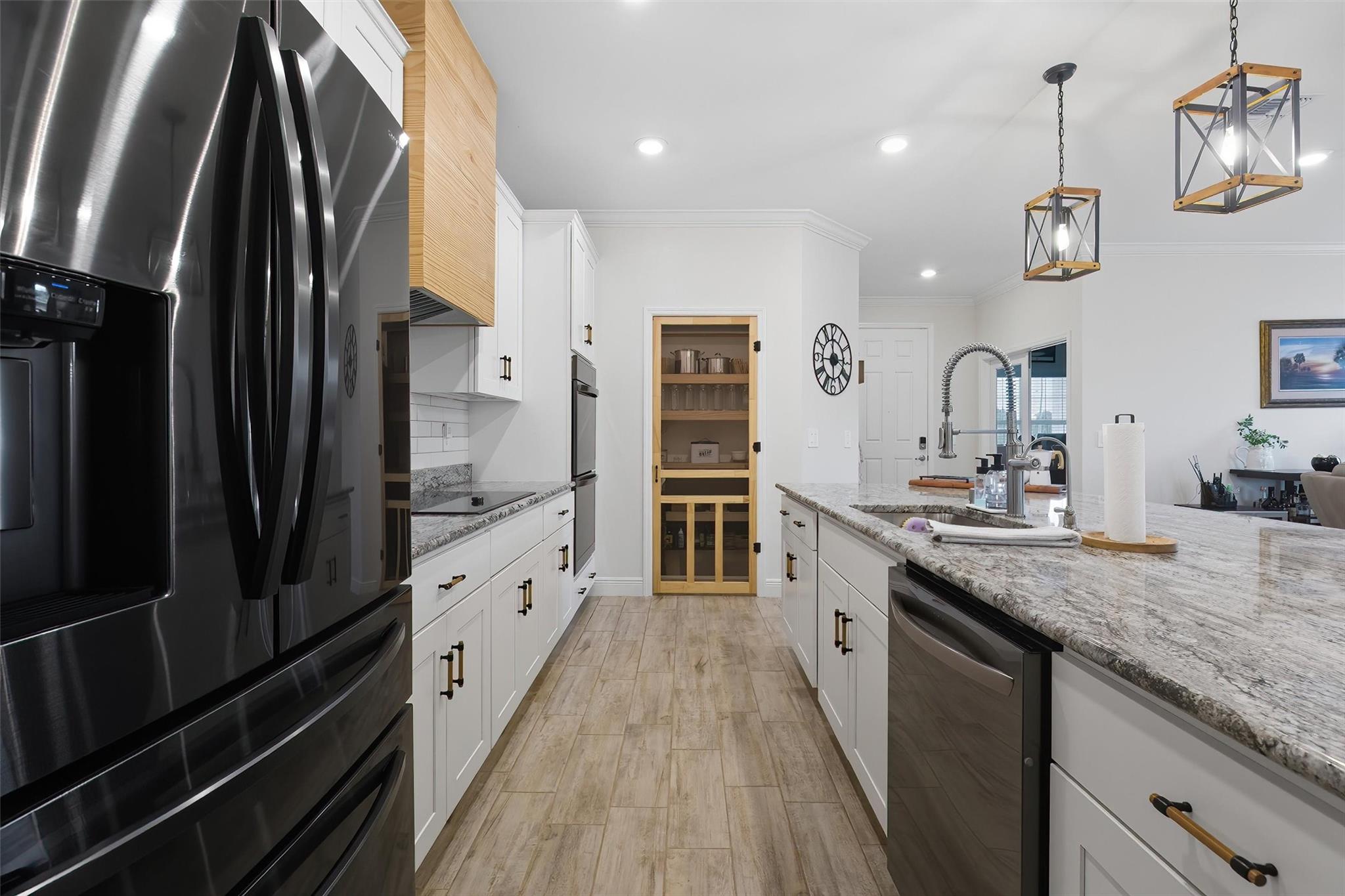 Gorgeous, 3 bed 2 bath + office/den canal front home on over 2 1/4 acres. Impact windows & doors Wood look tile throughout w/ modern farmhouse design. Kitchen boasts designer walk-in pantry & large island w/ storage. Great room has a stunning wood accent wall to match the oven hood in the kitchen. Master bedroom w/ huge walk-in closet w/built ins. Master bathroom has double vanity & walk-in power tub. Enjoy the 1800 sq ft deck w/ bar & outdoor kitchen featuring 2 grills, griddle, 2 mini fridges, wine fridge & two TVs. Organic insect misting system. Full solar power w/ 2 Tesla Power Cell Battery back ups. Aquasana water purifying system. Tankless water heater. Halo in-duct air purifier. Garage has AC split, insulated door & ceiling, storage racks & cabinets. Gigantic shed w/tons of storage.