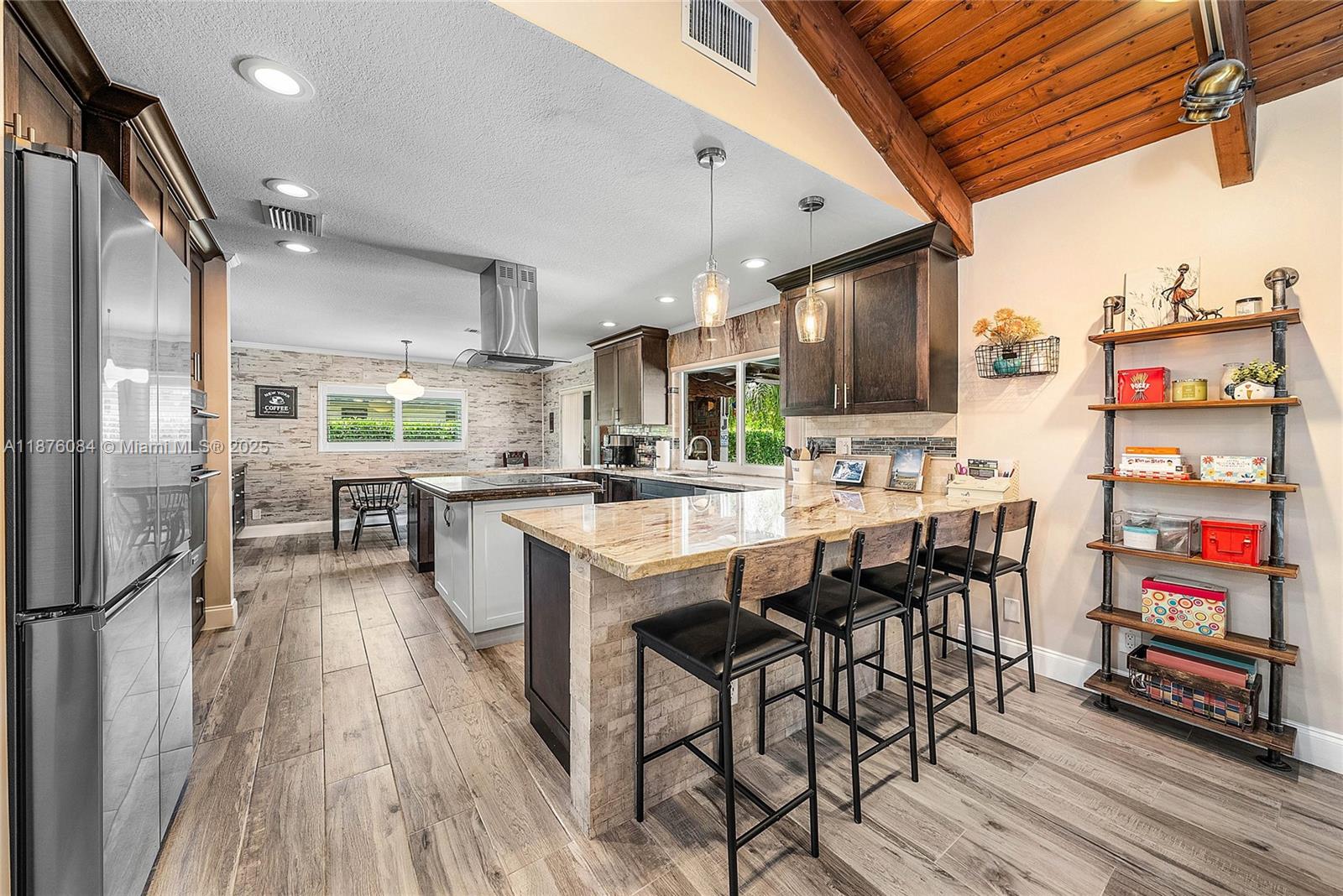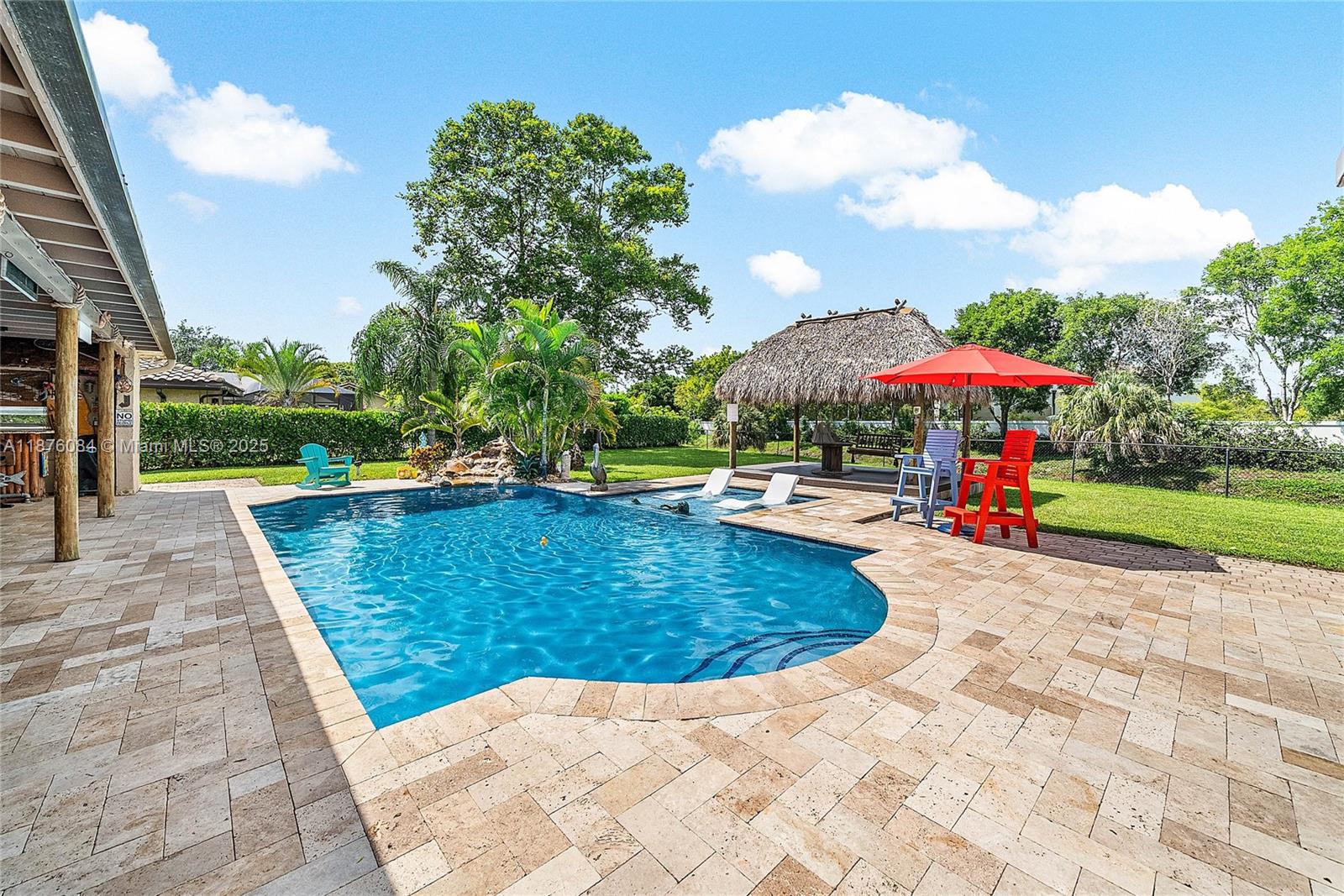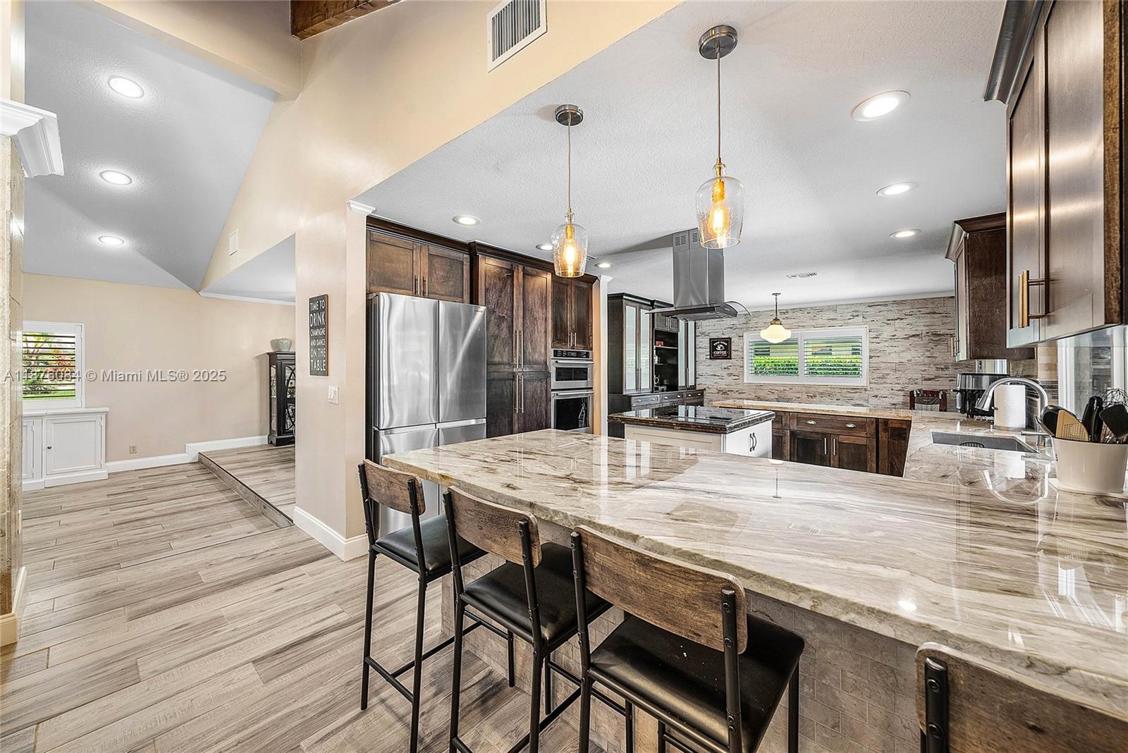 Imagine having everything you ever wished for in a house, and then seeing that house available to you right now. Come up the circular driveway and notice the brickwork, the tile roof, the granite along the front porch, the Euro front door, and you feel like you’re somewhere in the Mediterranean. Inside, the family room features porcelain tile flooring, pitched ceilings, and the grandiose travertine-lined double-sided fireplace as a focal point. Next, arrive in the updated kitchen and nook with well-appointed 42” cabinetry “all the way up”, stainless appliances, and an island with electric cooktop, hood vent and custom triple pencil edge granite. The house features 4 full bedrooms + office, with every detail having been updated! But then, the best part awaits you when you step out back...