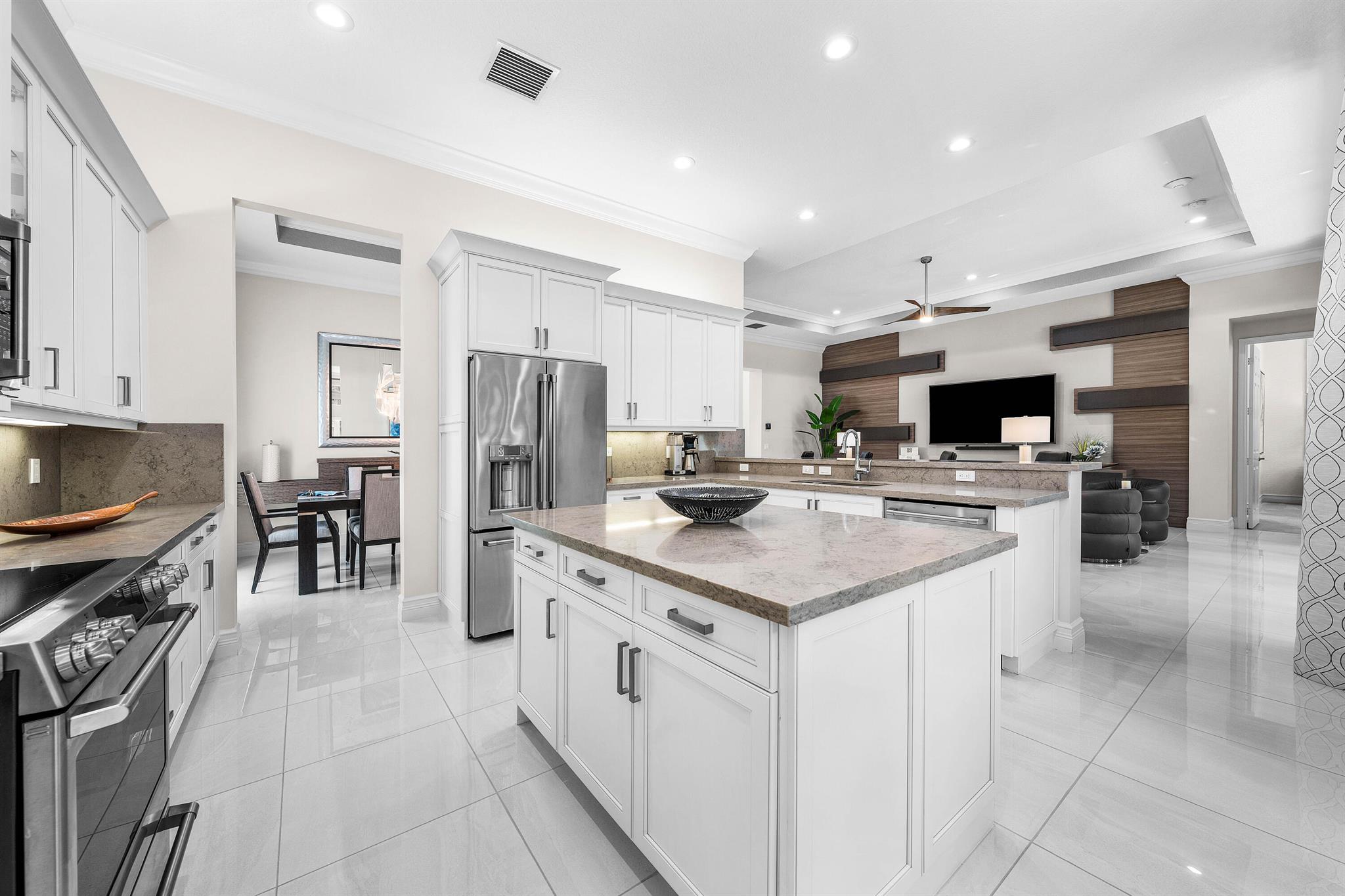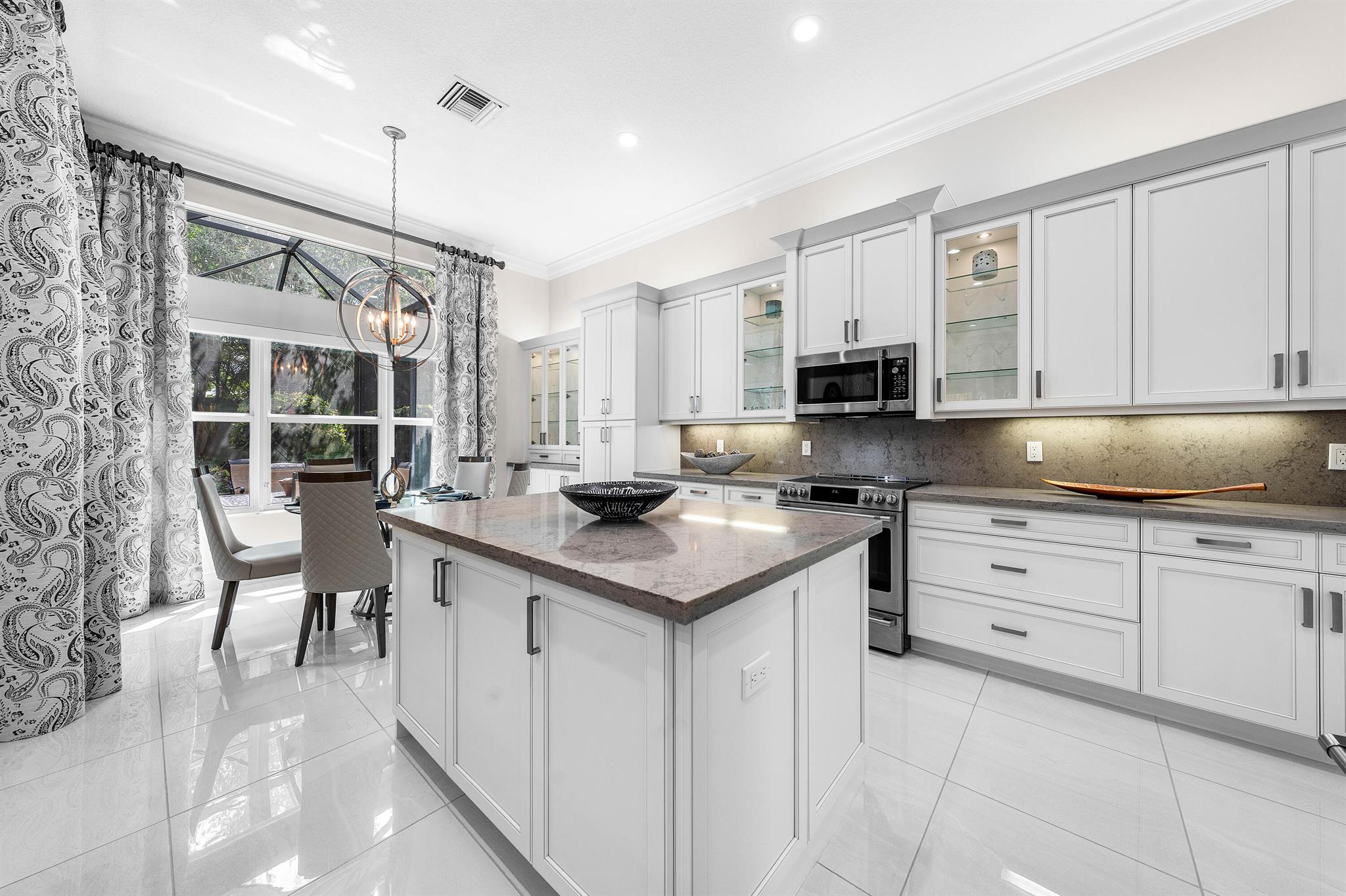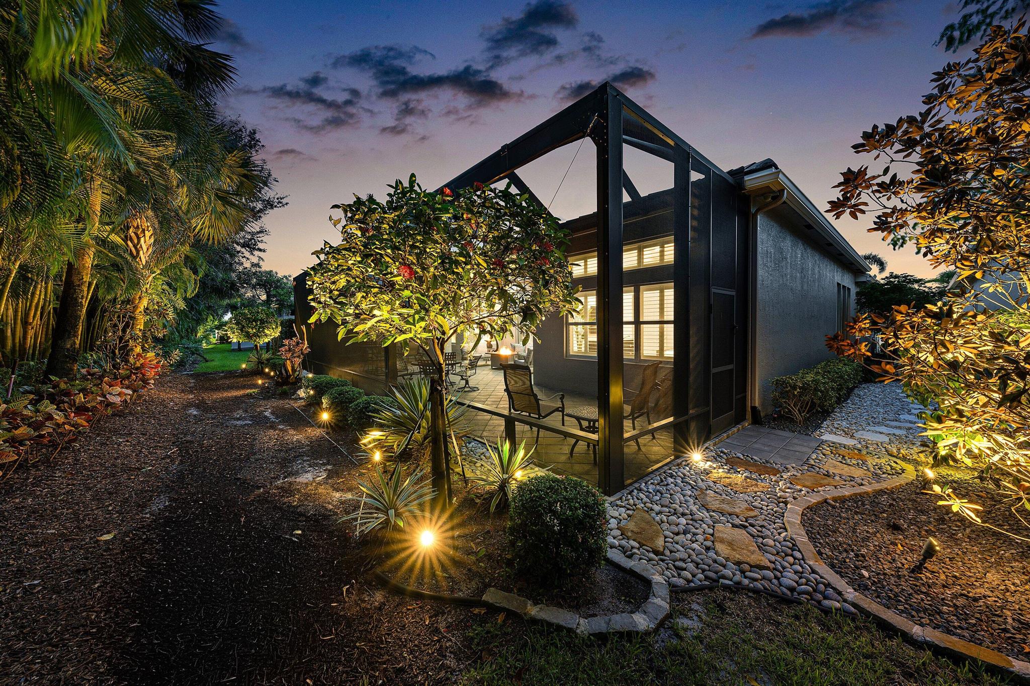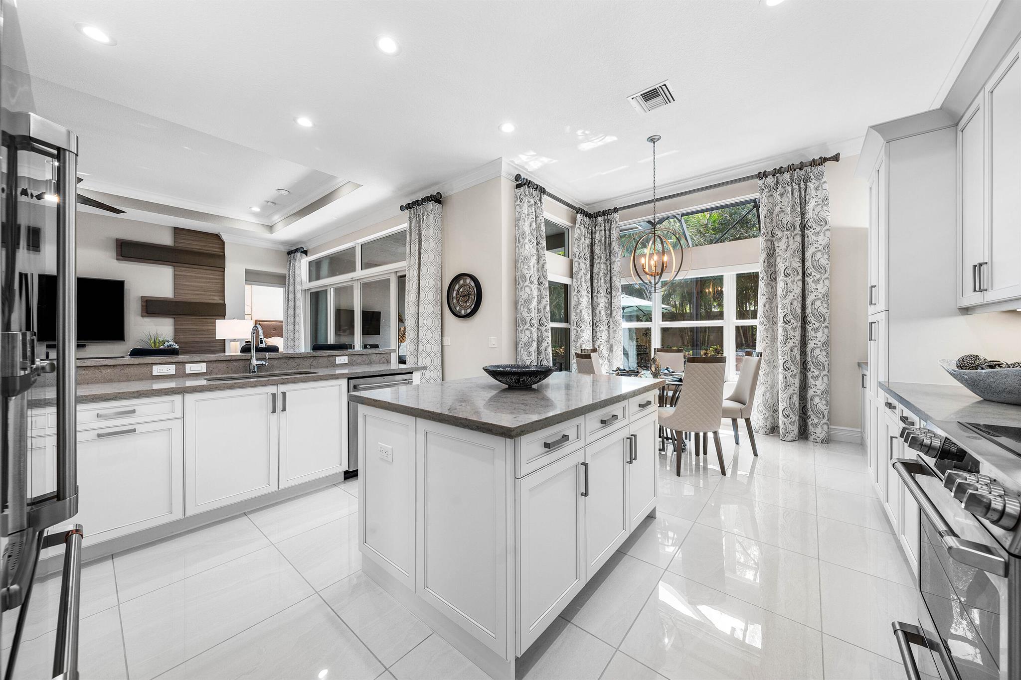 This beautifully appointed Caroline model sits on a lushly landscaped private lot backing south. Great curb appeal - private gate and etched glass double door entry. The home (2/2.1+Club room+3cg) features impact windows, upgraded AC, 24'' porcelain floors, crown moldings, designer wall treatments and wallpapers, designer window treatments and light fixtures, hi-hats, fans, custom built-ins, outfitted closets, upgraded bathrooms and more! The gourmet kitchen has white wood cabinetry, built-in hutch, quartz countertops, center island, snack bar, breakfast nook, GE Cafe appliances including induction cooktop and all the bells and whistles! Luxurious primary suite! You'll love the covered, extended patio, birdcage with picture frame screen and beautiful landscaping with landscape lighting!