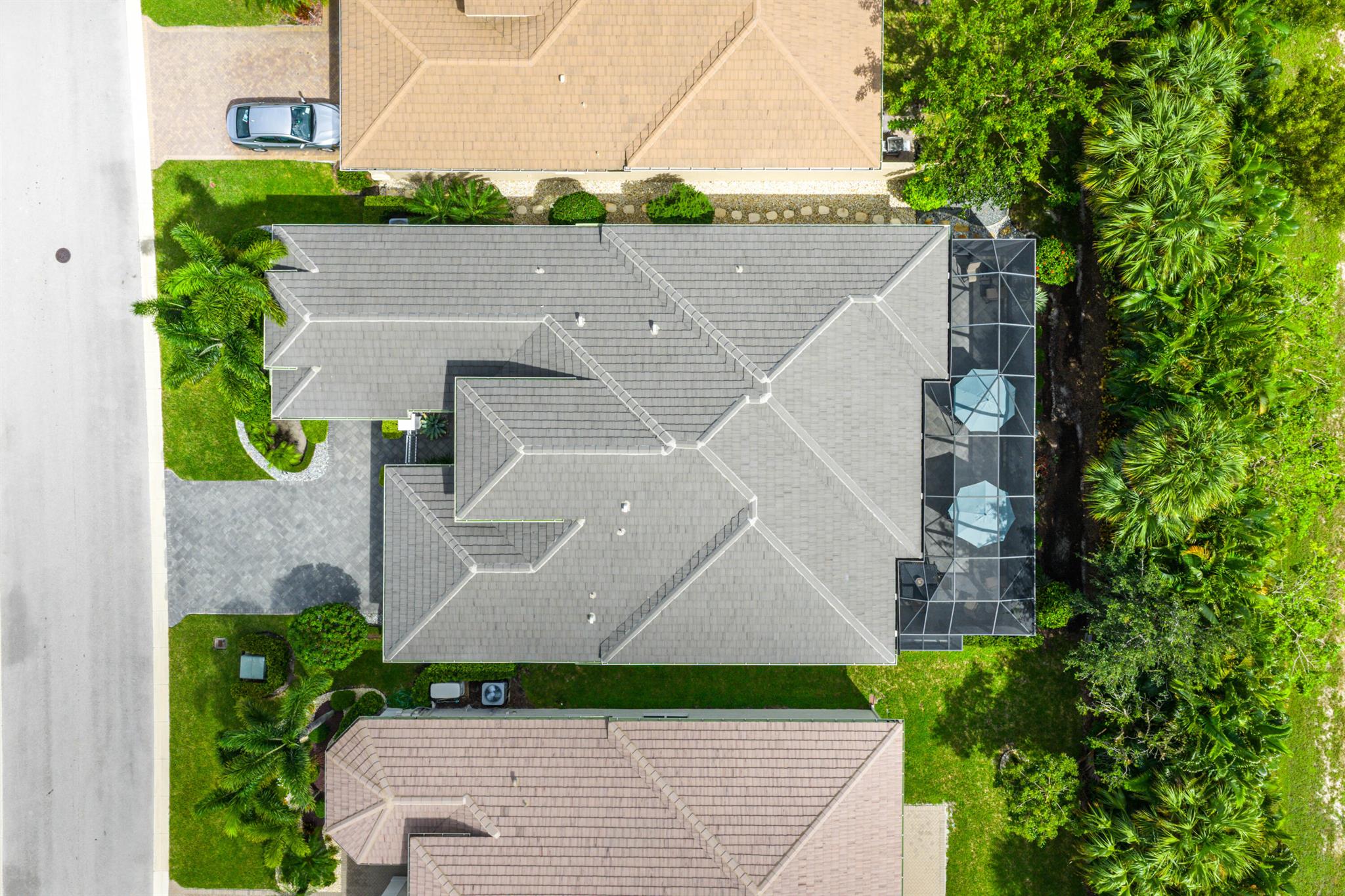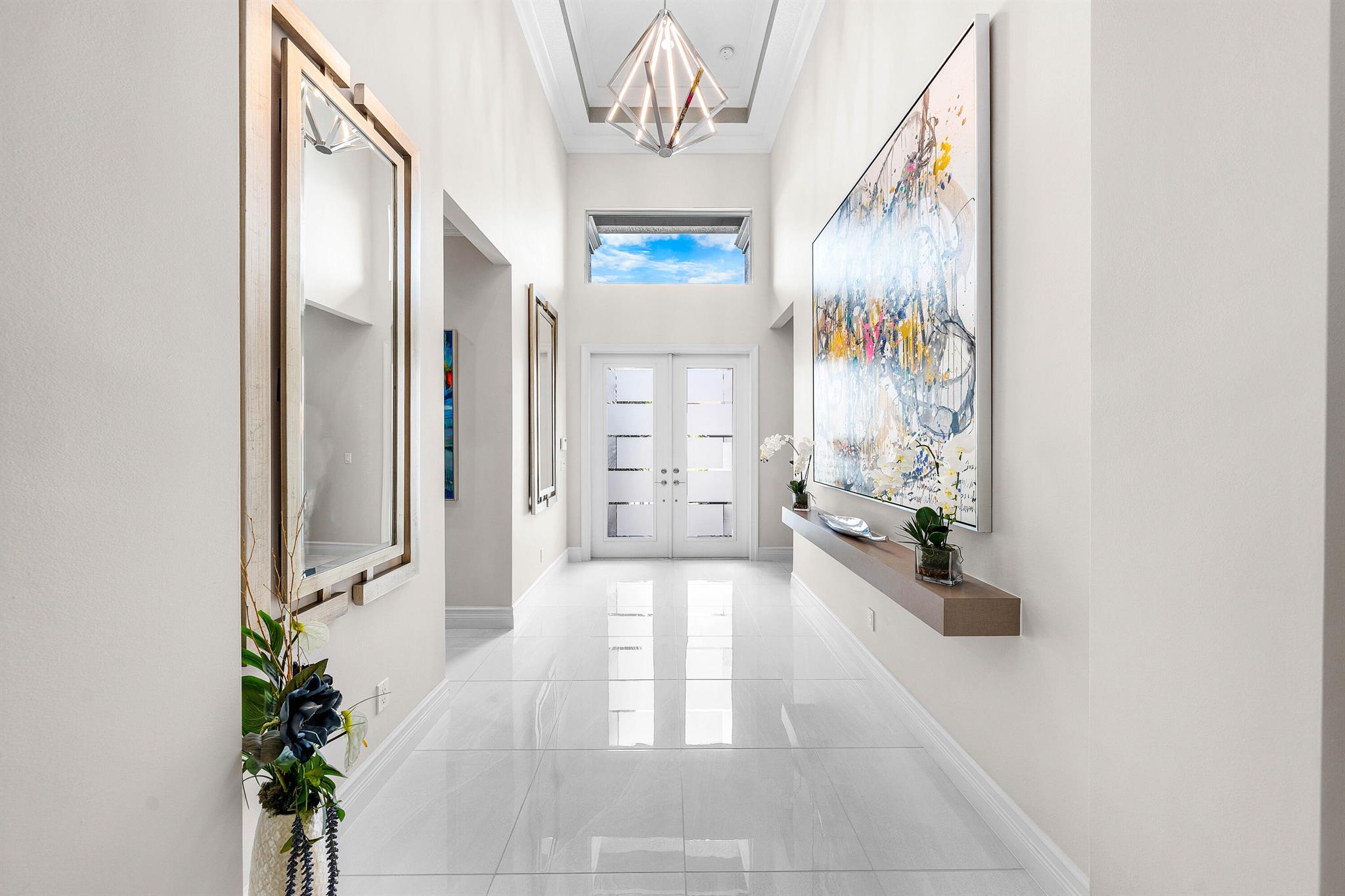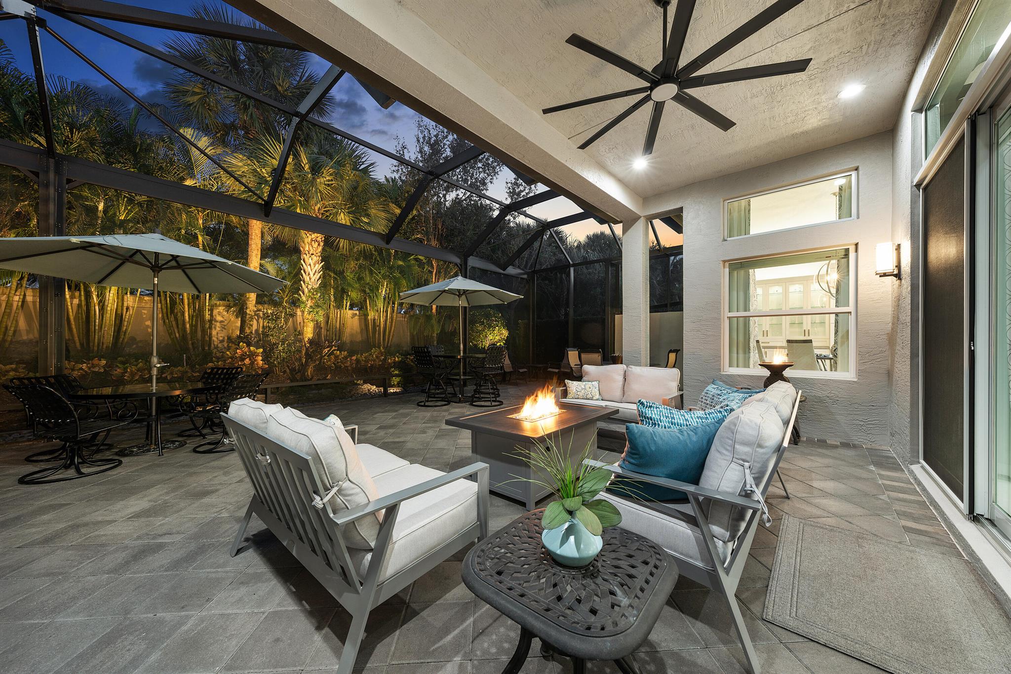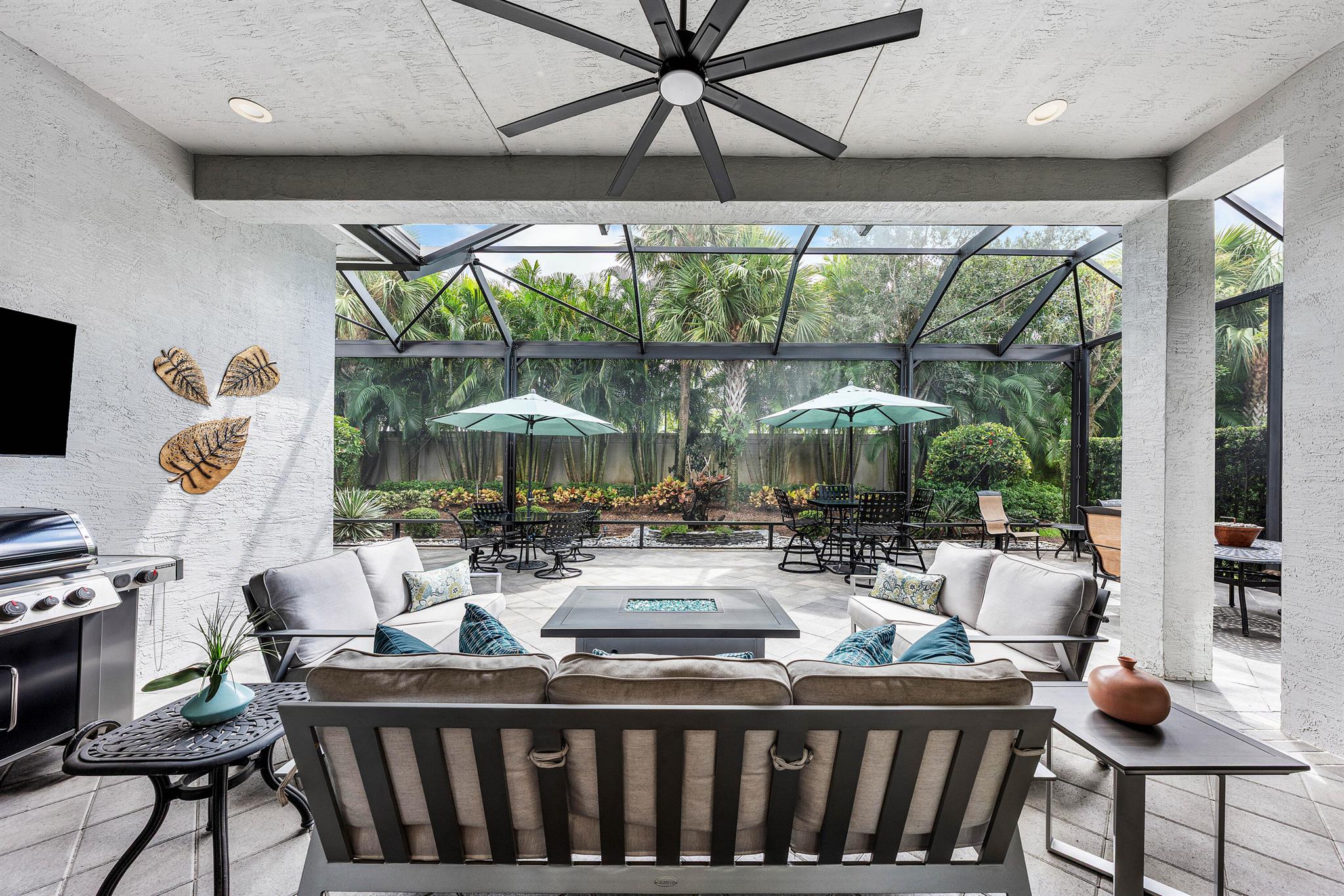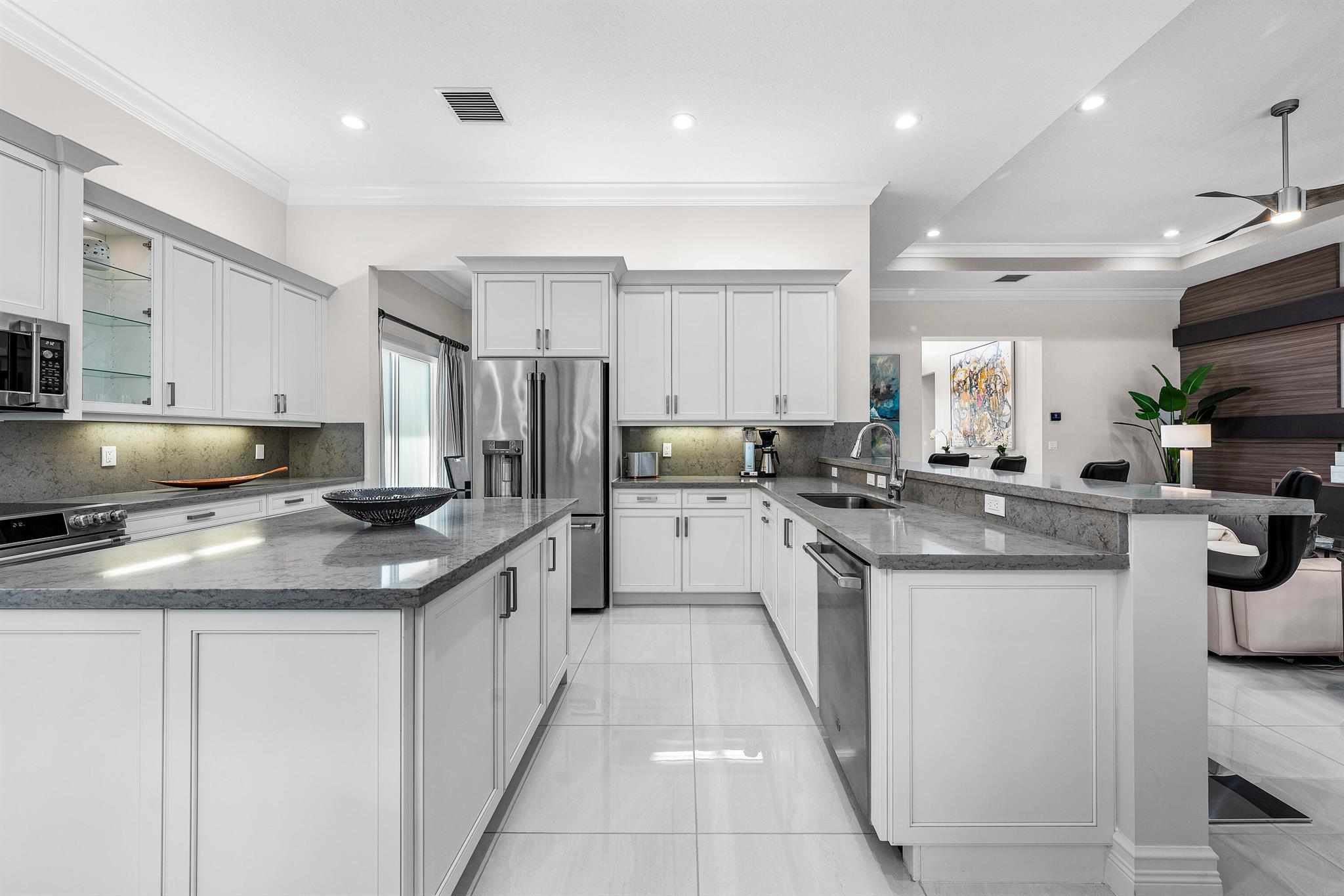 This beautifully appointed Caroline model sits on a lushly landscaped private lot backing south. Great curb appeal - private gate and etched glass double door entry. The home (2/2.1+Club room+3cg) features impact windows, upgraded AC, 24'' porcelain floors, crown moldings, designer wall treatments and wallpapers, designer window treatments and light fixtures, hi-hats, fans, custom built-ins, outfitted closets, upgraded bathrooms and more! The gourmet kitchen has white wood cabinetry, built-in hutch, quartz countertops, center island, snack bar, breakfast nook, GE Cafe appliances including induction cooktop and all the bells and whistles! Luxurious primary suite! You'll love the covered, extended patio, birdcage with picture frame screen and beautiful landscaping with landscape lighting!
