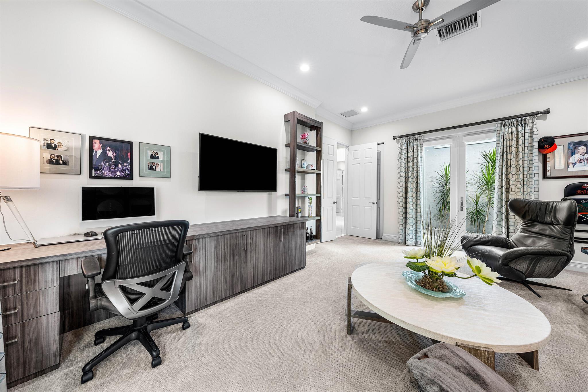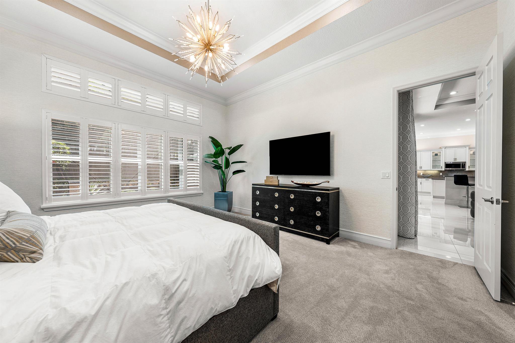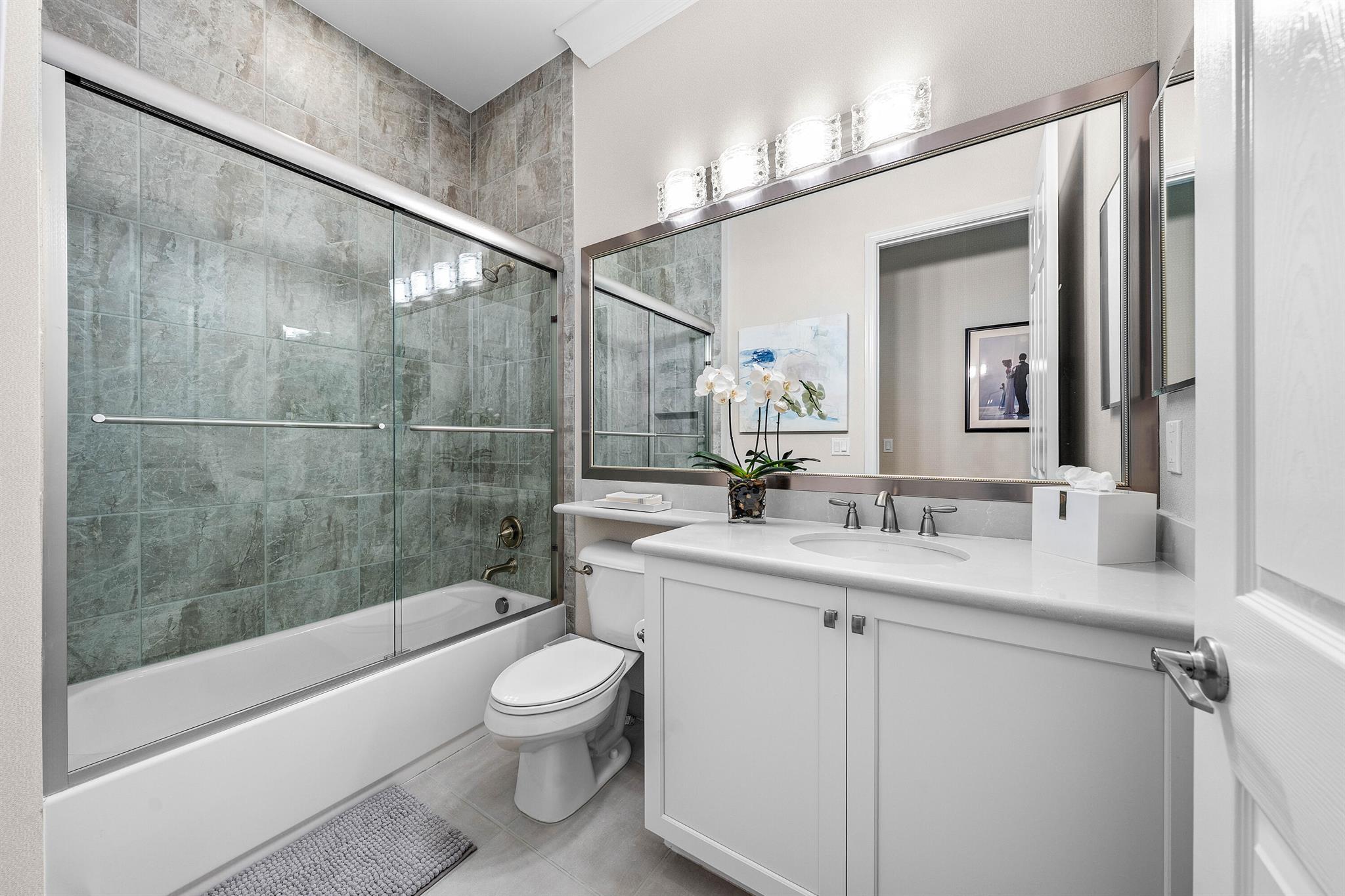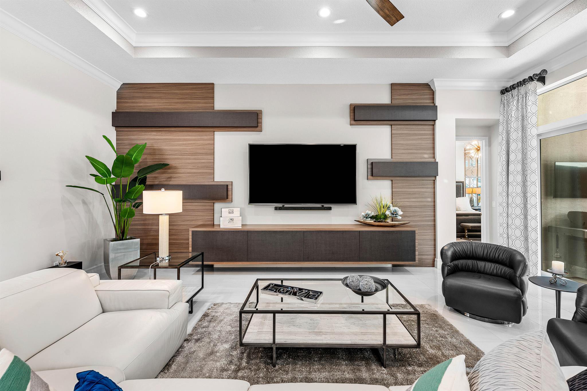 This beautifully appointed Caroline model sits on a lushly landscaped private lot backing south. Great curb appeal - private gate and etched glass double door entry. The home (2/2.1+Club room+3cg) features impact windows, upgraded AC, 24'' porcelain floors, crown moldings, designer wall treatments and wallpapers, designer window treatments and light fixtures, hi-hats, fans, custom built-ins, outfitted closets, upgraded bathrooms and more! The gourmet kitchen has white wood cabinetry, built-in hutch, quartz countertops, center island, snack bar, breakfast nook, GE Cafe appliances including induction cooktop and all the bells and whistles! Luxurious primary suite! You'll love the covered, extended patio, birdcage with picture frame screen and beautiful landscaping with landscape lighting!