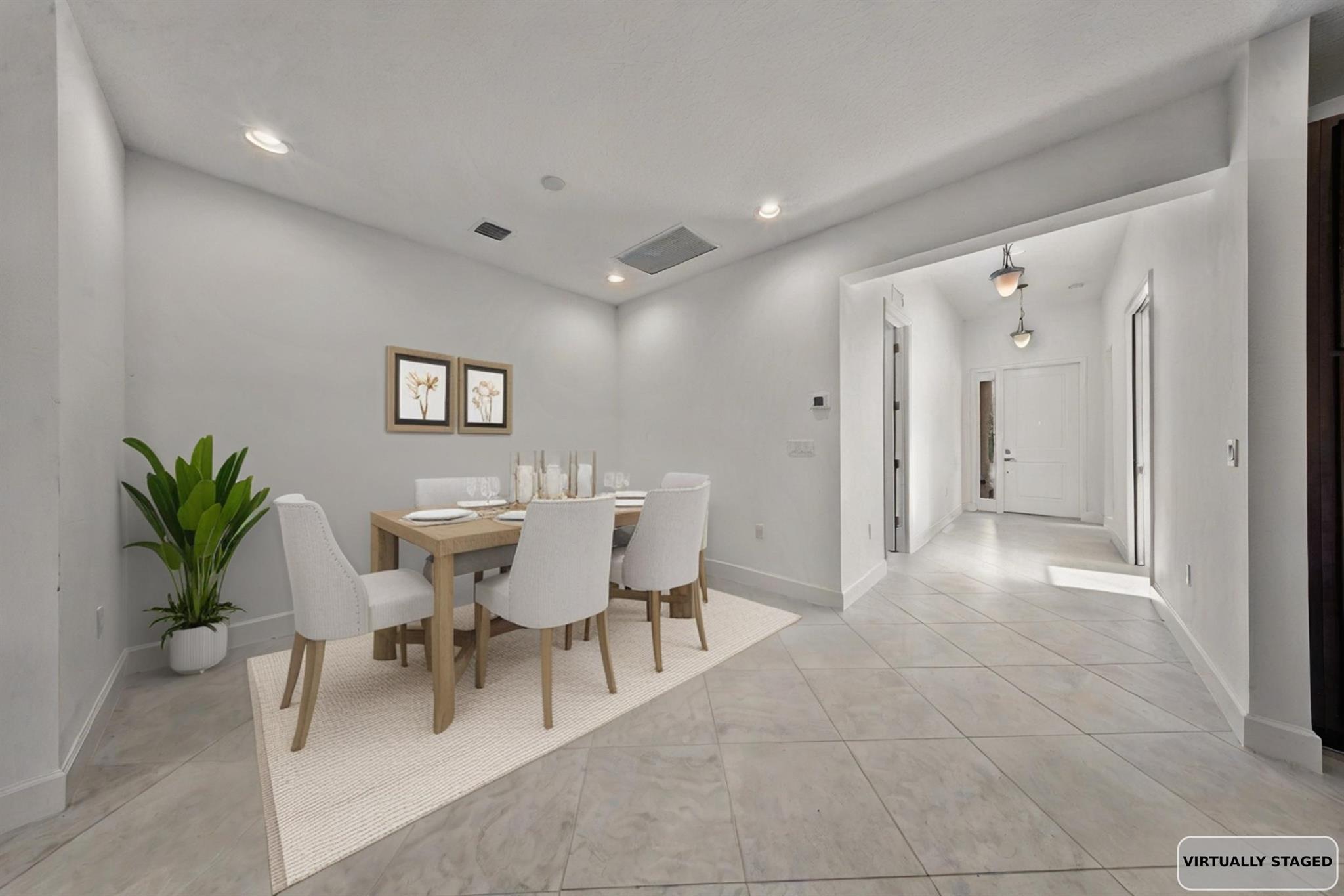 Step into this Sandpiper model with 1,760 living space under air, 2 bedrooms + office/3rd bedroom with pocket doors, and 2 baths. Corner lot with added Clusias for full privacy with fencing and screened patio. Upgrades include diagonal tile, recessed lighting throughout, impact windows, marble windowsills, full gutters, and extra TV hookups inside and on patio. Kitchen with pantry, finished back panel of island with added GFI. Primary suite features 2 walk-in closets, dual sinks, tiled-to-ceiling shower. Guest bath also tiled to ceiling. Laundry room with sink. Valencia Grove offers world-class 55+ amenities: clubhouse, resort pool with cabanas, fitness, pickleball, tennis, and endless social events. Move-in ready with security system.