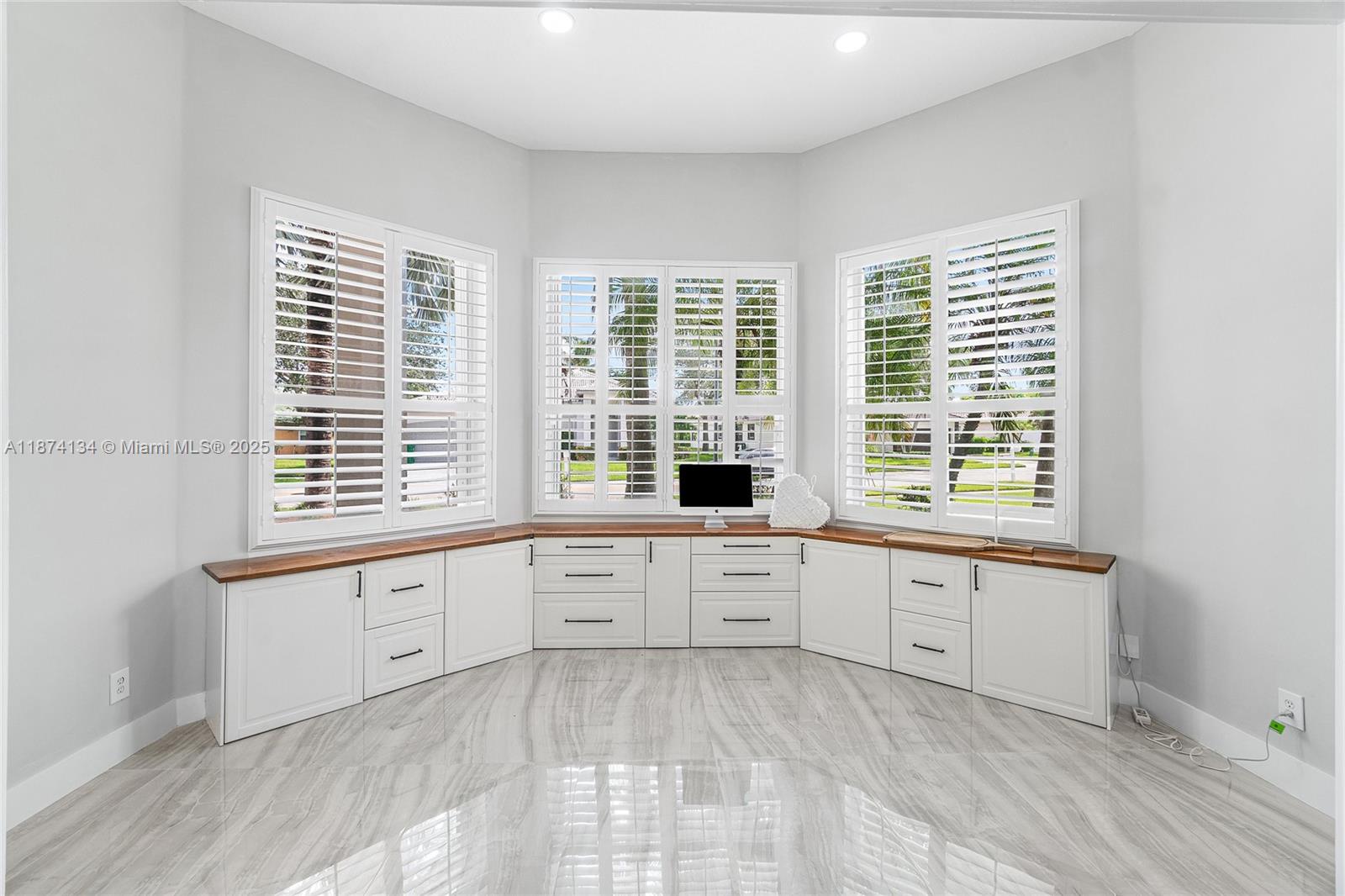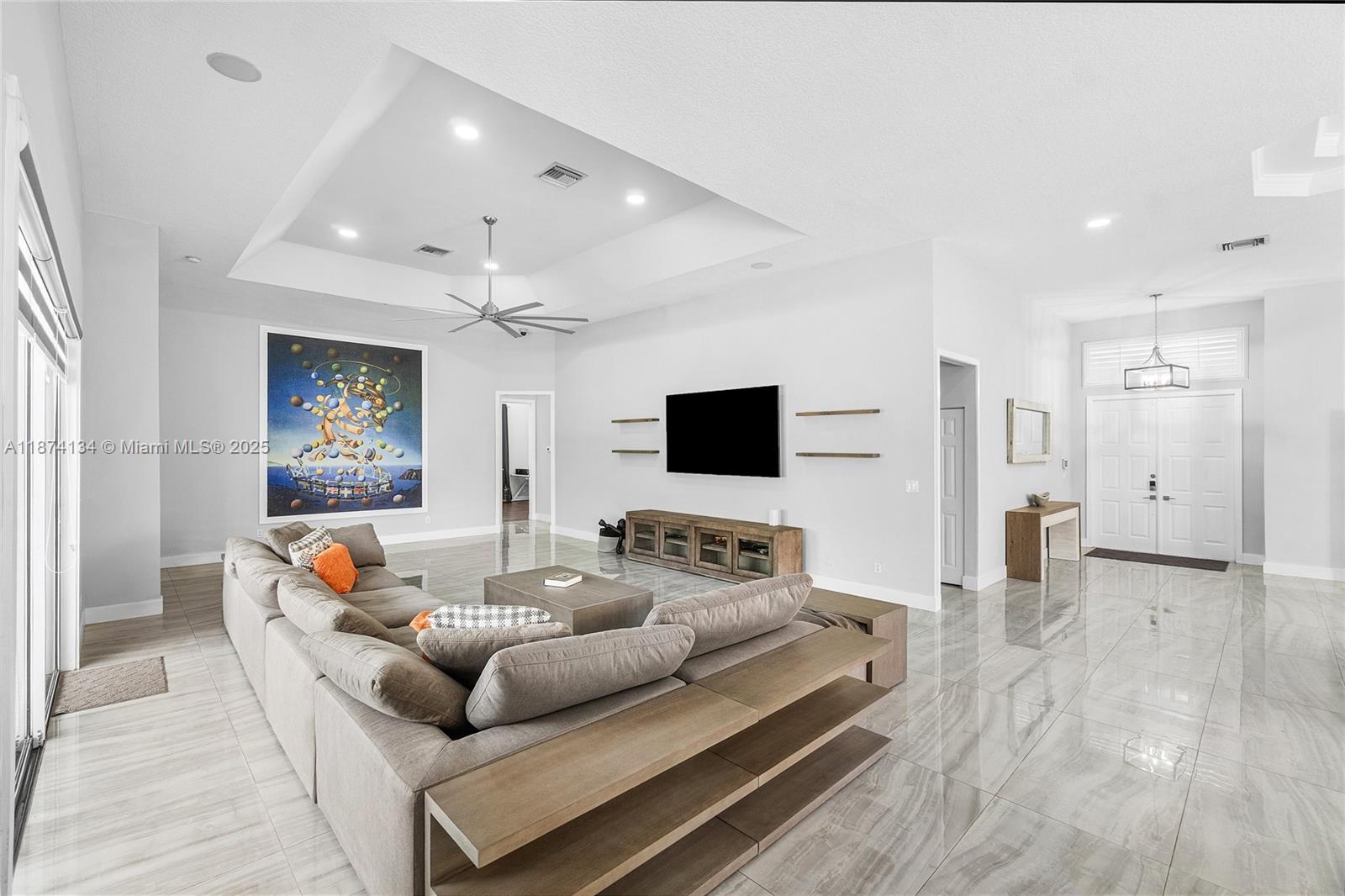 Spacious 4400+ sq ft Builder's model home! This stunning 4 bed Ranch style home offers luxury, privacy and a beautiful backyard oasis.Open floor plan with modern tile floors and a large primary suite with dual vanity sinks, oversized shower, sleek stand alone bathtub and a huge walk-in closet featuring built ins. Full Accordion hurricane storm shutters LED lighting, Custom Plantation shutters, upgraded kitchen with waterfall quartz countertops and newer GE appliances, double oven, wine cooler, Samsung smart fridge. Pool newly 2024 resurfaced with marble deck and summer kitchen. Modern pergola is perfect for entertaining! Front bay window den is perfect for a home office, flex space with built in cabinetry. 3 car garage! Volume ceilings, tons of natural sunlight. Make everyday a vacation!