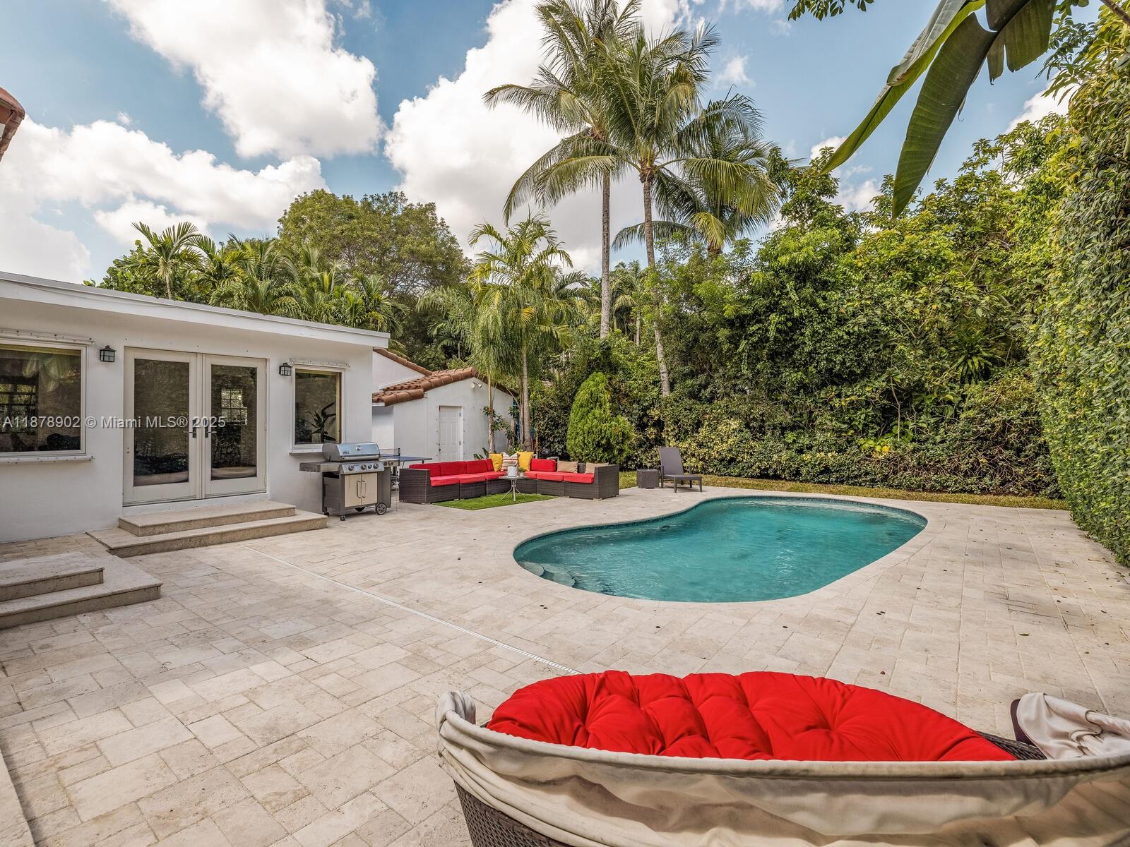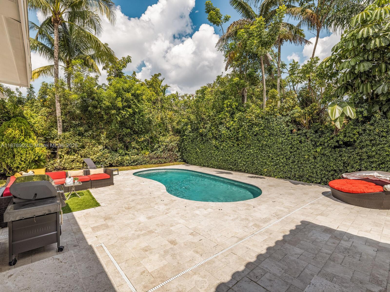 Fabulous location, updates and character await you in this 4-bedroom, 1,917 SF Miami Shores pool home. Welcome to The Seagrape Escape! Fantastic flowing interiors: entrance foyer; bright sunroom; vaulted beamed ceiling dining; newer quartz counter island kitchen with wine bar + cooler and storage galore; breakfast nook; plus rear media room opening to private gardens, sparkling “boomerang pool” and entertainment decks. Sleep easy in the rear primary ensuite with walk-in closet, spa-like bath and cabana door to pool—plus, two east wing bedrooms + bath; and a fourth “flex” west wing ensuite bedroom, perfect for guests, office, or studio/gym. A great value, with a new roof, ceramic plank and travertine floors, and the signature seagrape tree in the front, just blocks to Downtown Shores.