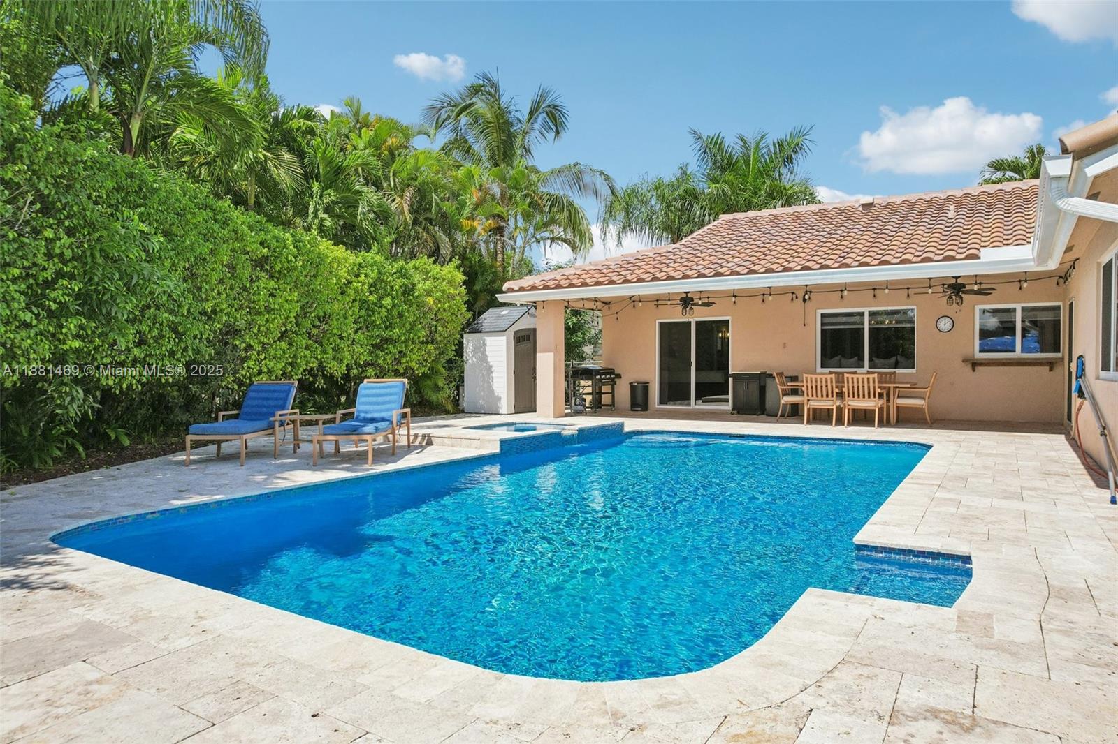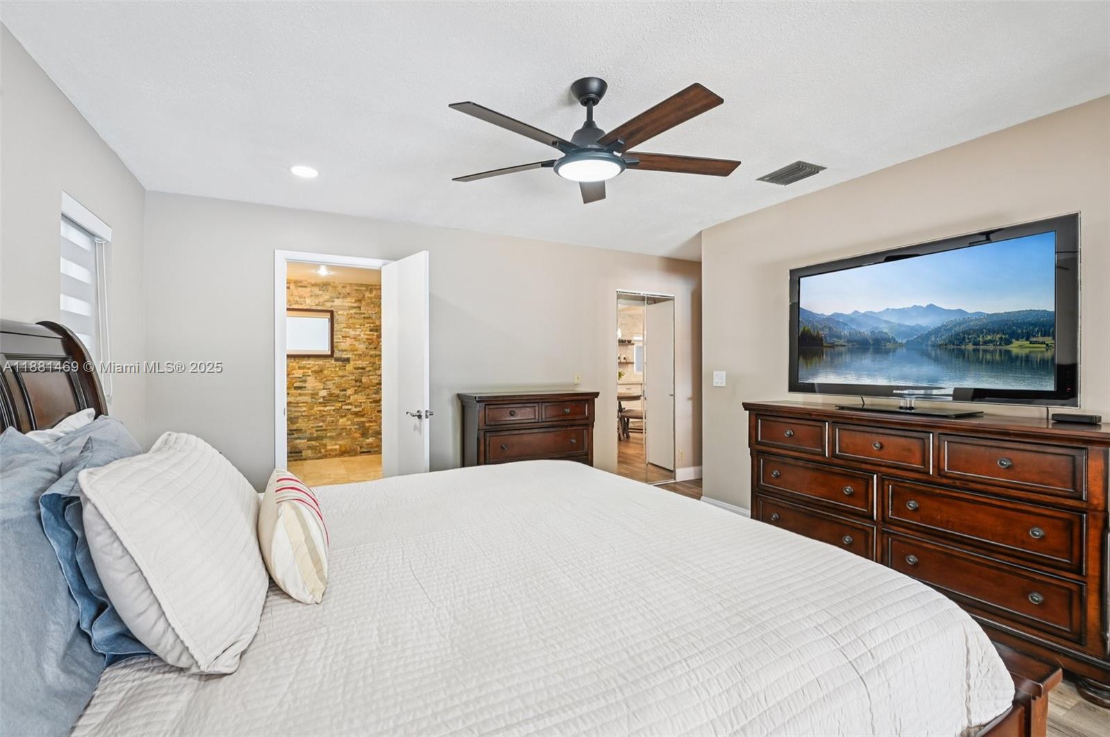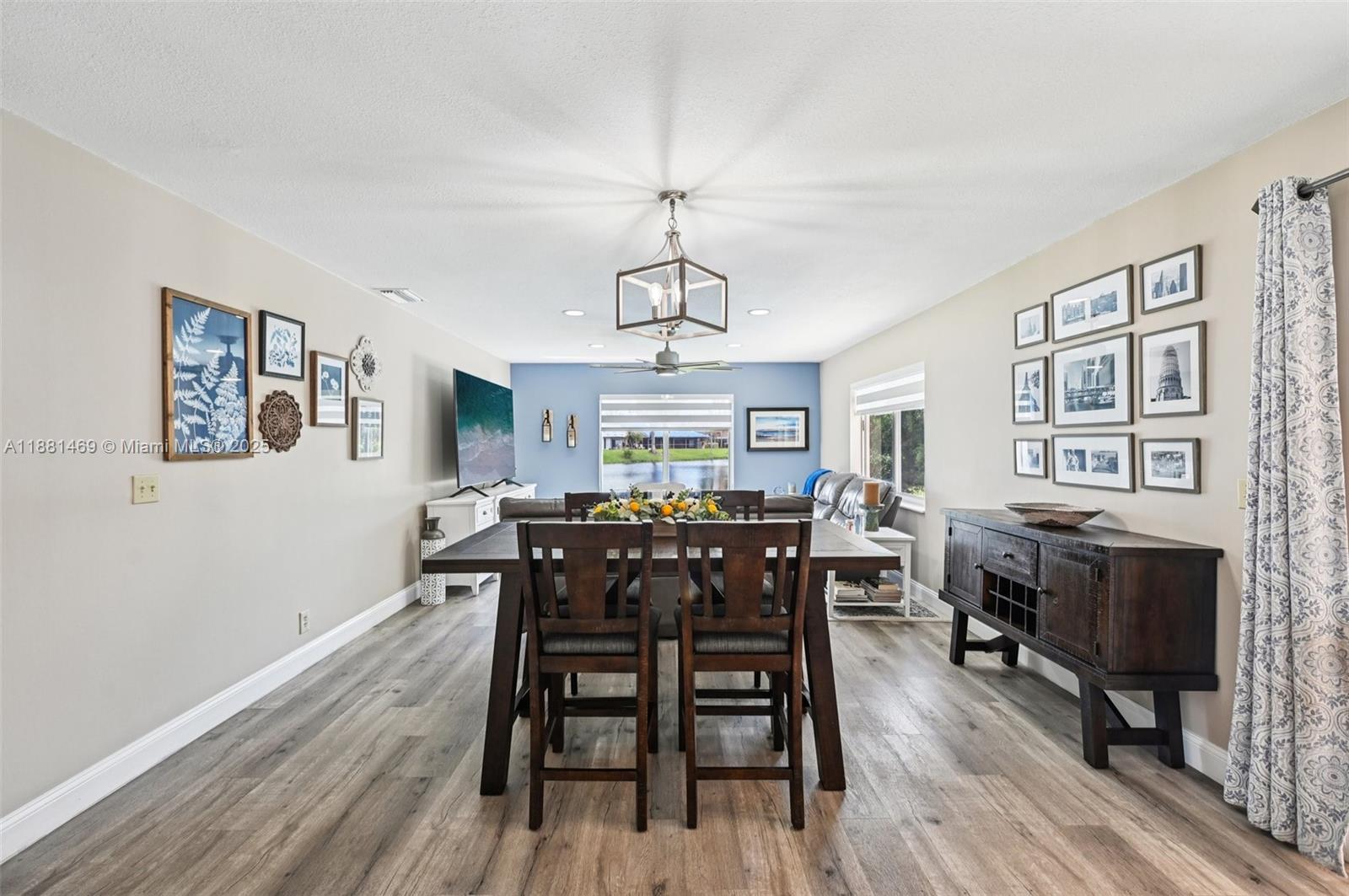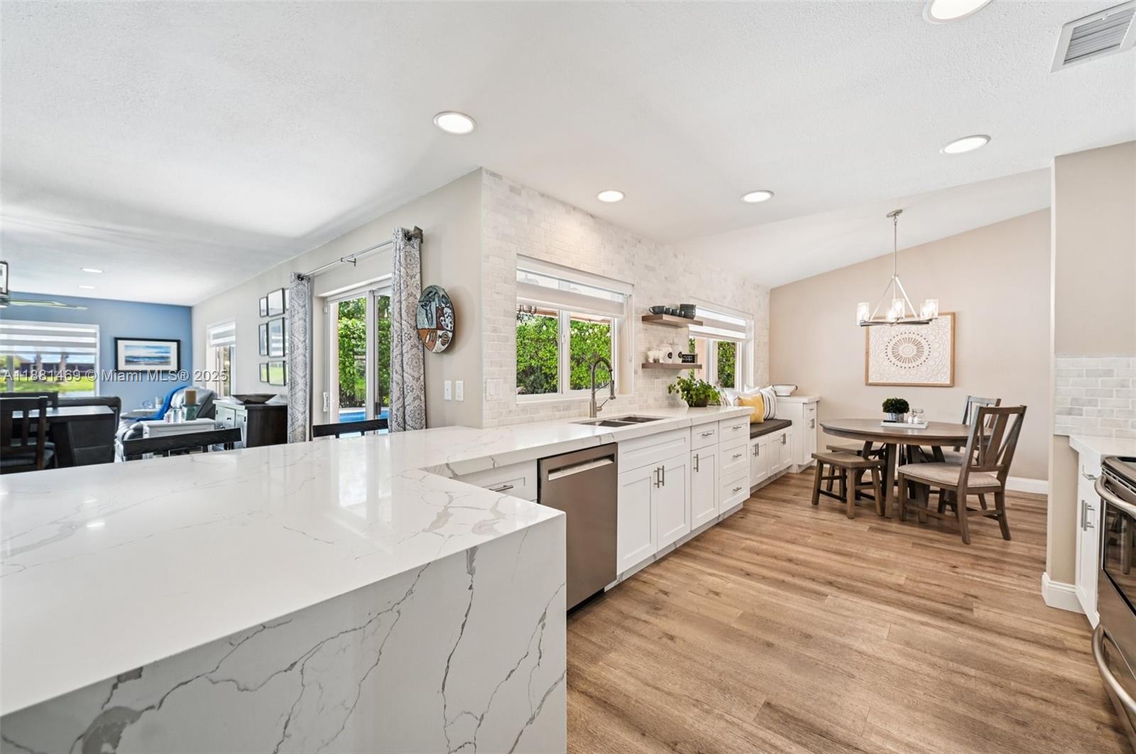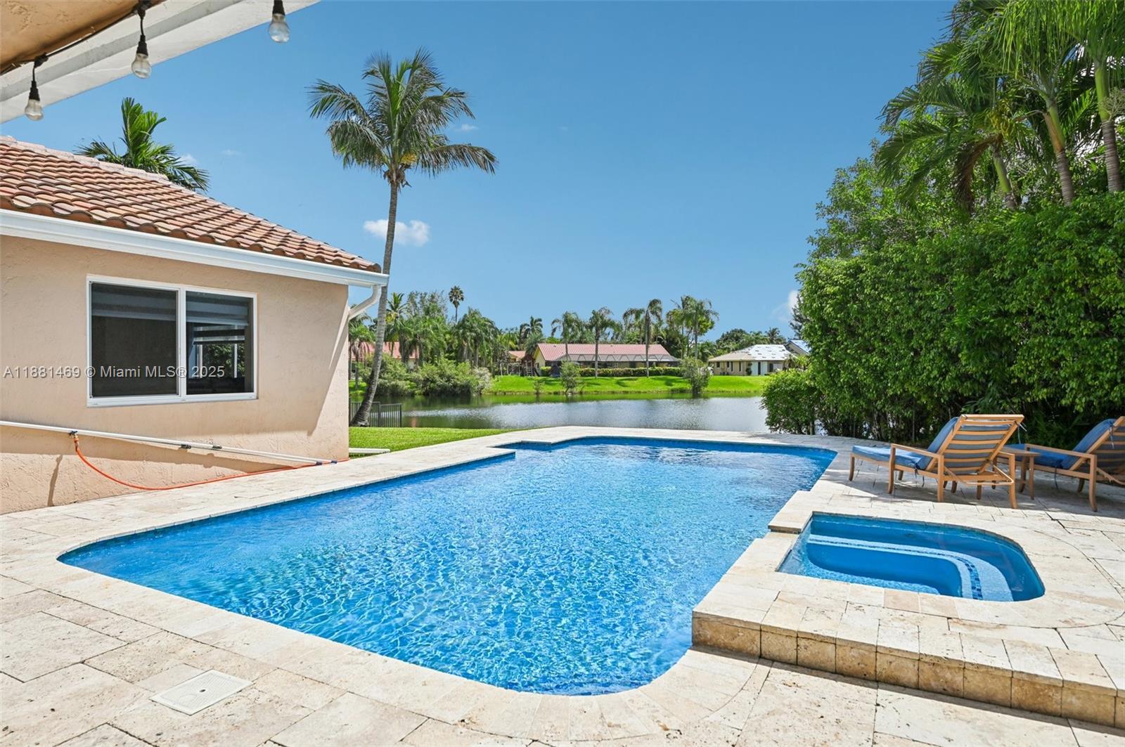 This stunning 4-bedroom, 2-bathroom pool home is situated on a serene lake in sought-after West Davie. Enjoy piece of mind with a 2024 ROOF and IMPACT WINDOWS AND DOORS. Inside, you'll find a spacious, remodeled kitchen with white shaker cabinets, quartz countertops with a waterfall edge, and convenient seating. The bathrooms have been tastefully updated with modern finishes, and luxury vinyl flooring flows throughout the home. The primary suite includes a large walk-in closet with custom built-ins, and zebra blinds add a contemporary touch to every room. The garage includes built-in cabinets for extra storage. Outside, enjoy a large, resurfaced pool, travertine deck and tranquil lake views. Zoned for A-rated schools and a low annual HOA of just $350, this move-in-ready home has it all.