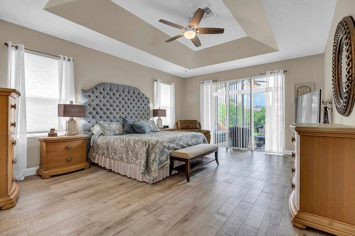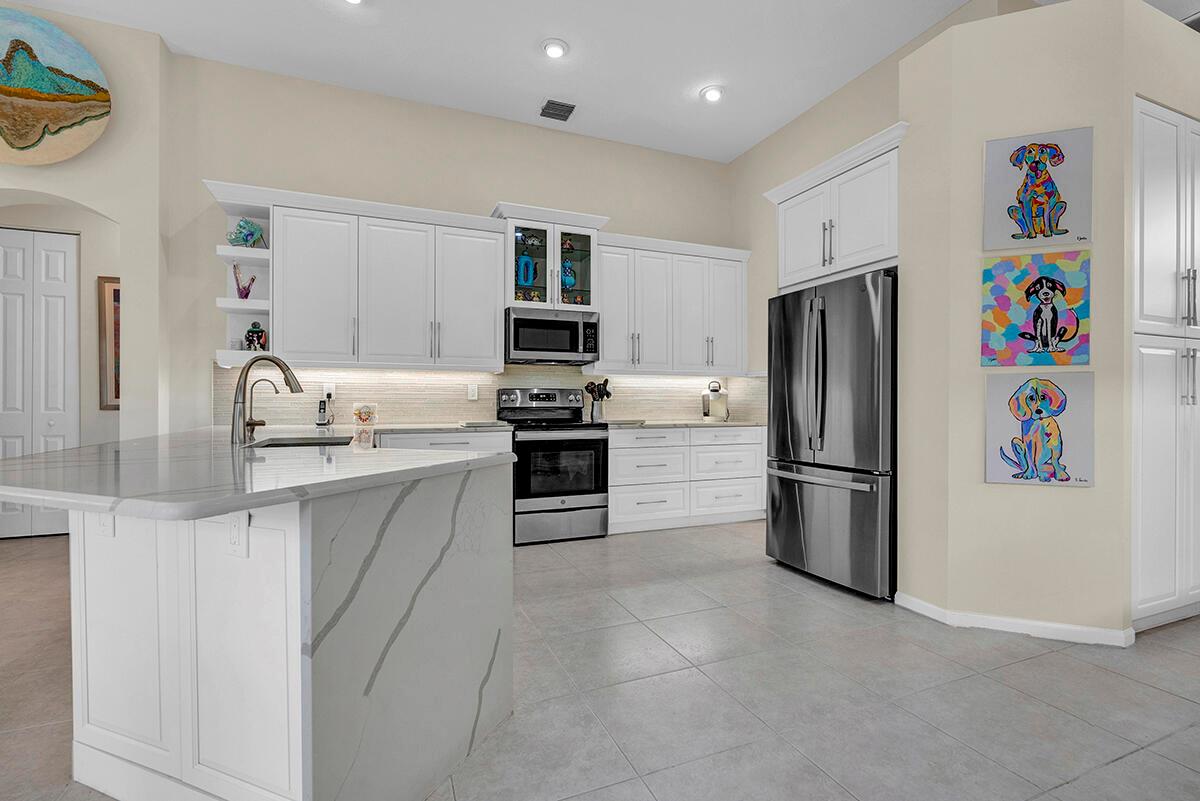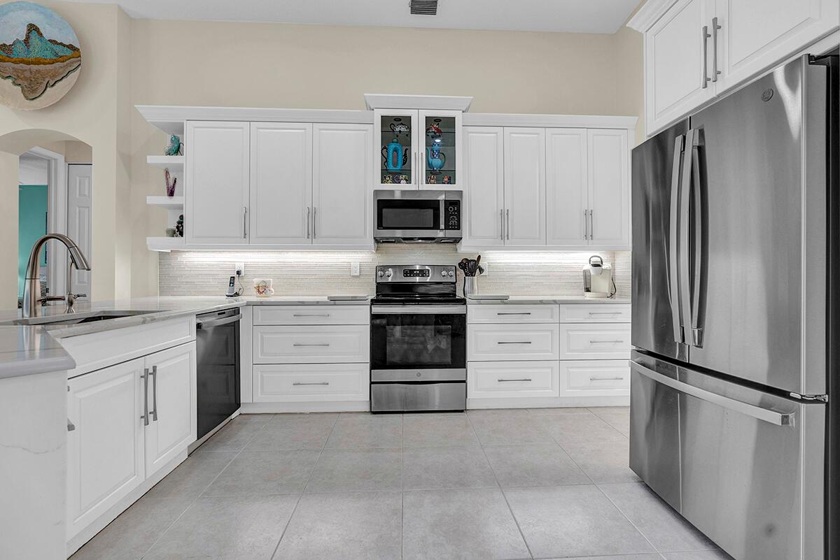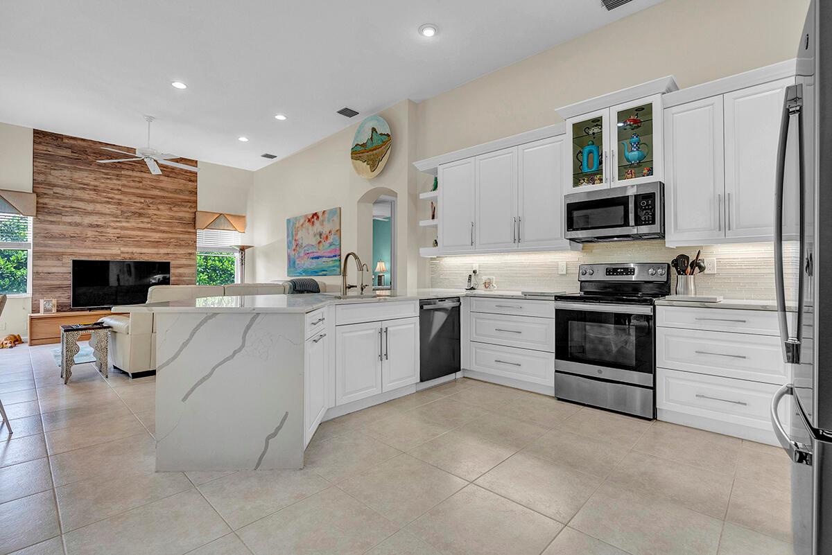 Welcome to this 3-bedroom, 2-bathroom home, where comfort meets style. Fully renovated bathrooms and a beautifully updated kitchen give this home a fresh, modern feel. The chef's kitchen boasts sleek new appliances, upgraded cabinetry with convenient pull-out shelves, and an open layout perfect for entertaining.Enjoy year-round comfort in the spacious lanai, now under air, ideal for relaxing or hosting guests. The high ceilings and strategically placed high hats create a bright, airy ambiance throughout the main living areas. A charming decorative wood wall in the family room adds warmth and character.