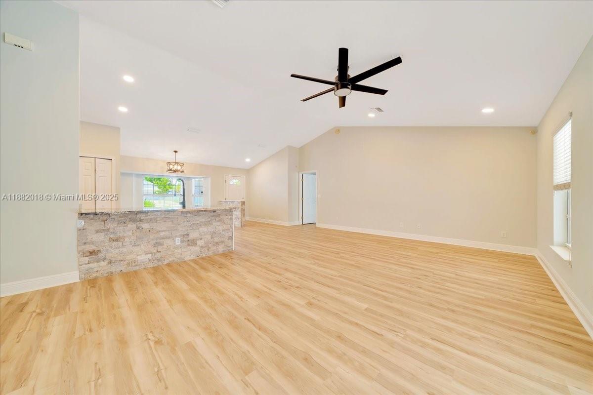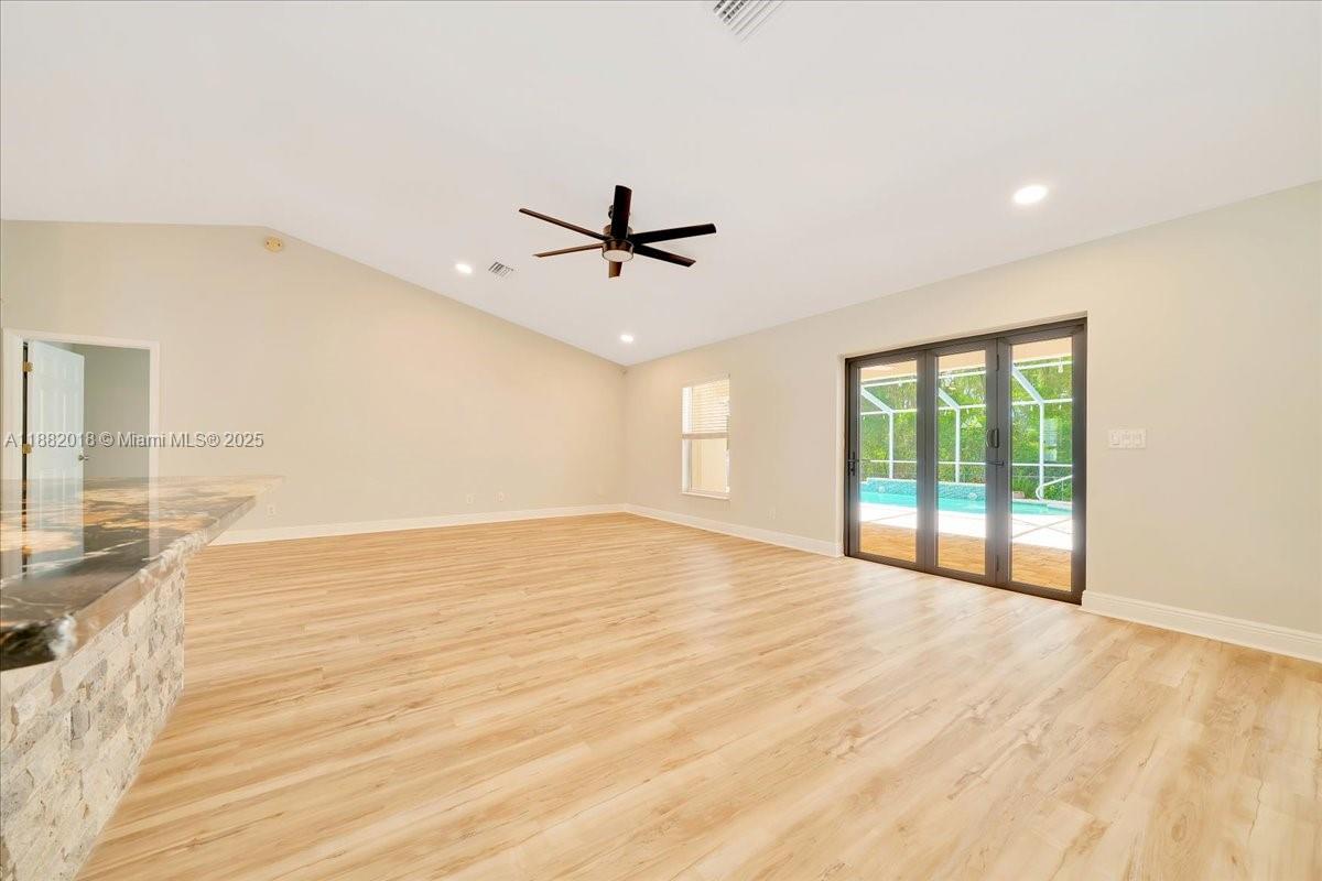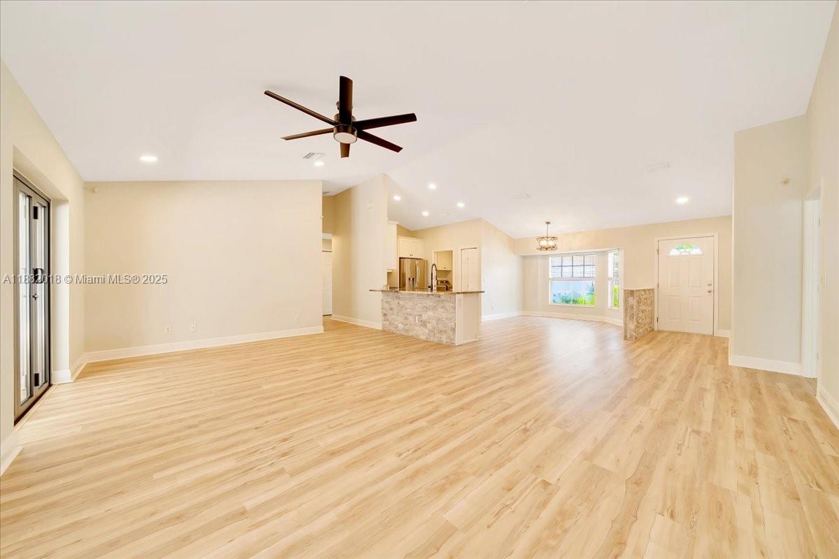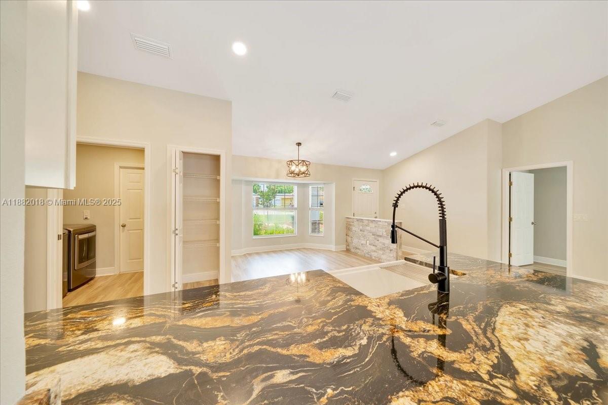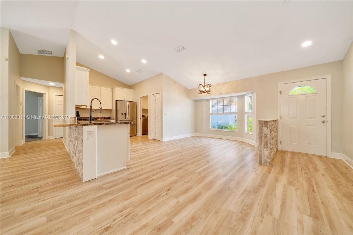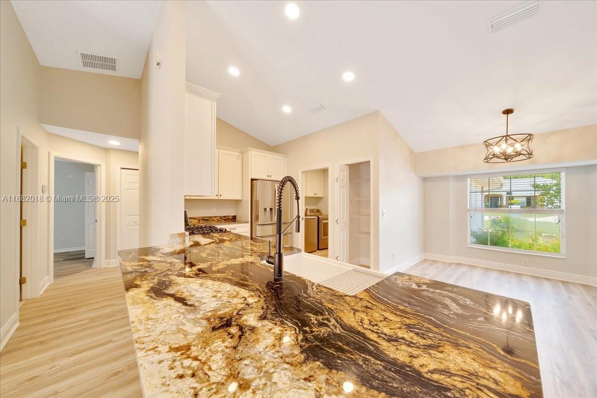 Originally built in 2003 by Murphy Kaufman, this 4-bed, 3-bath pool home with private in-law suite has been fully renovated in 2024–25. The entry was opened to create a spacious flow between kitchen and great room, with new Shaw luxury vinyl plank flooring throughout. The kitchen features solid wood cabinets, quartz countertops, farmhouse sink, LG stainless appliances, gas cooktop, and restructured island. The master suite offers pool access and a spa-like bath with garden tub, dual-head shower, and quartz finishes. All baths are updated with modern fixtures. Other upgrades include new baseboards, paint, lighting, fans, and custom trifold glass doors leading to a refreshed pool area. The in-law suite has its own entrance, kitchen, HVAC, and full bath.