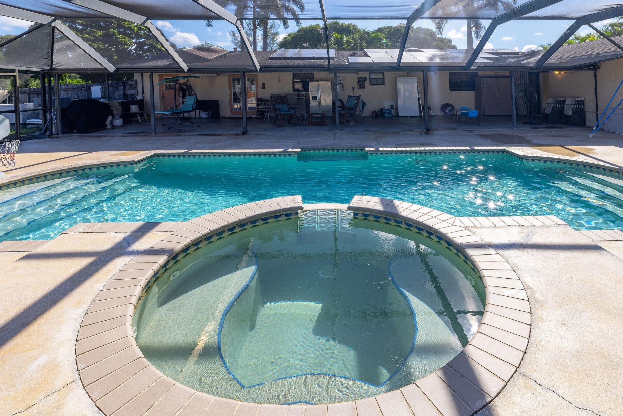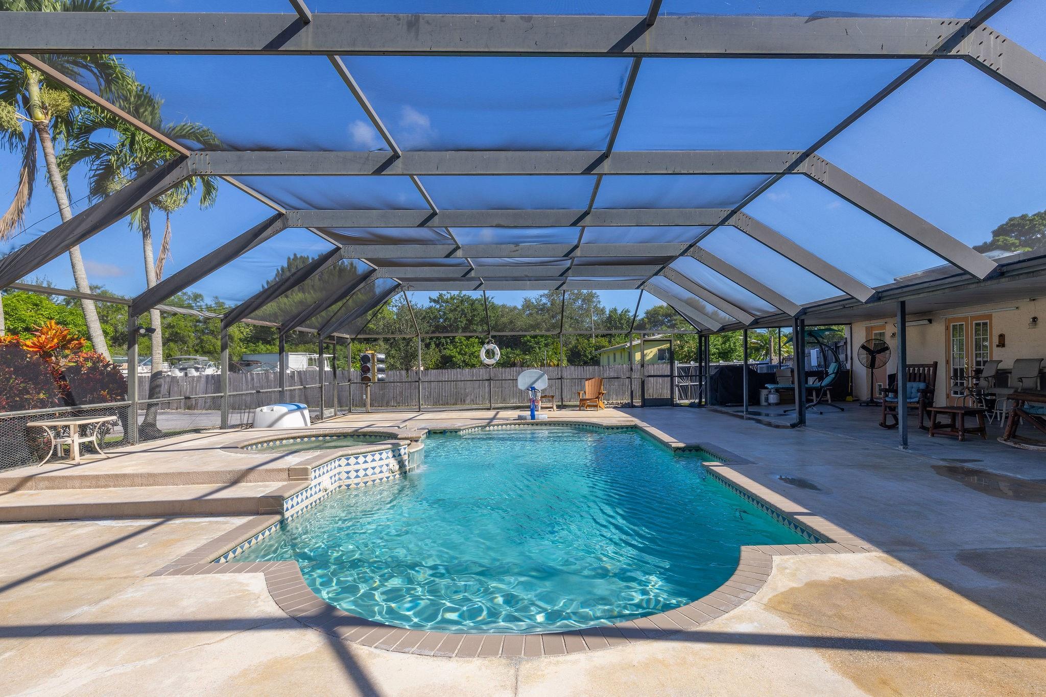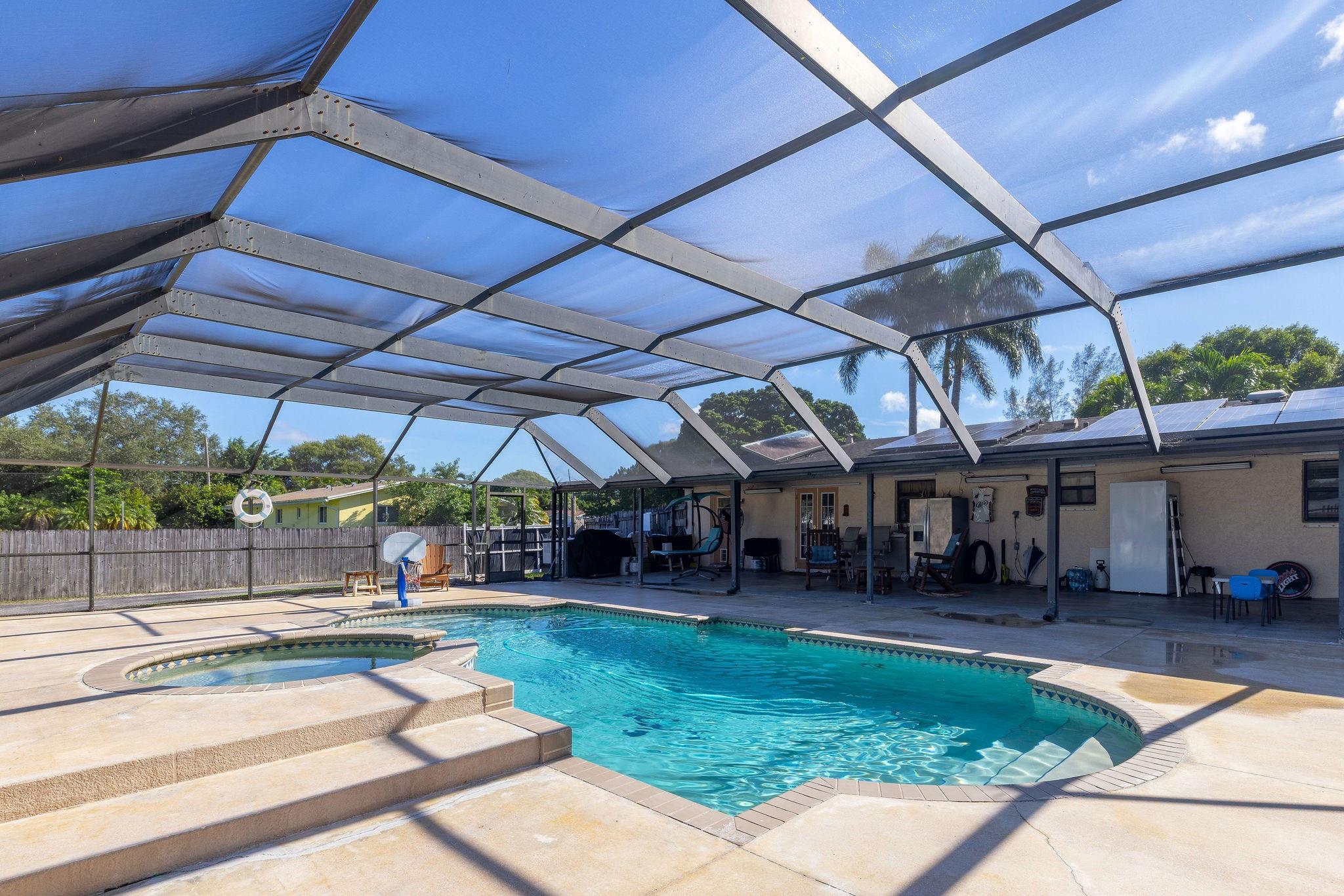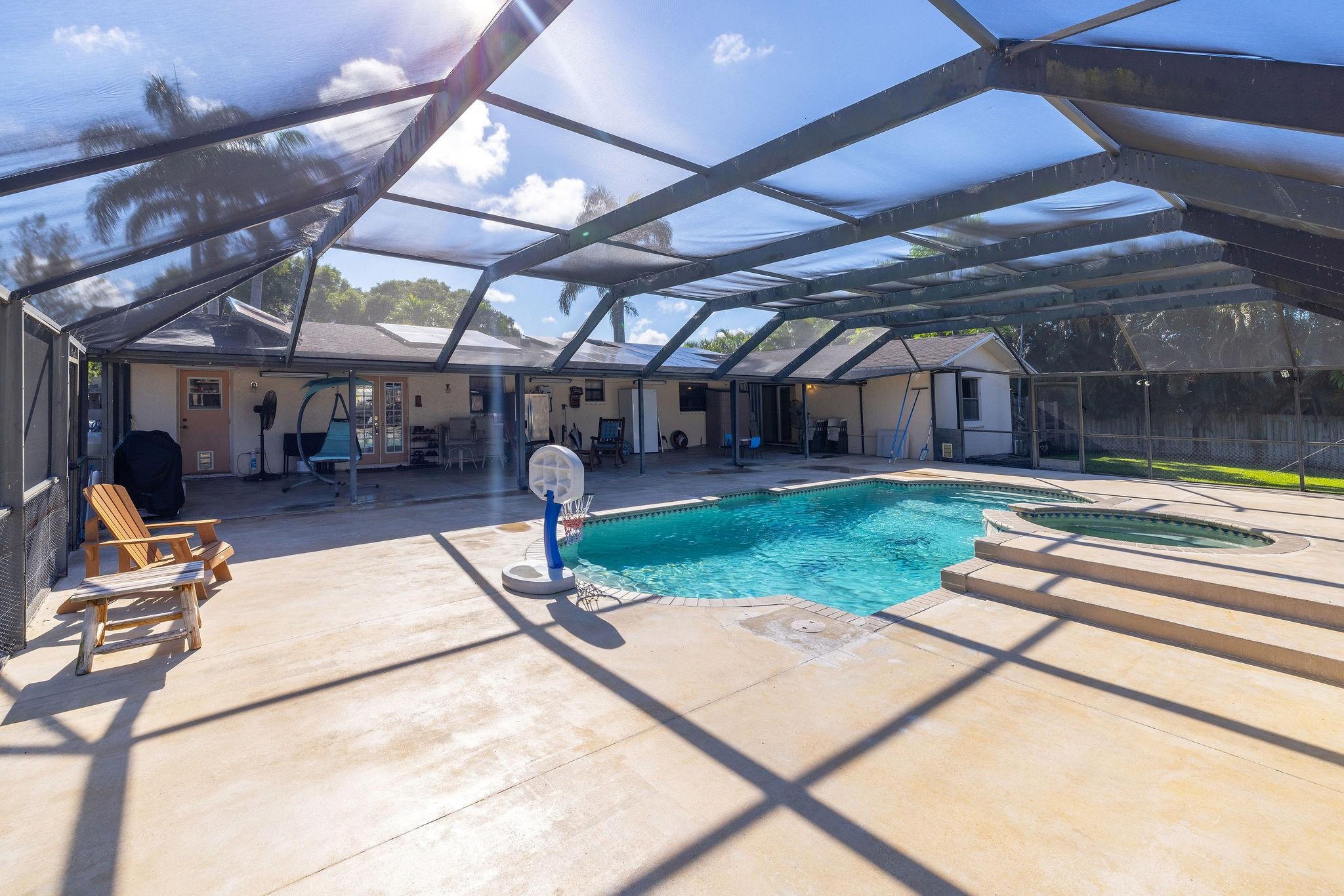 Versatile 4-bed, 3-bath residence designed for comfort and flexibility. Main home offers 3-bed, 2-bath, while the attached 1-bed, 1-bath separate living quarters include full kitchen, living area, private entrance, separate driveway, and direct pool access—ideal for multi-generational living or rental income. Energy-saving features include whole-home solar panels & a 120-gallon solar water heater, with a generator powered by a 500-gallon propane tank providing backup power for entire home. Roof installed in 2018 and a 5-ton Trane AC installed 2019. Screened-in patio, heated pool, & a sprinkler system fed by a 200-ft deep well with Goul pumps. 1,200 sq ft/6-car garage with water & electric, with a 2,500 sq ft concrete pad. Ample space for cars, projects, hobbies, or a home-based business.