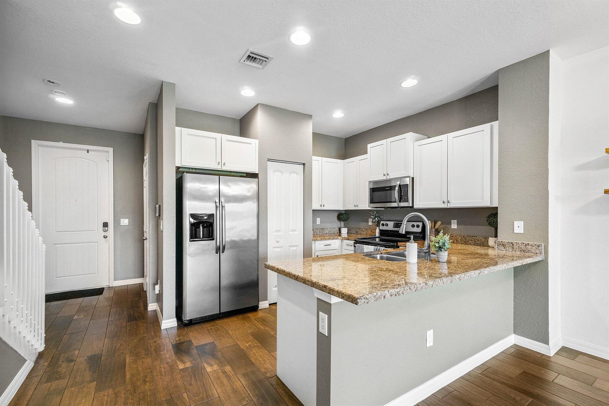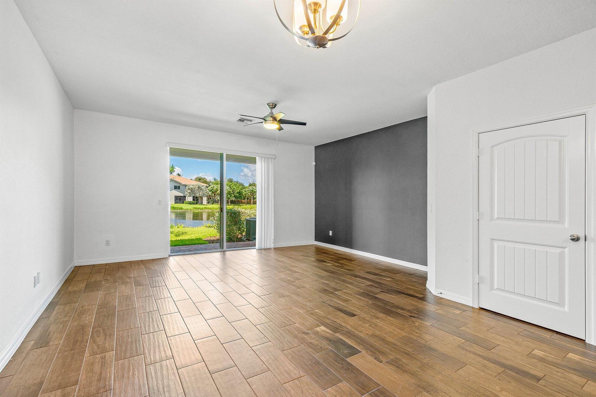 Welcome to this stylish waterfront home, built by D.R. Horton in 2017! This residence combines modern design with move-in-ready comfort! The upgraded kitchen boasts sleek finishes and stainless steel appliances, opening to a bright living area with wood-look porcelain tile floors and abundant natural light. The primary suite offers a fully renovated bathroom with a walk-in shower, designer tile, and premium fixtures. All bedrooms are generously sized with ample storage, and the in-unit washer and dryer add everyday convenience. Step outside to a private patio with tranquil water and fountain views, perfect for relaxing or entertaining. Ideally located near shopping, dining, and major highways, this home blends style, low-maintenance living, and a desirable waterfront lifestyle!