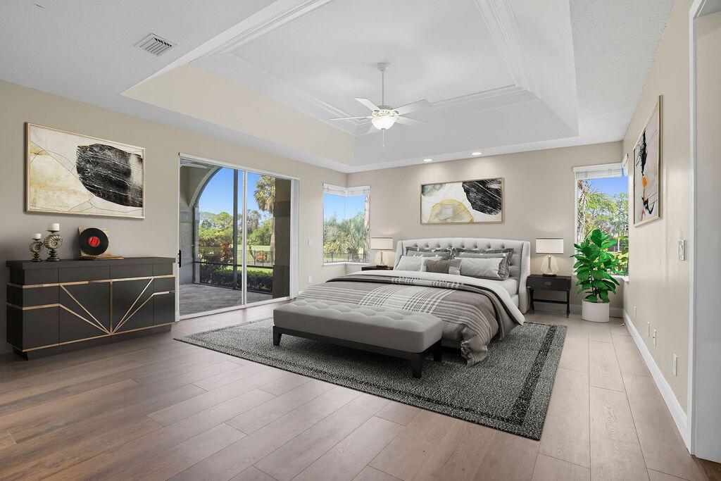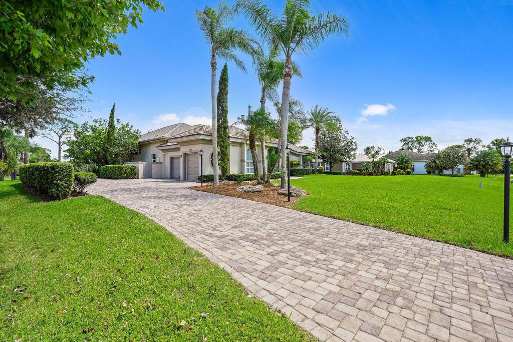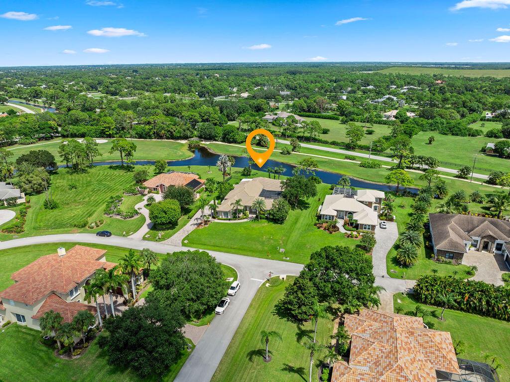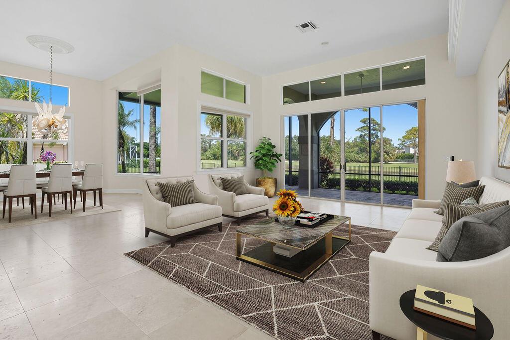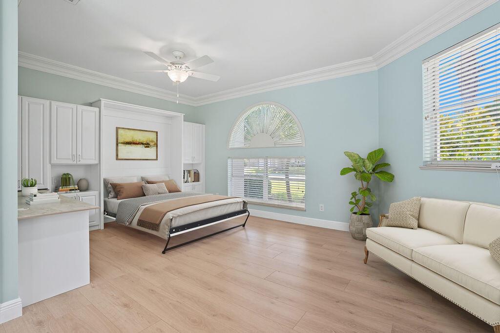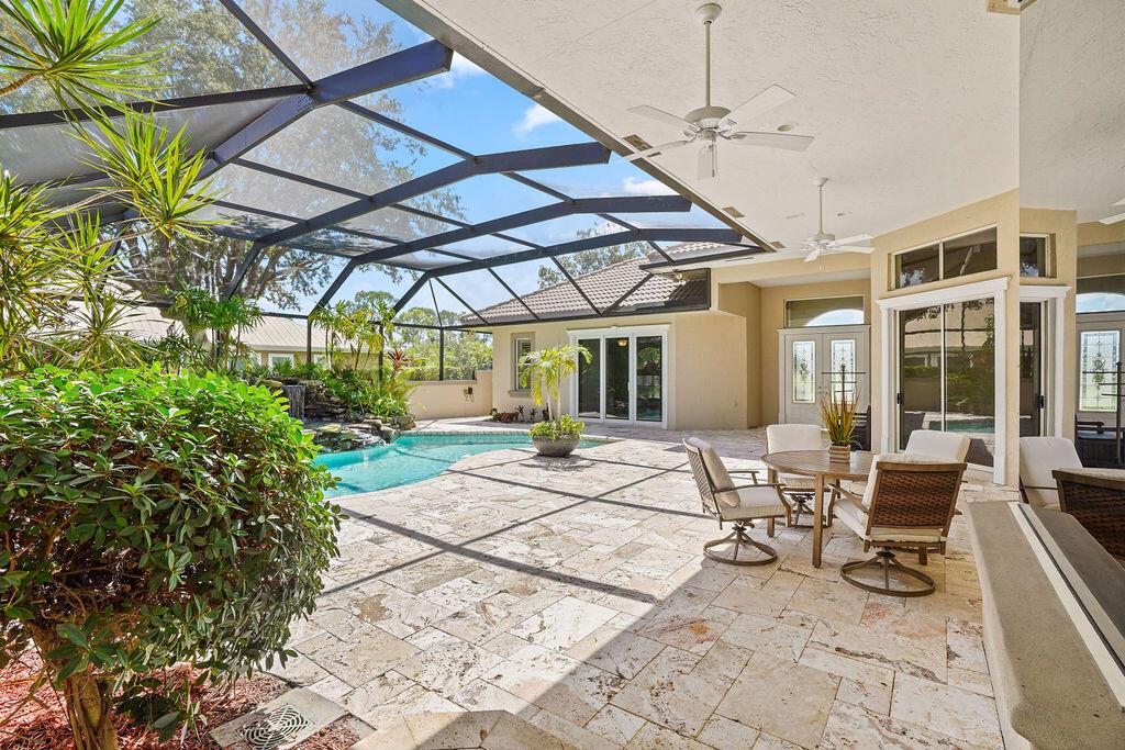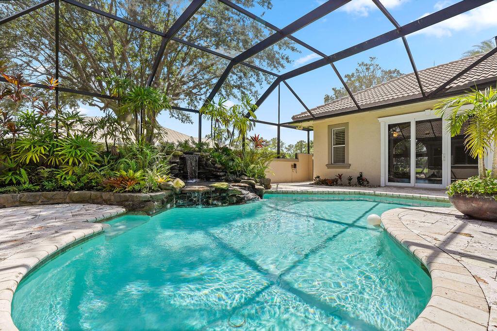 Welcome to 10255 SW Stones Throw Terrace, an exceptional residence located in the highly sought-after gated golf community of Cobblestone in Palm City. This expansive courtyard pool home is designed for both elegance and versatility, offering a 2 bedroom, 2.5 bath main house along with a fully renovated guest house featuring its own bathroom and kitchenette.At the heart of the home is a freeform heated pool with a screened enclosure, perfect for entertaining or enjoying peaceful Florida evenings. A separate screened lanai extends the living space and provides sweeping views of the 8th hole, tranquil lake, and golf course, where you can often spot native wildlife from birds to deer. Inside, the main residence boasts an expansive floor plan with volume ceilings, large butted windows allow