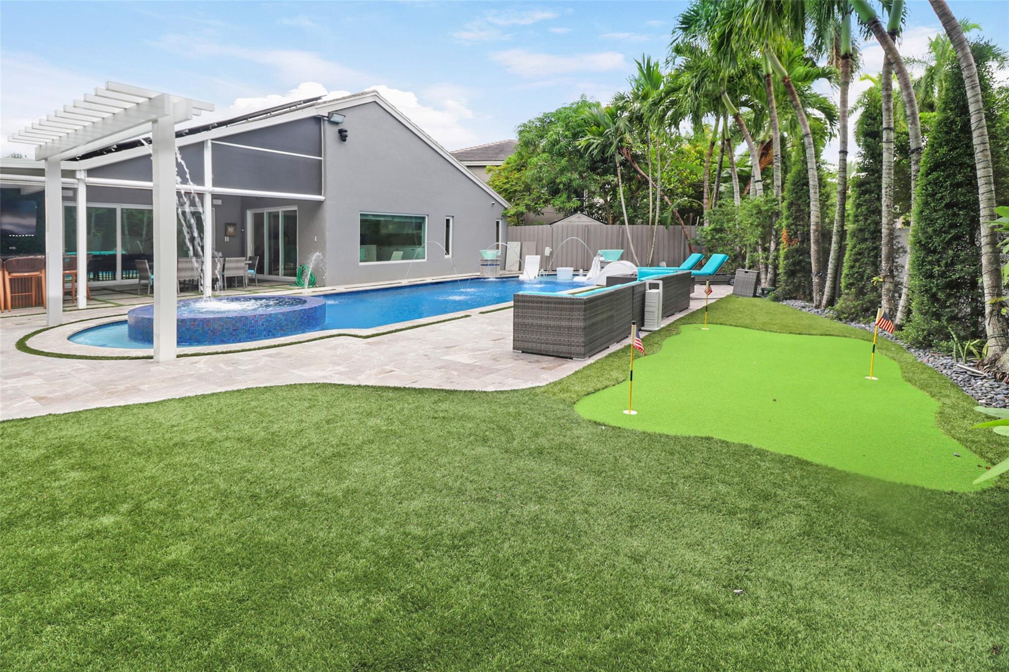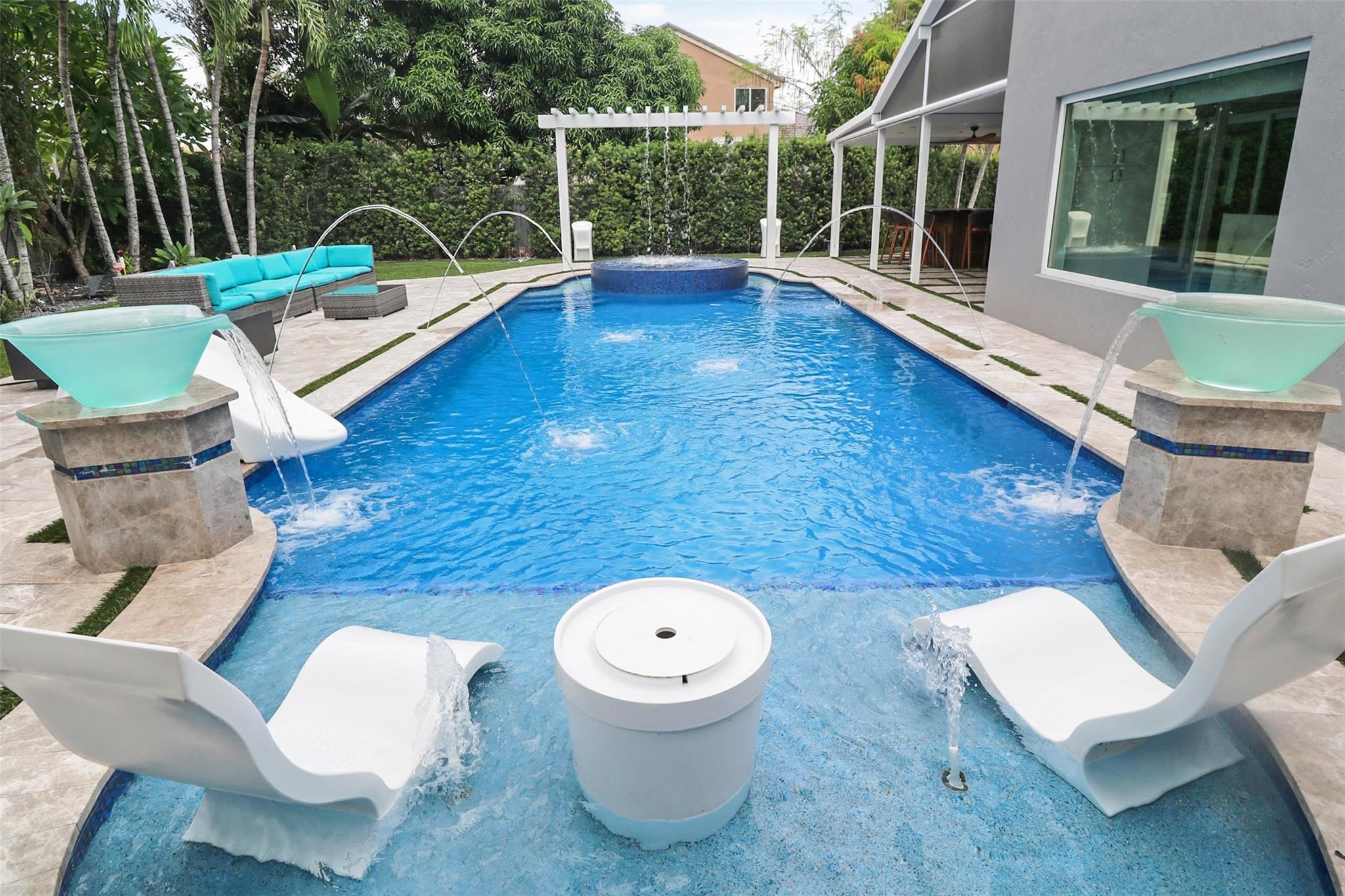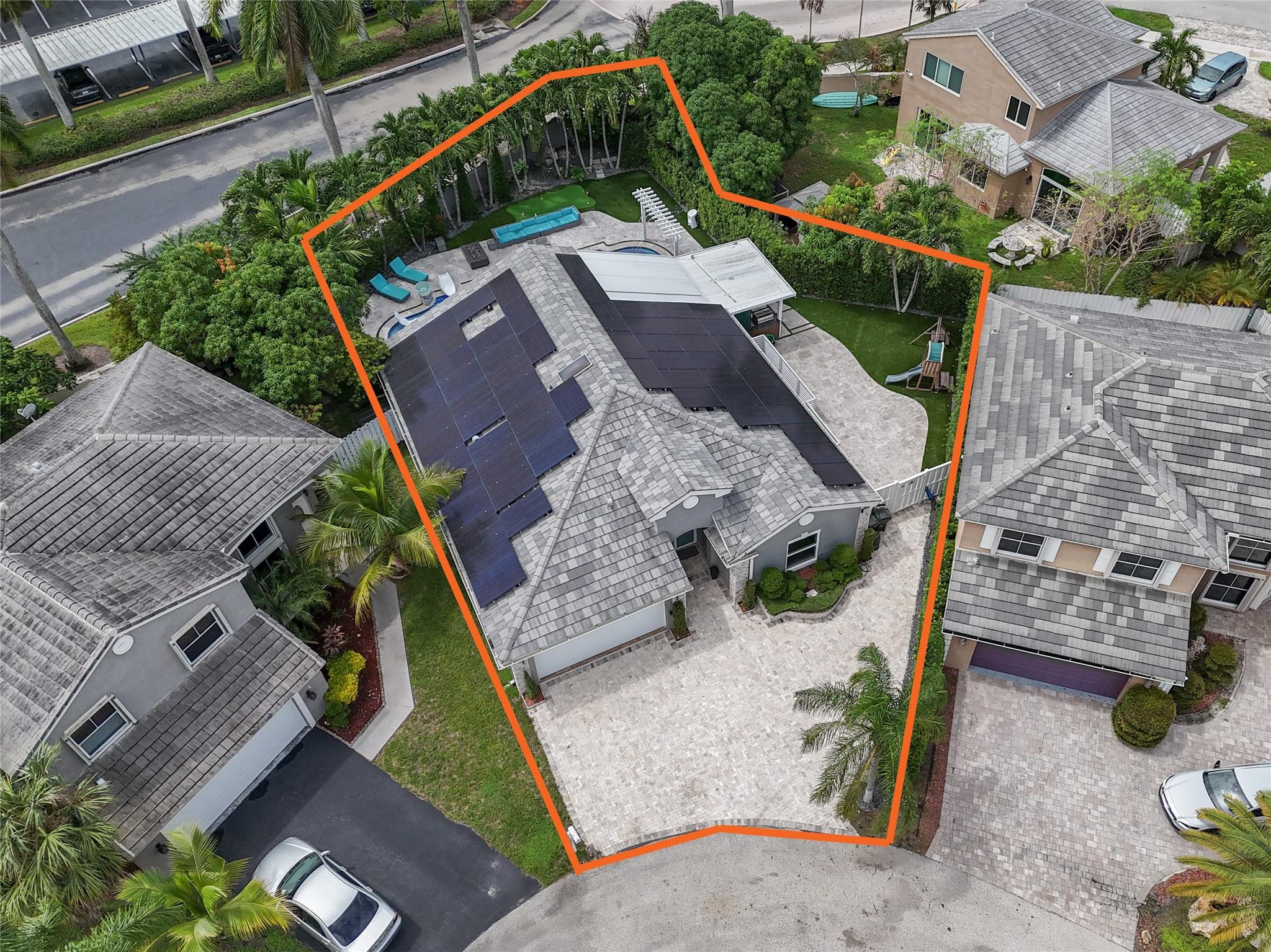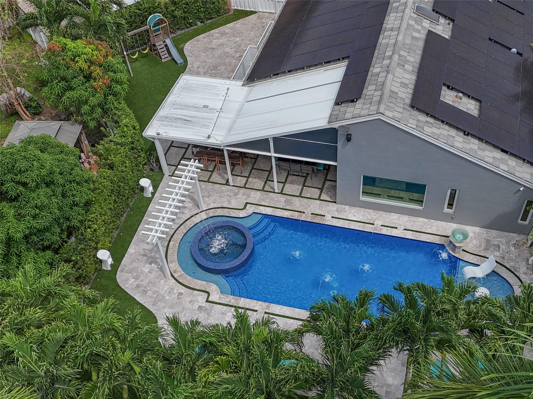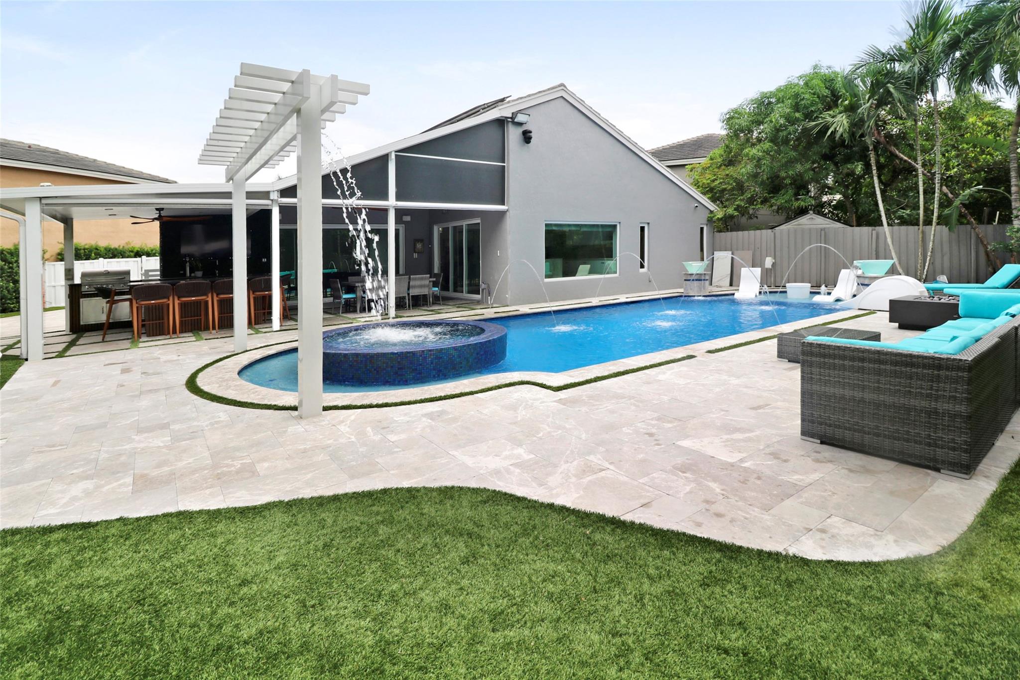 Welcome to your private resort-style retreat! This updated home offers the perfect blend of luxury, comfort, and functionality. Step outside to your backyard oasis featuring a sparkling resort-style heated/cool pool & jacuzzi with waterfall, fully equipped outdoor kitchen, lush artificial grass, and kids’ playground. Inside, enjoy a modern kitchen with high end finishes and new upgraded appliances. The open layout creates a warm and inviting flow throughout the home. Energy efficiency meets style with solar panels that keep utility low. Hurricane windows and door's. It has been thoughtfully upgraded to provide peace of mind and everyday convenience. This home truly has it all—luxury, sustainability, and friendly spaces—ready for you to move right in!