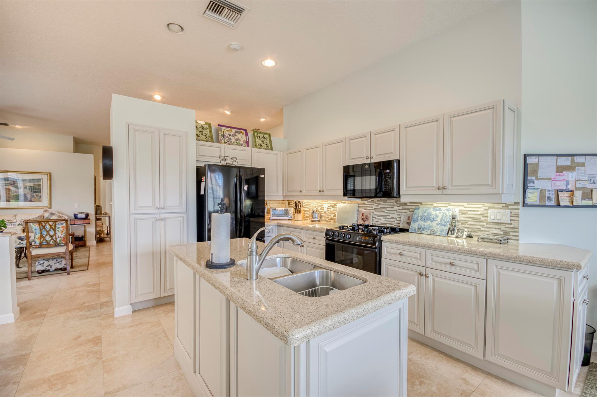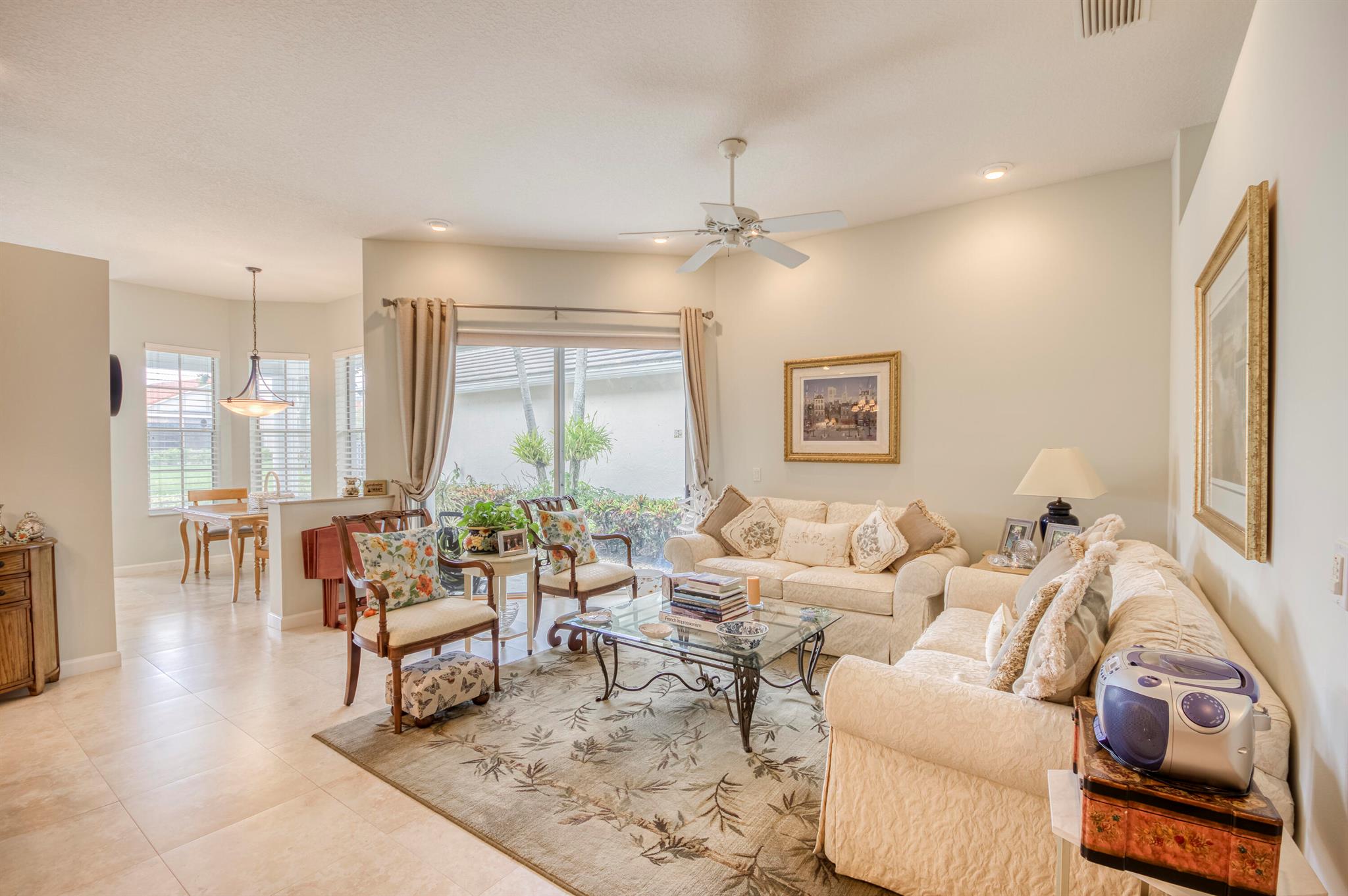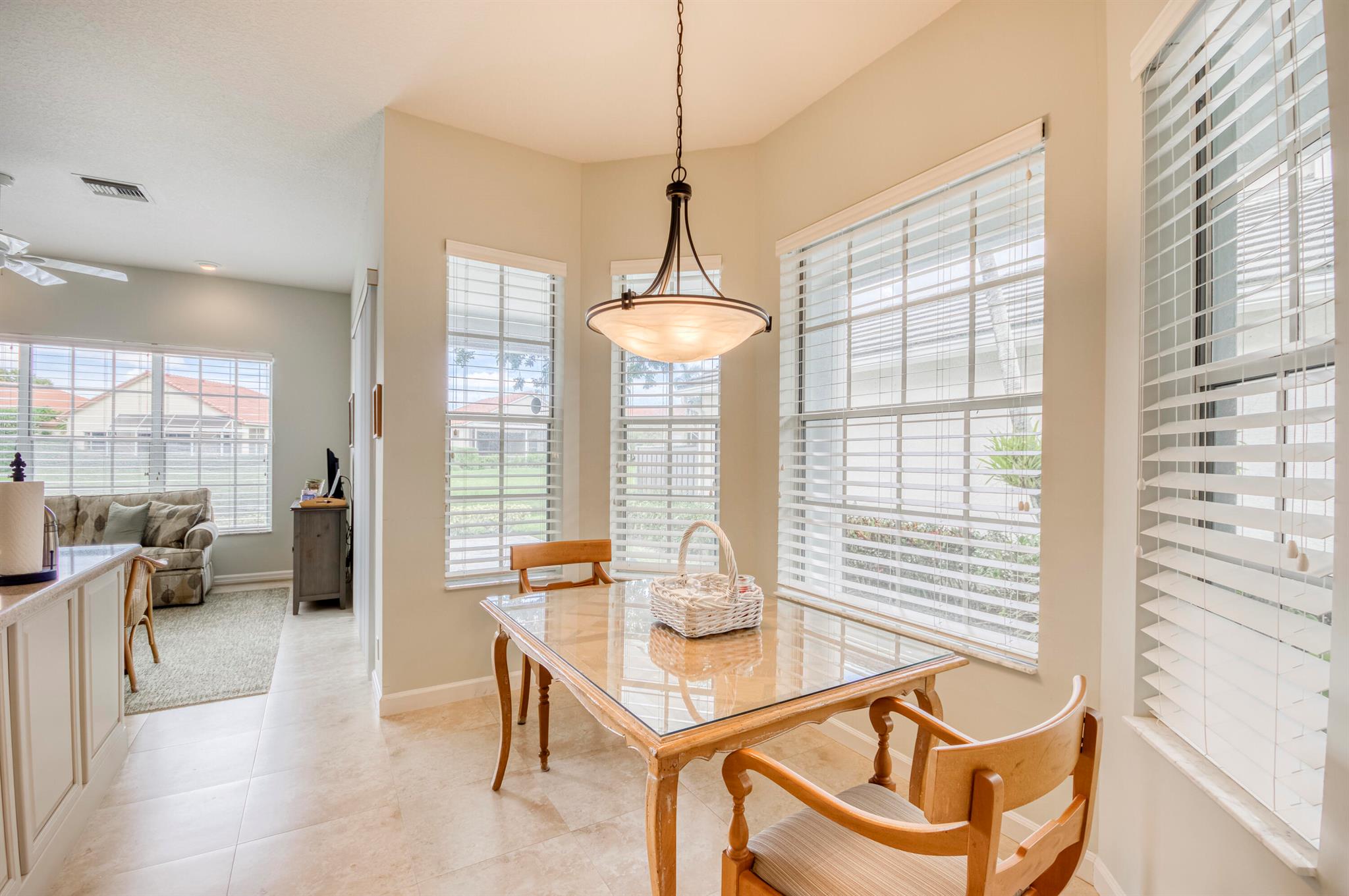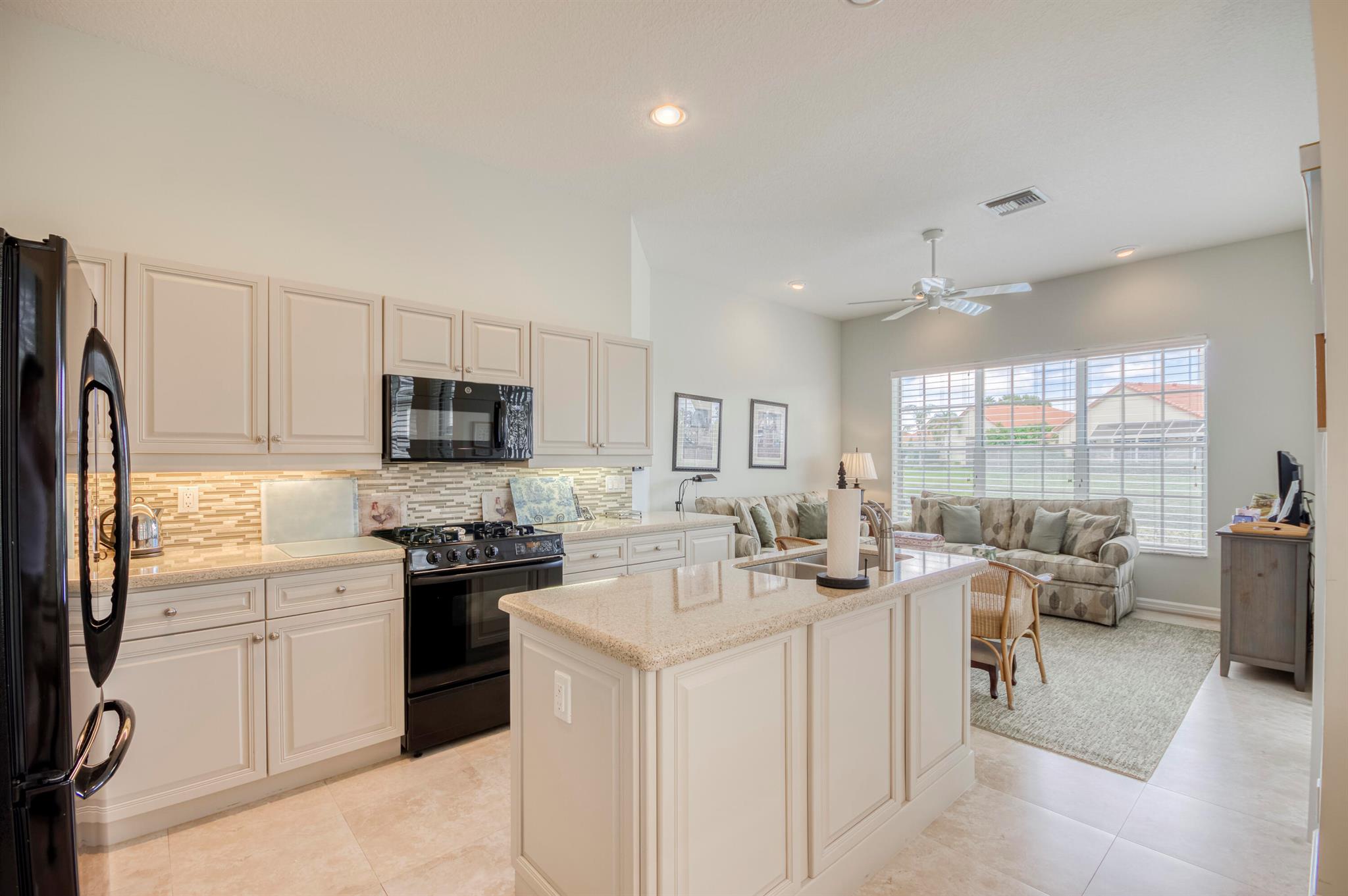Welcome to this 2,023 sq ft CBS single-family home, featuring 3 bedrooms and 3 bathrooms in the prestigious Masters at Eagleton neighborhood of PGA National. The bright living room is filled with natural light from sliding glass doors and recessed ceiling lighting, complemented by off-white walls and neutral stone-look tile. Adjacent, the formal dining area offers a chandelier, wall sconces, and recessed lighting, seamlessly connecting to the open-concept living space. The kitchen boasts linen-toned paneled cabinets, granite countertops, a neutral mosaic glass tile backsplash, black appliances, a prep island with sink and dishwasher, and a sunny breakfast nook in a bay window. The cozy family room overlooks tranquil lake views and provides access to the covered patio. A spacious office