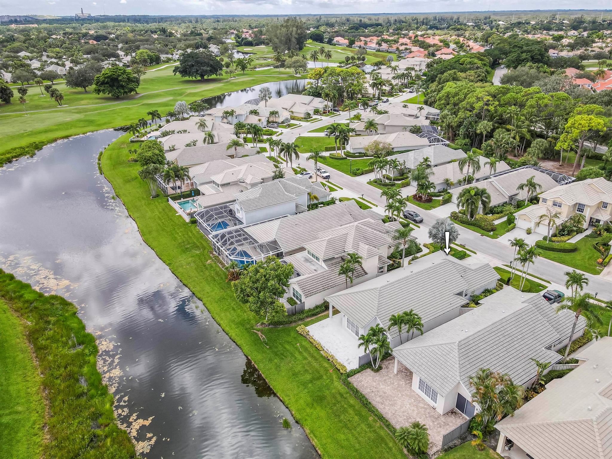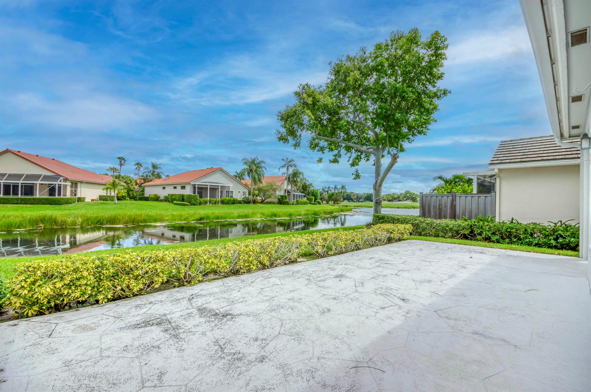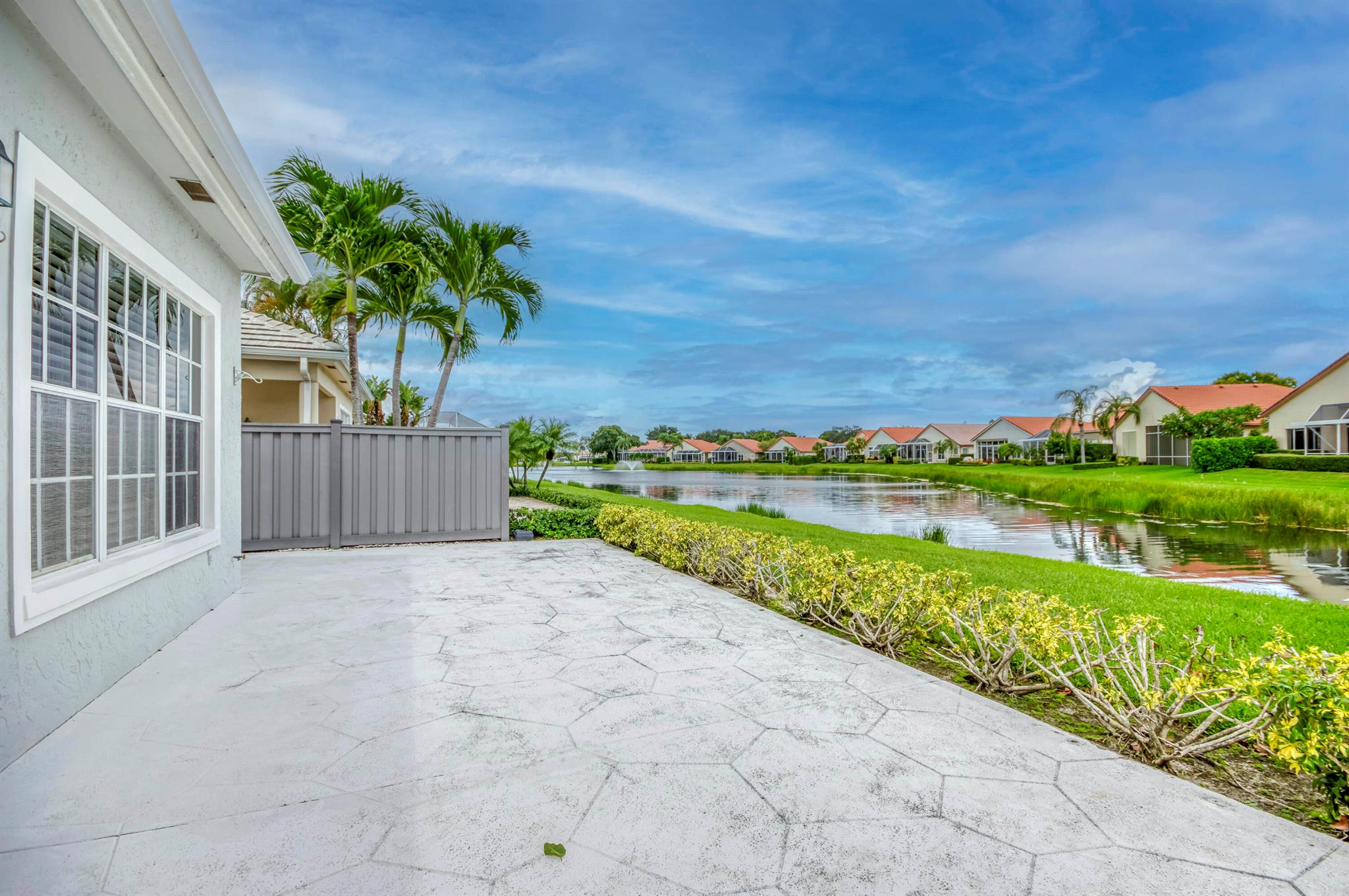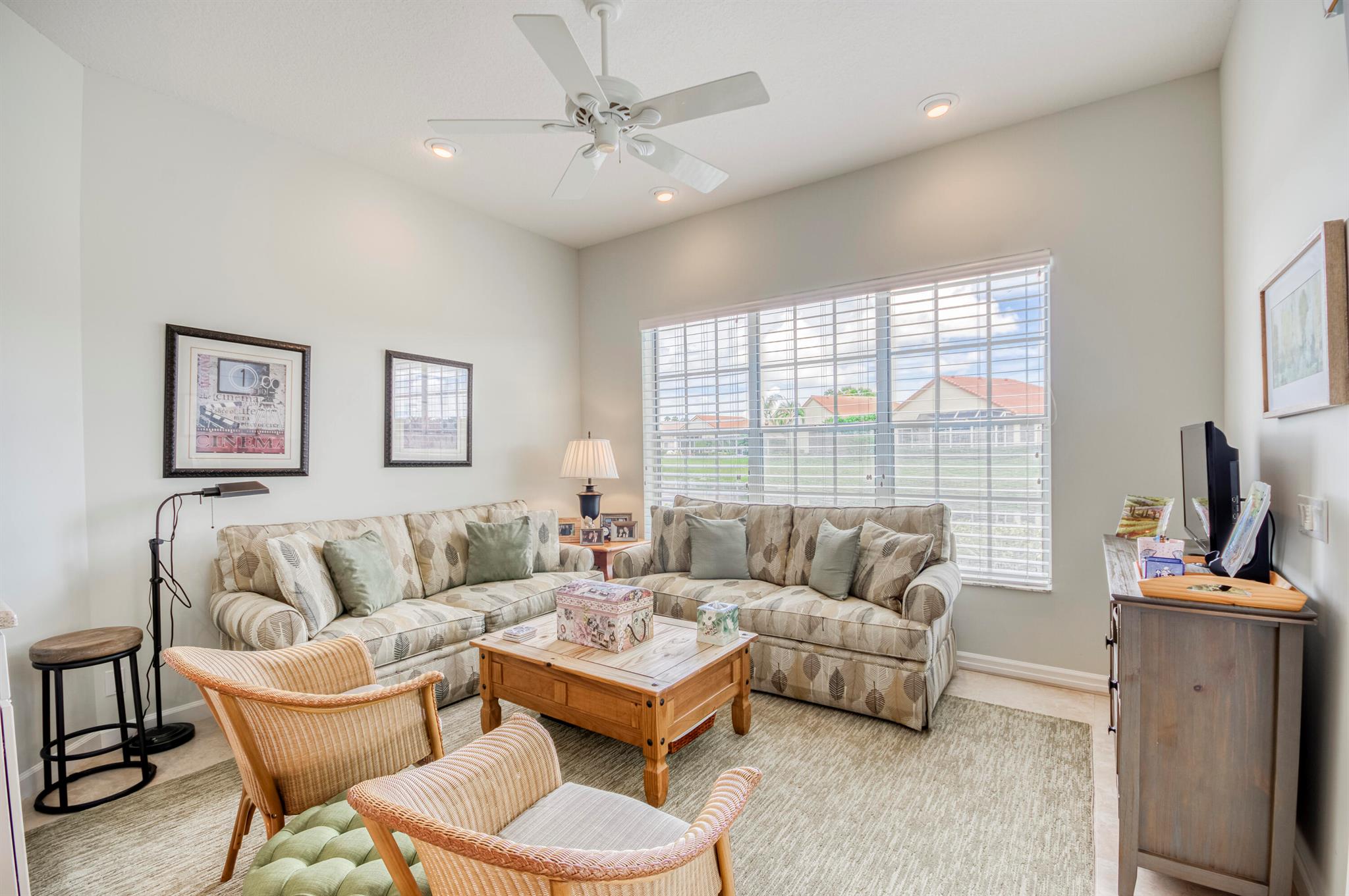 Welcome to this 2,023 sq ft CBS single-family home, featuring 3 bedrooms and 3 bathrooms in the prestigious Masters at Eagleton neighborhood of PGA National. The bright living room is filled with natural light from sliding glass doors and recessed ceiling lighting, complemented by off-white walls and neutral stone-look tile. Adjacent, the formal dining area offers a chandelier, wall sconces, and recessed lighting, seamlessly connecting to the open-concept living space. The kitchen boasts linen-toned paneled cabinets, granite countertops, a neutral mosaic glass tile backsplash, black appliances, a prep island with sink and dishwasher, and a sunny breakfast nook in a bay window. The cozy family room overlooks tranquil lake views and provides access to the covered patio. A spacious office