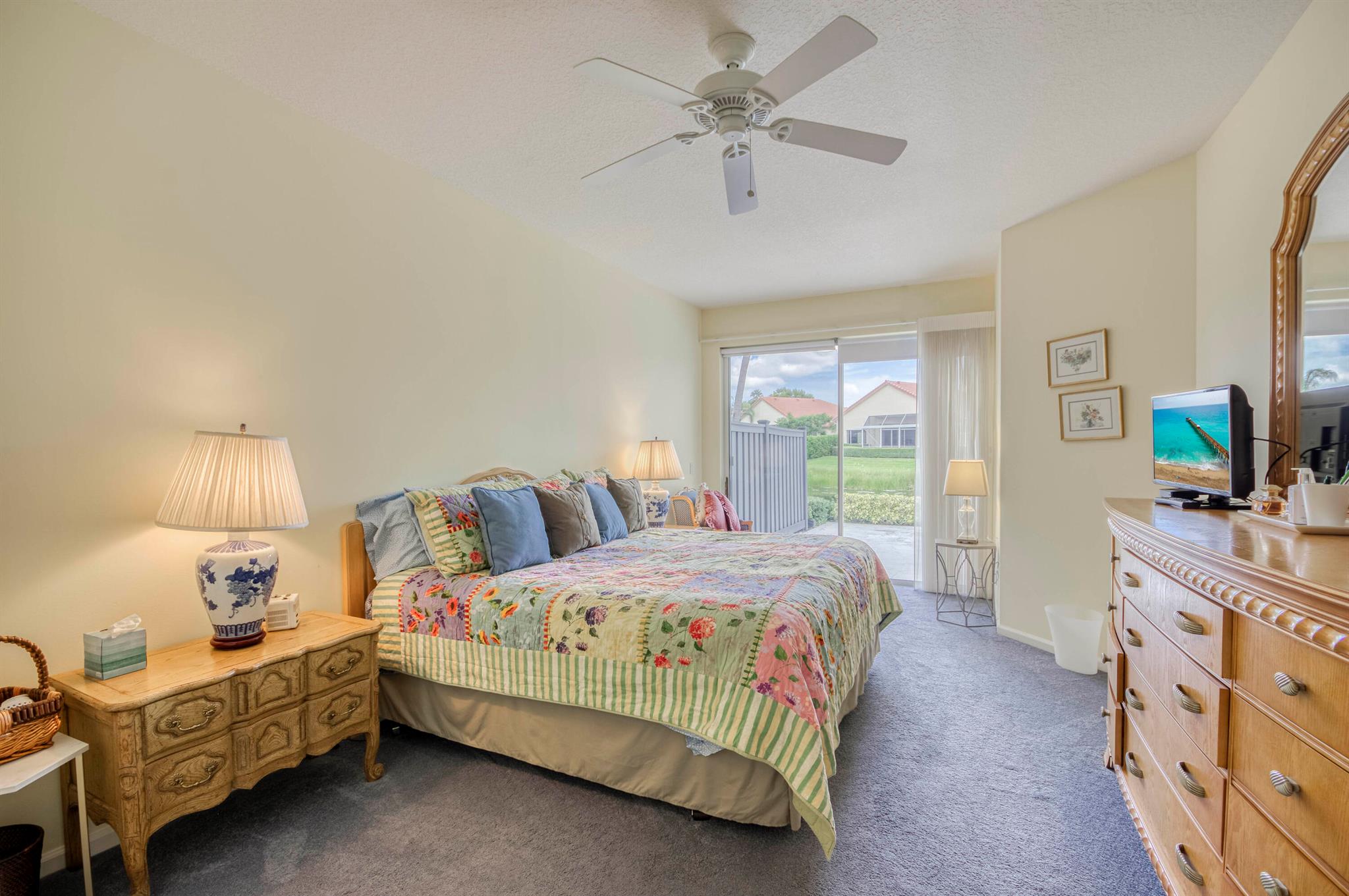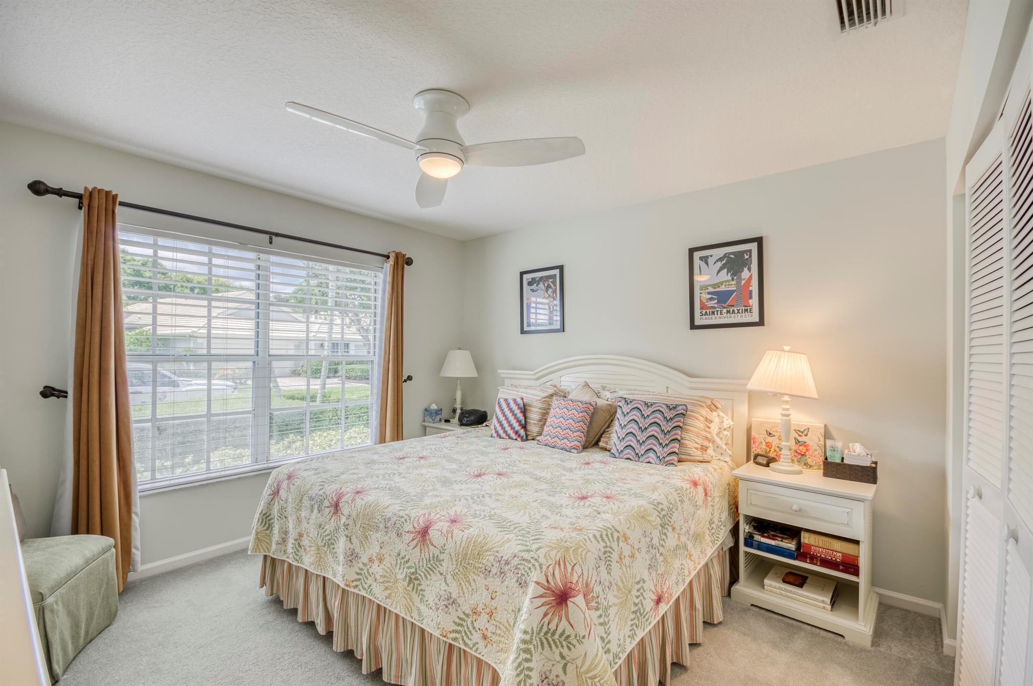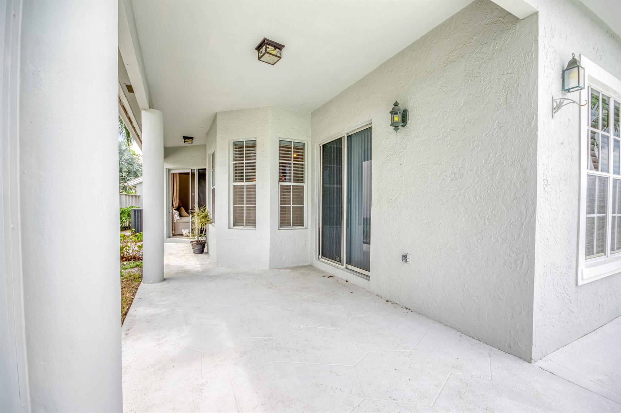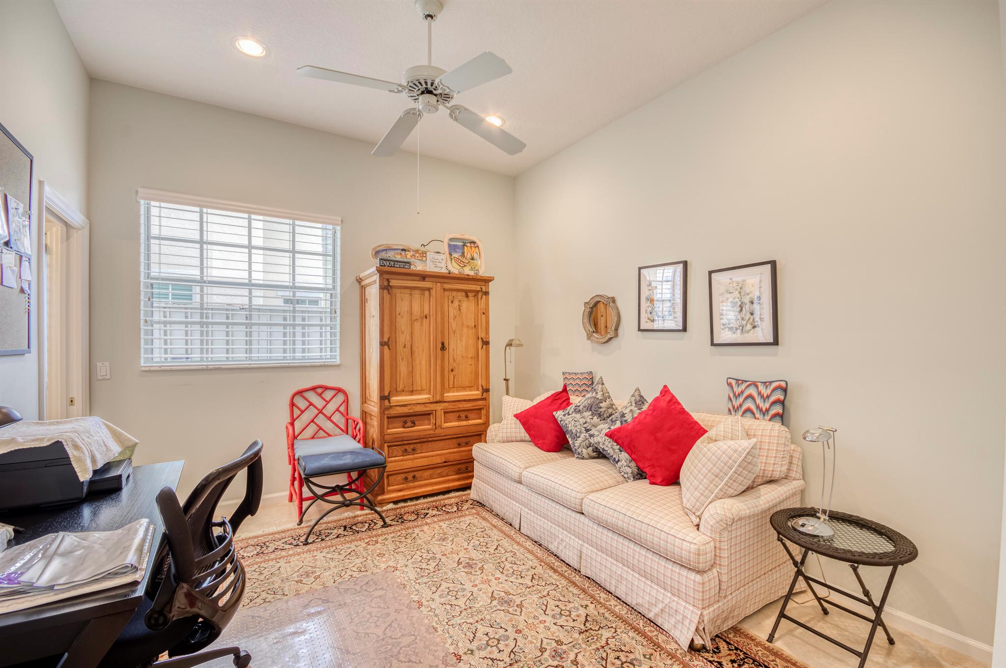 Welcome to this 2,023 sq ft CBS single-family home, featuring 3 bedrooms and 3 bathrooms in the prestigious Masters at Eagleton neighborhood of PGA National. The bright living room is filled with natural light from sliding glass doors and recessed ceiling lighting, complemented by off-white walls and neutral stone-look tile. Adjacent, the formal dining area offers a chandelier, wall sconces, and recessed lighting, seamlessly connecting to the open-concept living space. The kitchen boasts linen-toned paneled cabinets, granite countertops, a neutral mosaic glass tile backsplash, black appliances, a prep island with sink and dishwasher, and a sunny breakfast nook in a bay window. The cozy family room overlooks tranquil lake views and provides access to the covered patio. A spacious office
