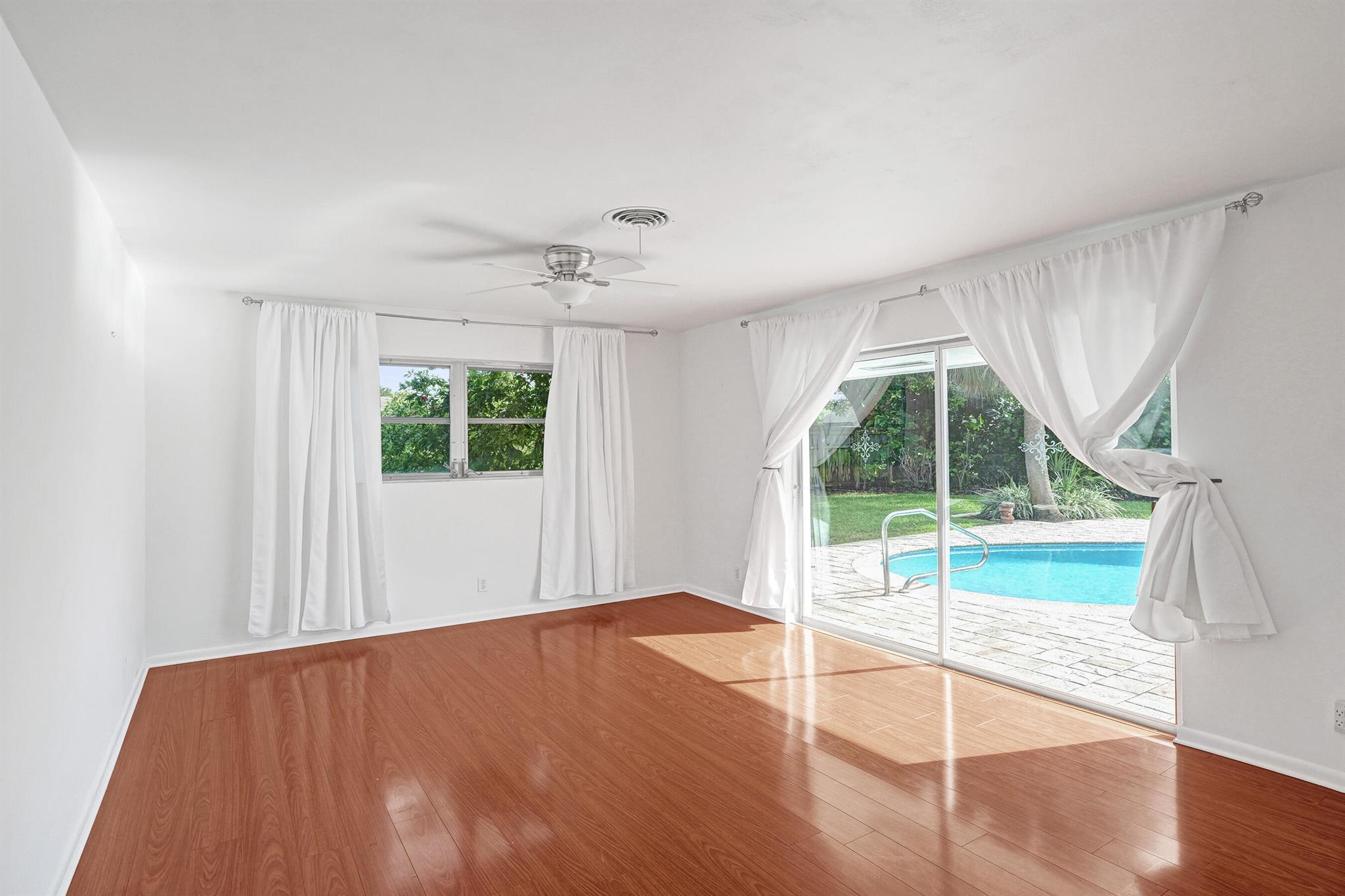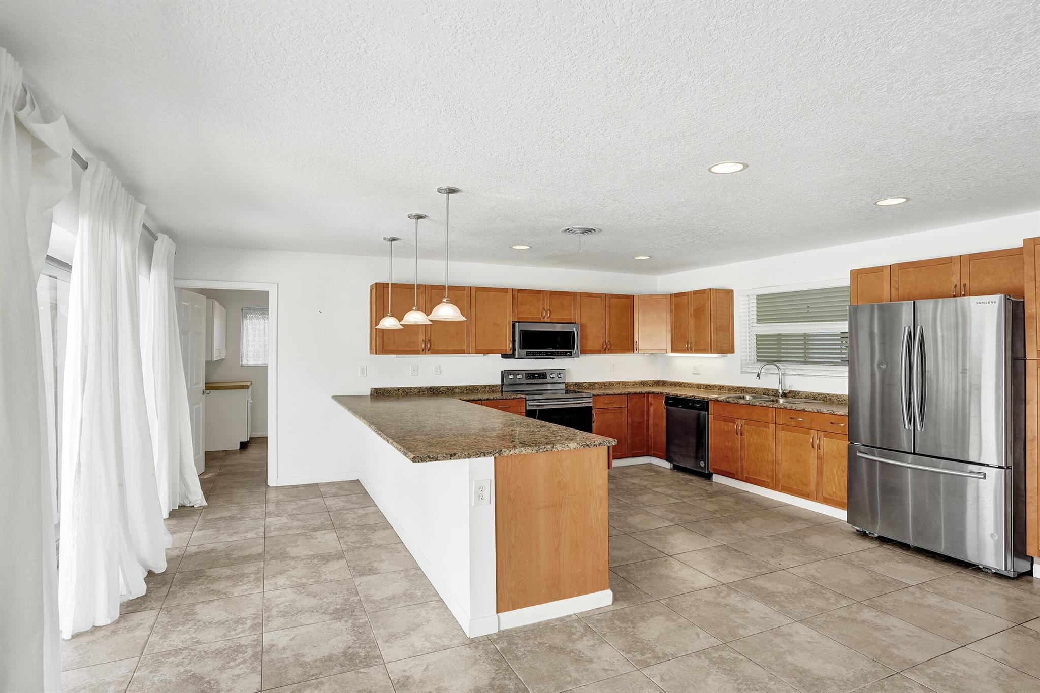 This exquisite three bedroom two bath pool home captures the true essence of East Boca living, perfectly positioned on a peaceful street just minutes from the Atlantic Ocean. With a freshly painted exterior and interior, the residence exudes warmth and sophistication while offering a spacious open floor plan filled with natural light. The massive kitchen, equipped with stainless steel appliances and abundant counter space, flows seamlessly into the living areas, creating a welcoming environment for both family and guests. The property has been thoughtfully upgraded with a newer AC and HVAC system, a new hot water heater, and elegant Bahama shutters. Step outside to a resort-style backyard where a completely redone pool (2025) is surrounded by lush tropical landscaping, an oversized fully