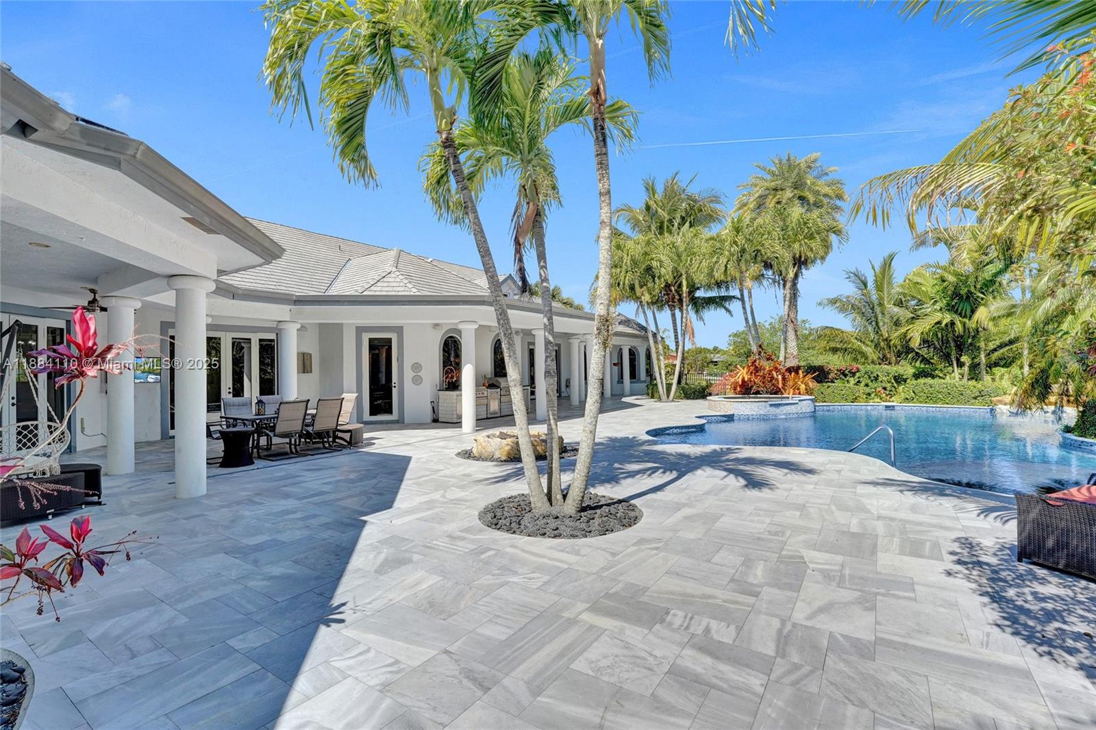 Set on 2 plus acres in Rolling Oaks, this custom 5,965-SF estate blends volume, light, and indoor-outdoor living. Built in 2007 (flat-tile roof 2008), the 4-bed/5.5-bath plan features impact glass/doors, soaring ceilings, and an open layout. Chef’s kitchen with island, premium appliances (gas range, wall oven, separate freezer), and formal/casual dining. The main-level primary suite offers a sitting area, dual closets, and a spa bath with a separate tub/shower. Flexible spaces include an office, family room, media/loft, in-law quarters, and large laundry. Outdoors: 40'×25' pool with whirlpool, summer kitchen with built-in grill, expansive patio, fruit trees, fenced grounds, circular drive, and 3-car garage. Well water; septic.