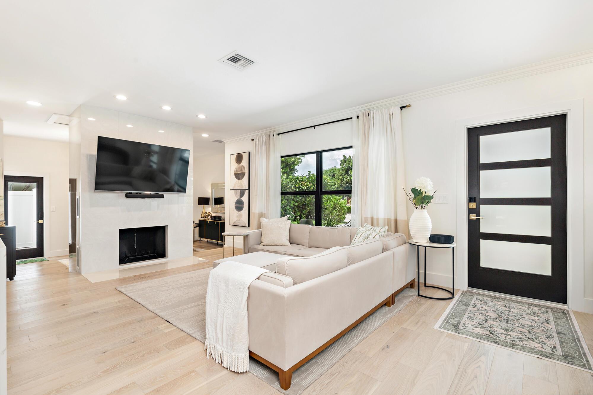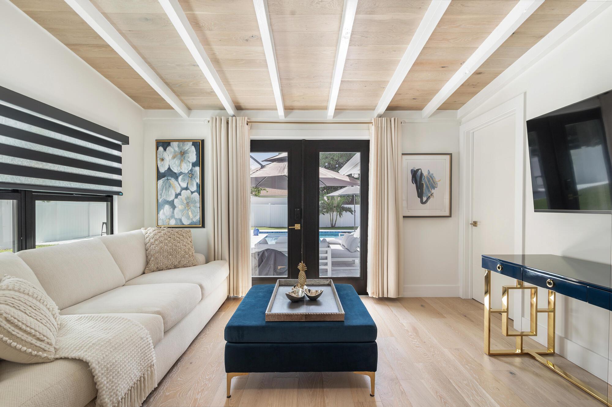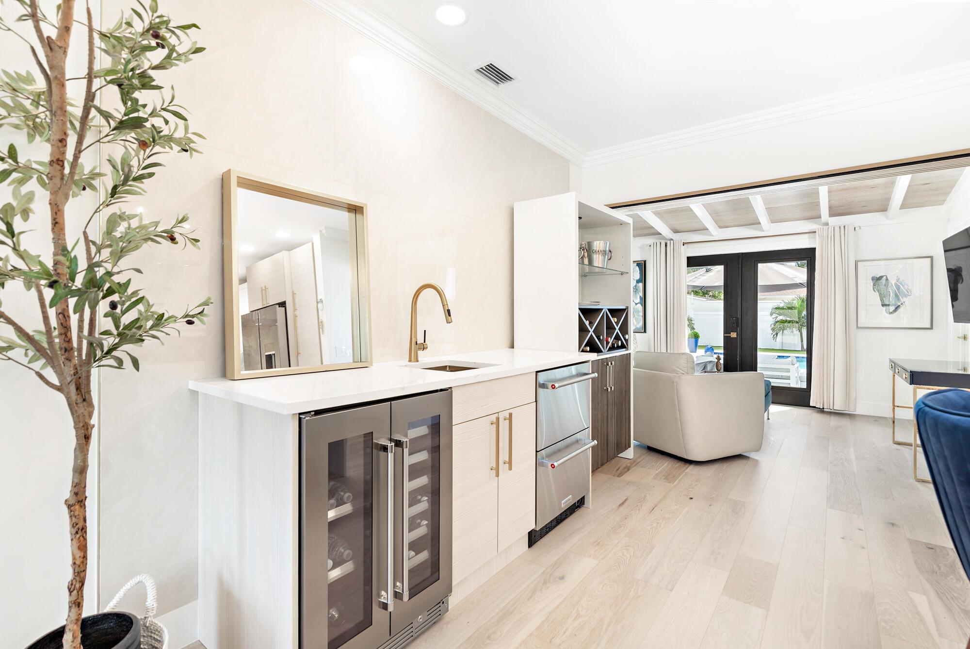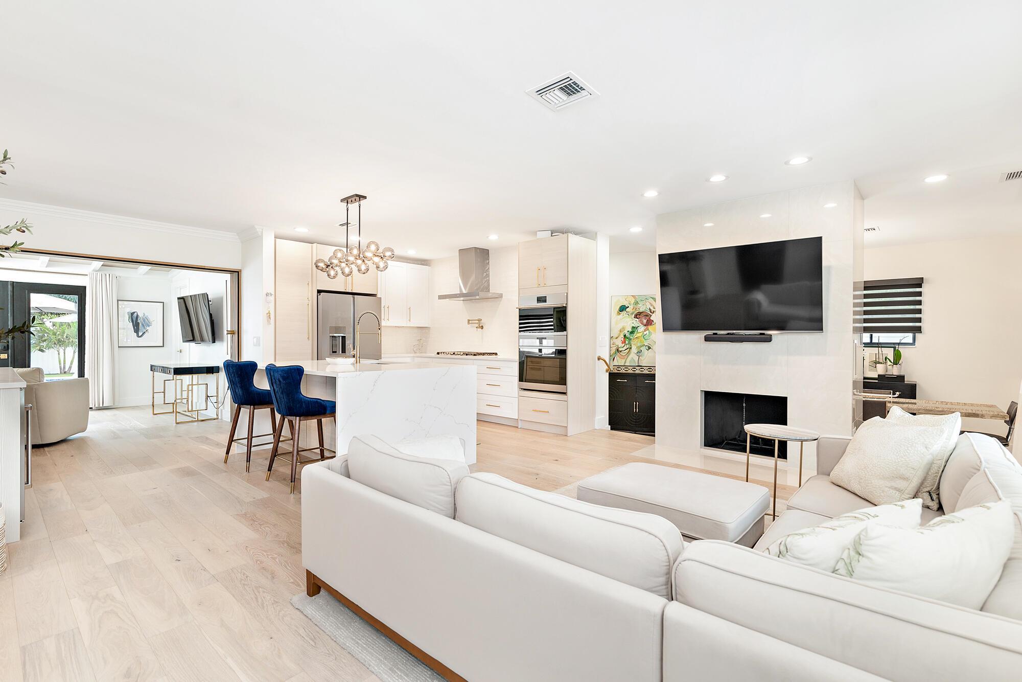 This beautifully renovated one-story residence, set on an oversized 9,750 sq. ft. lot, offers 3 bedrooms, 3 baths, and a thoughtful layout designed for modern living and effortless entertaining. Step inside to find a light-filled interior where recent updates elevate every space. New tinted impact windows, custom wood flooring, updated lighting with dimmer and Alexa-enabled switches, and custom cabinetry throughout create a refined yet comfortable atmosphere. The inviting living room features a wood-burning fireplace and a custom coffee bar, while the dining area and sunroom are adorned with electric window treatments. The chef's kitchen is equipped with Platinum Cafe GE appliances, a gas range with pot filler, wet bar with wine fridge, two-drawer fridge/freezer, and all new plumbing and