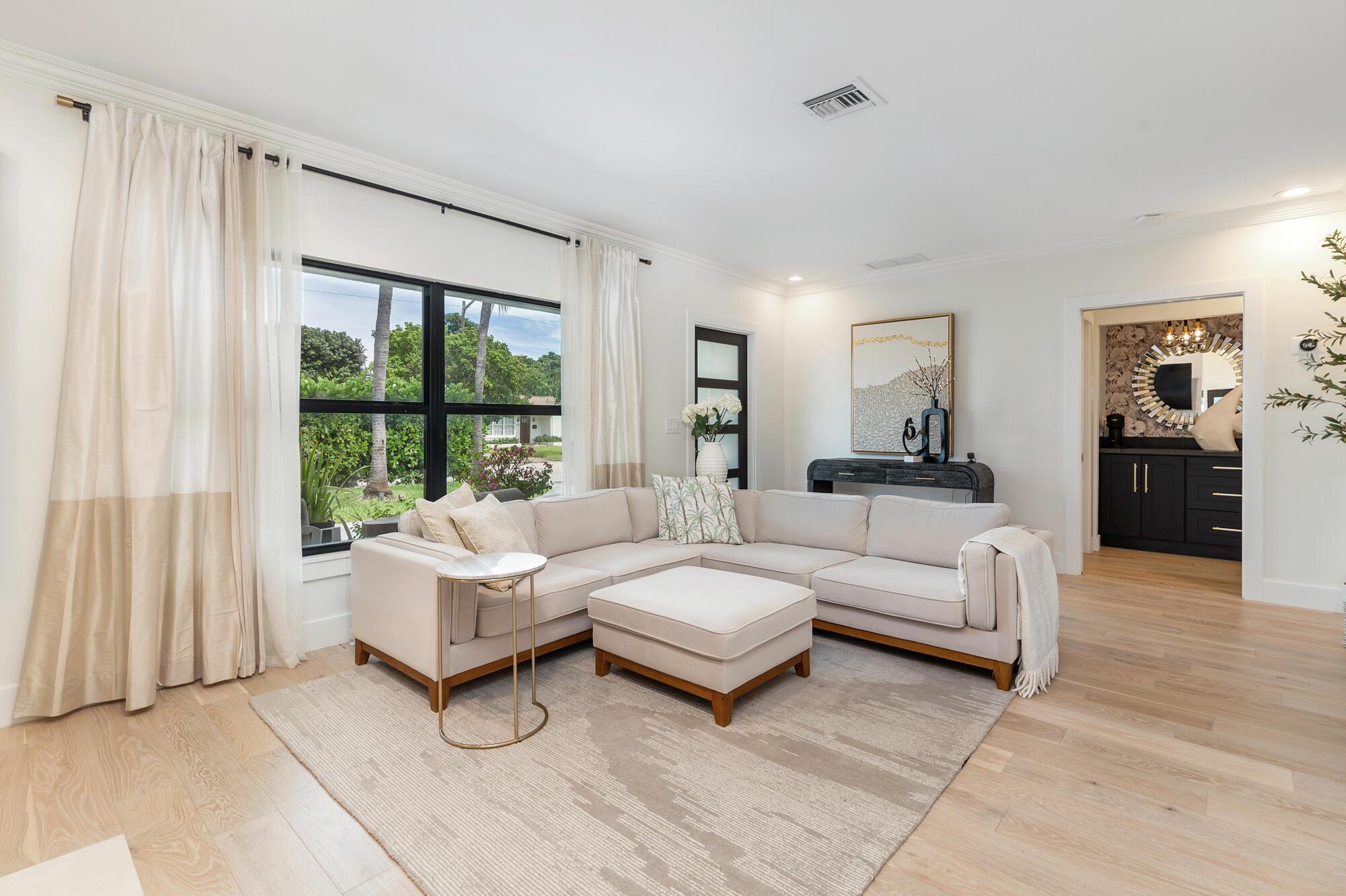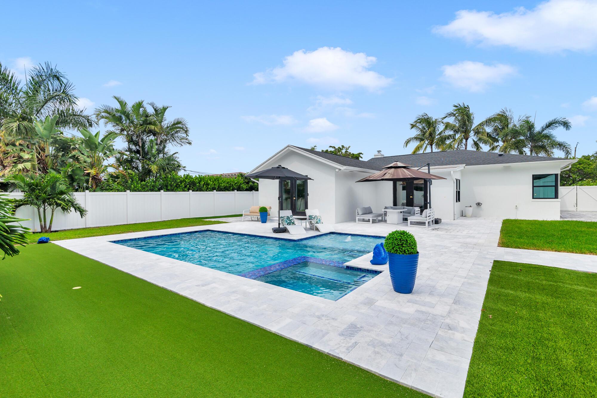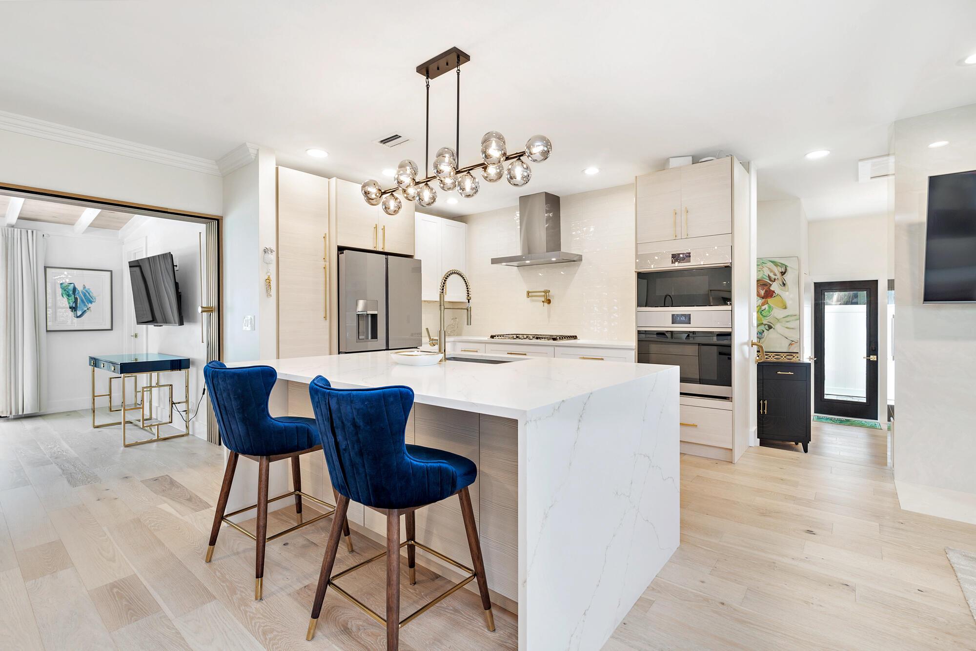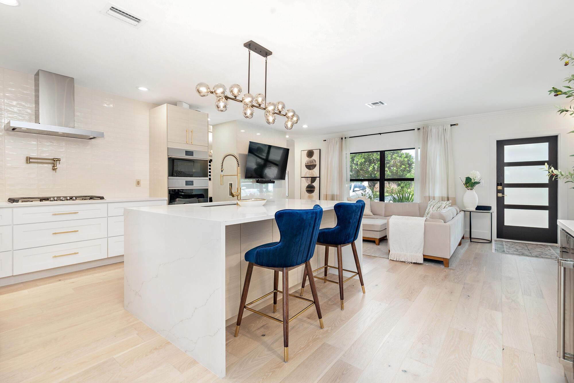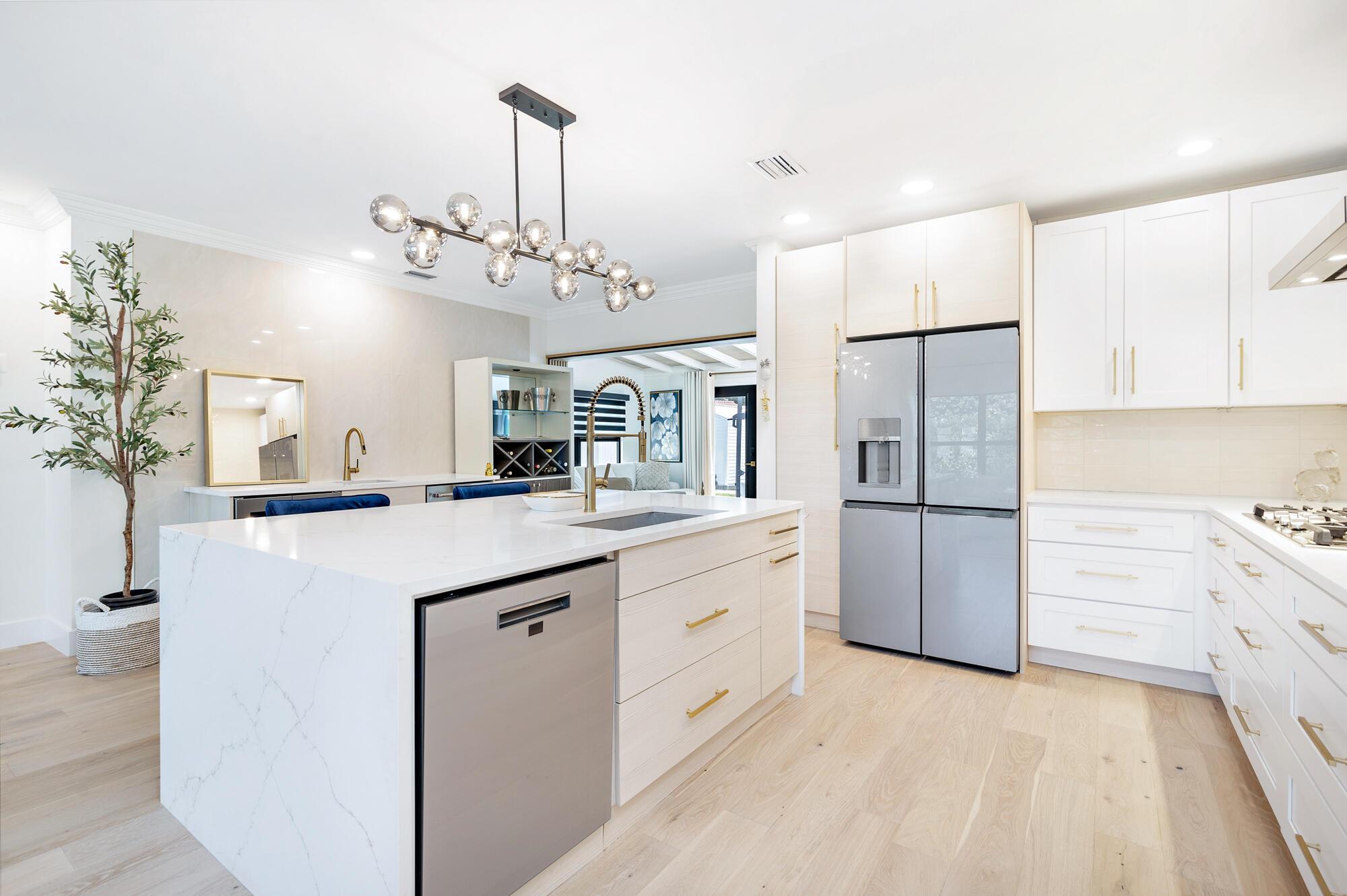 This beautifully renovated one-story residence, set on an oversized 9,750 sq. ft. lot, offers 3 bedrooms, 3 baths, and a thoughtful layout designed for modern living and effortless entertaining. Step inside to find a light-filled interior where recent updates elevate every space. New tinted impact windows, custom wood flooring, updated lighting with dimmer and Alexa-enabled switches, and custom cabinetry throughout create a refined yet comfortable atmosphere. The inviting living room features a wood-burning fireplace and a custom coffee bar, while the dining area and sunroom are adorned with electric window treatments. The chef's kitchen is equipped with Platinum Cafe GE appliances, a gas range with pot filler, wet bar with wine fridge, two-drawer fridge/freezer, and all new plumbing and