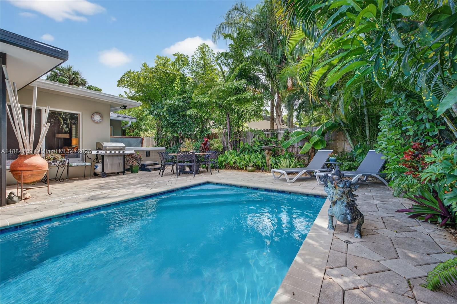 Immaculate home in Jenada Isles, a private island community of just 85 homes in Wilton Manors — No HOA Dues. This spacious 3BR/2BA, 2 Car Garage residence has been top-to-bottom renovated with mud-set porcelain tile floors, hurricane-impact windows/doors, plantation shutters, a remote shade system, and a premium silver barrel roof. Enjoy a heated gunite salt pool & jacuzzi in a private, fully fenced backyard oasis with screened porch, outdoor shower, and lush tropical landscaping. Equipped with a gas range stove and a generator. Located in a gated, video-monitored community, minutes from Wilton Drive dining, shopping, nightlife & beaches. A true island retreat.