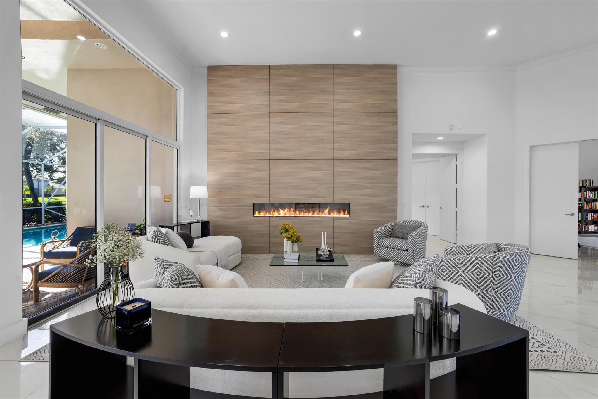 Welcome to this stunning 4BR/3.1BA home with a large office right at the entrance in the exclusive Stonebridge Country Club. Offering 3,729 sq ft of living space on a 12,502 sq ft waterfront lot with a private pool, this residence creates a powerful first impression the moment you enter. Soaring ceilings and walls of glass fill the living areas with natural light, framing panoramic views of the golf course, shimmering lake, and resort-style pool!The floor plan is thoughtfully designed for both comfort and versatility. A spacious bath serves two bedrooms, while another bedroom features an ensuite cabana bath, ideal for guests or flexible living. The primary suite is a private retreat with dual walk-in closets, an oversized spa-like bathroom, and tranquil views of the pool and sun