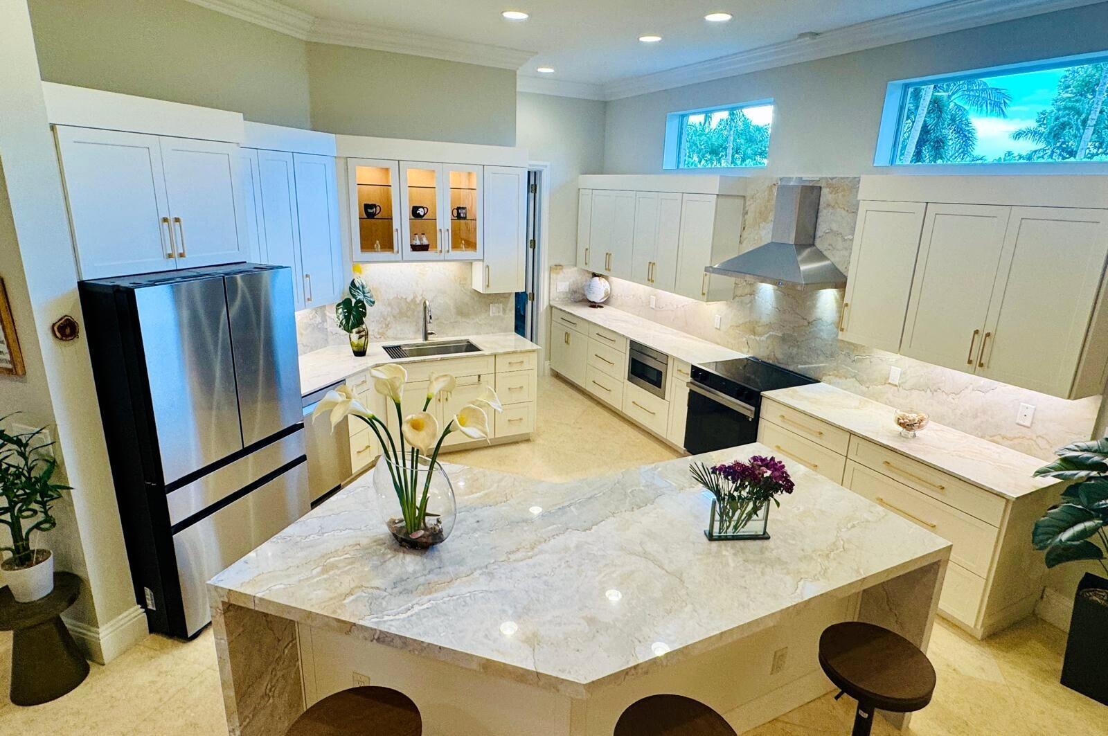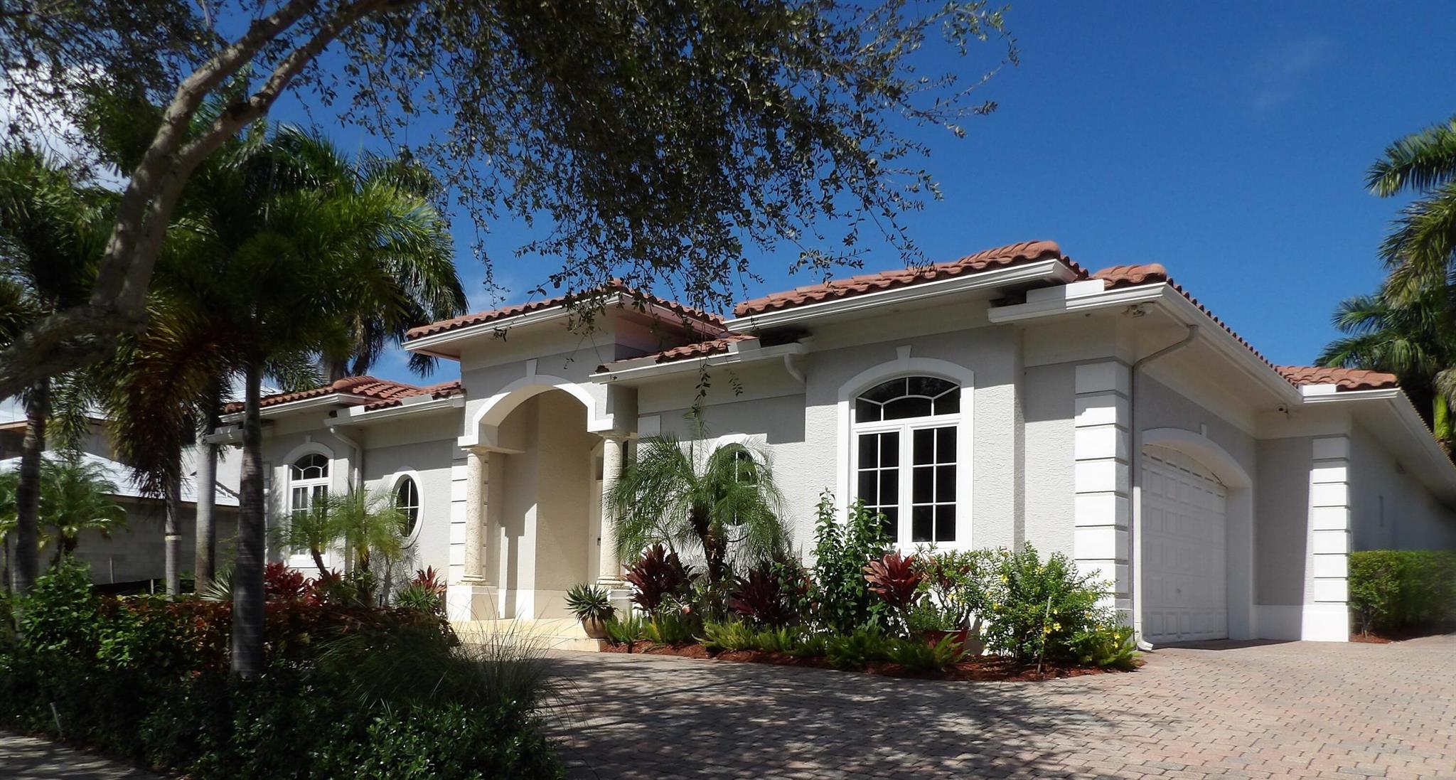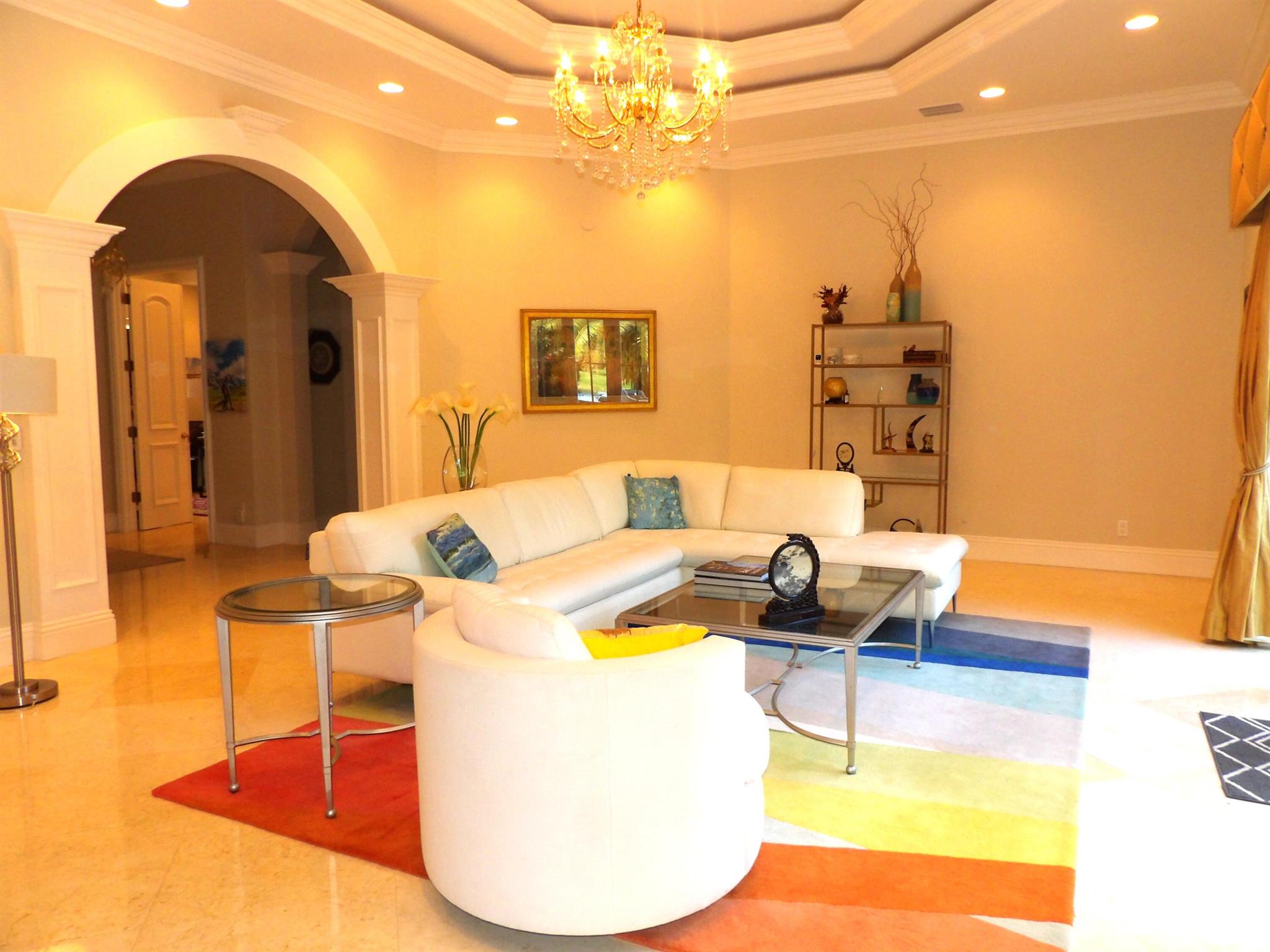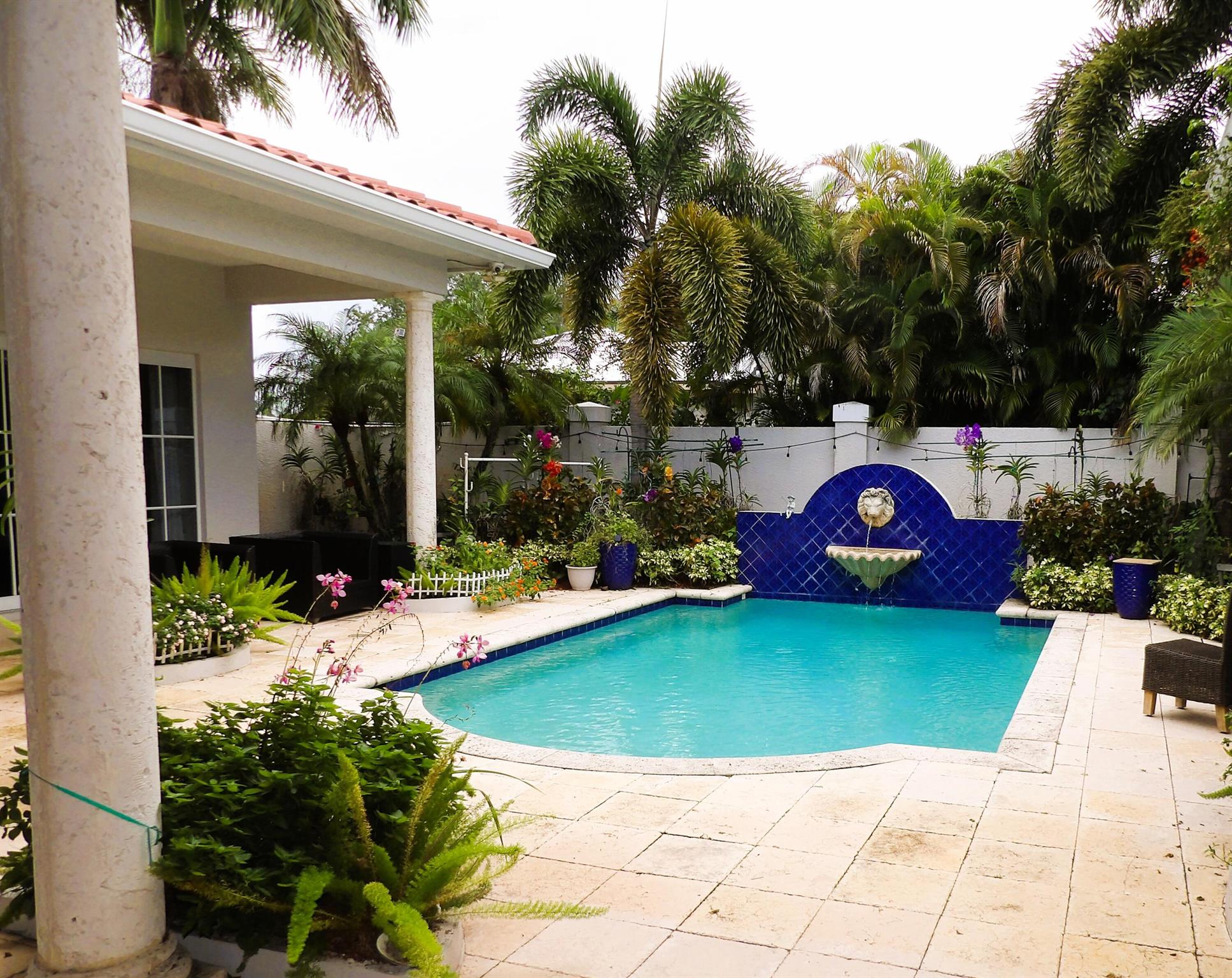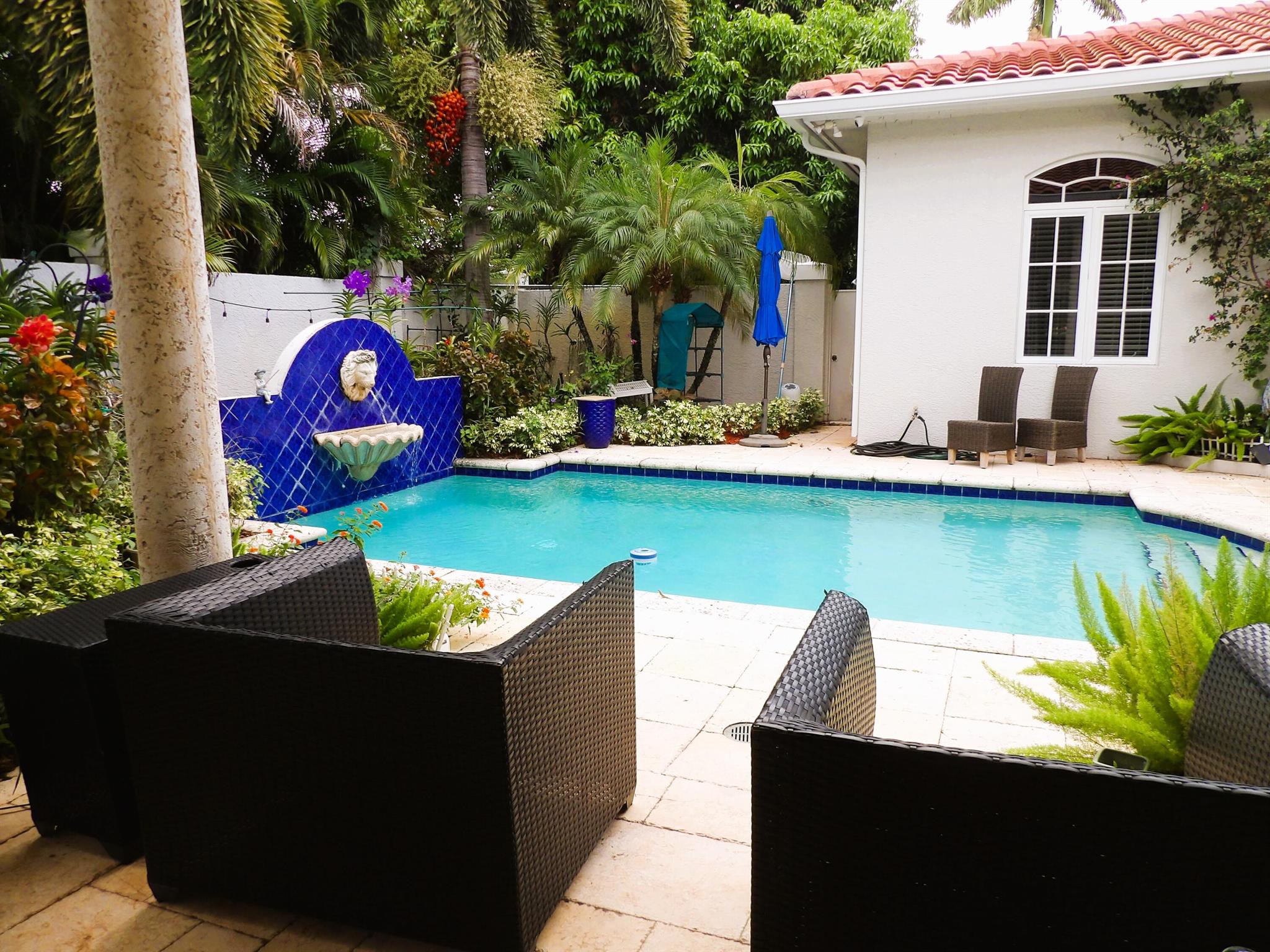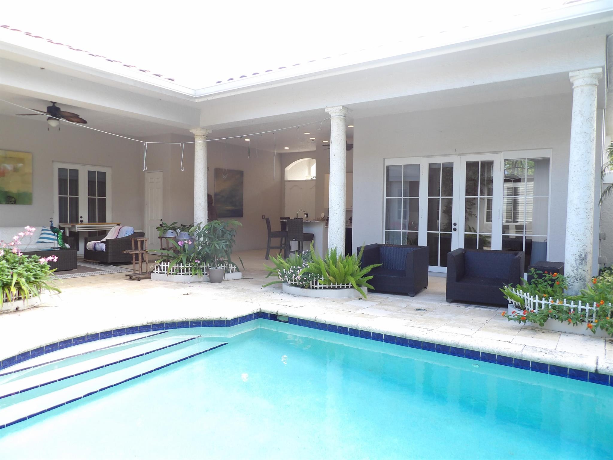 Elegant custom estate in prestigious Presidential Estates, built in 2008 with hurricane-safe construction rated to 240 mph. This home offers 4 spacious bedrooms, an office, and 3.5 baths. The classically center courtyard true private retreat features a private guest quarters, pool, fountain, and summer kitchen--perfect for entertaining or relaxing. Inside, a brand-new quartzite gourmet kitchen pairs with solid wood cabinetry, seemles tile flooring. Elegant details include Egypcian marble thougout, Swarovski crystal chandeliers, and gold accents for timeless sophistication. Set on a 110x137 lot plus a 1/4-acre canal easement with direct access to Lake Mangonia, two kayaks included. Just minutes to downtown, beaches, airport, and premier shopping. This home offers both luxury and convenience