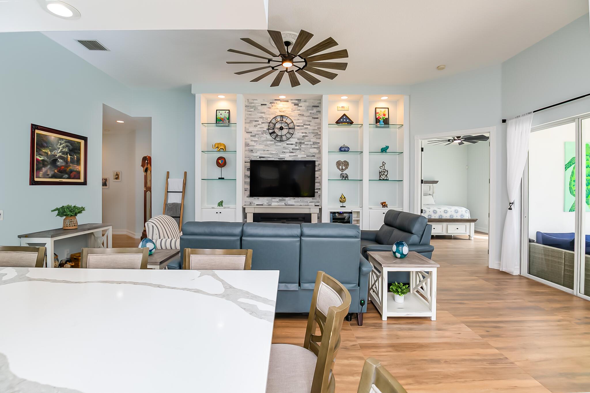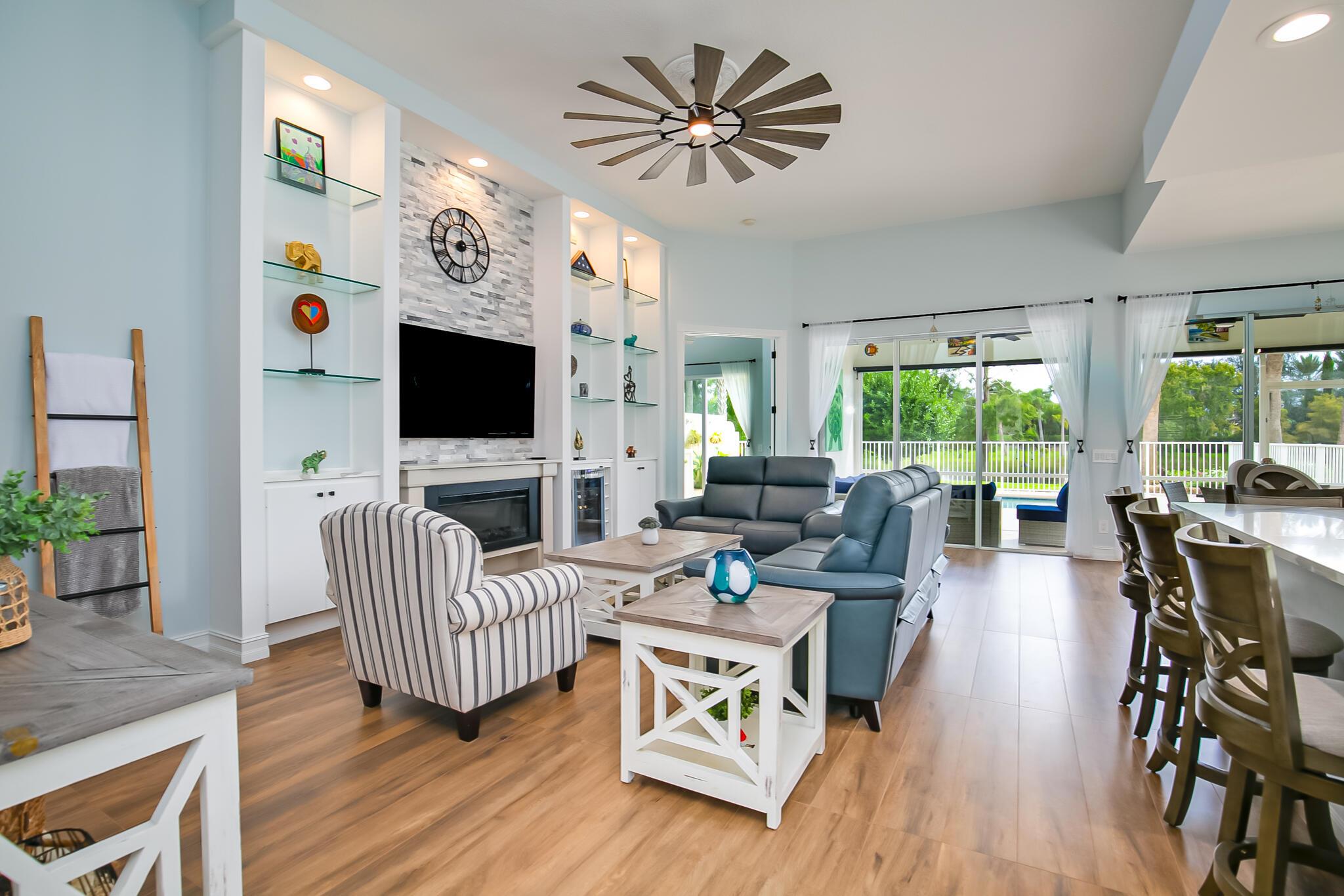 Nestled on a premium lakefront lot, this beautifully remodeled Oakmont model with pool offers one of the finest locations & views in the community. The outdoor living area features an open-air pool with tranquil lake views, screened patio with travertine tile, roll down shades, accordion shutters on side & rear windows, lush custom designed landscaping & a welcoming extended paver driveway. Completely renovated in 2022, this move-in ready home showcases modern, stylish updates throughout. The kitchen is a showstopper with custom cabinetry featuring pull-out drawers, quartz countertops, designer tile backsplash, stainless steel appliances, upgraded sink, & contemporary lighting, fans, & hardware. The primary suite is equally impressive, offering a spa-like bath with soaking tub,...see more