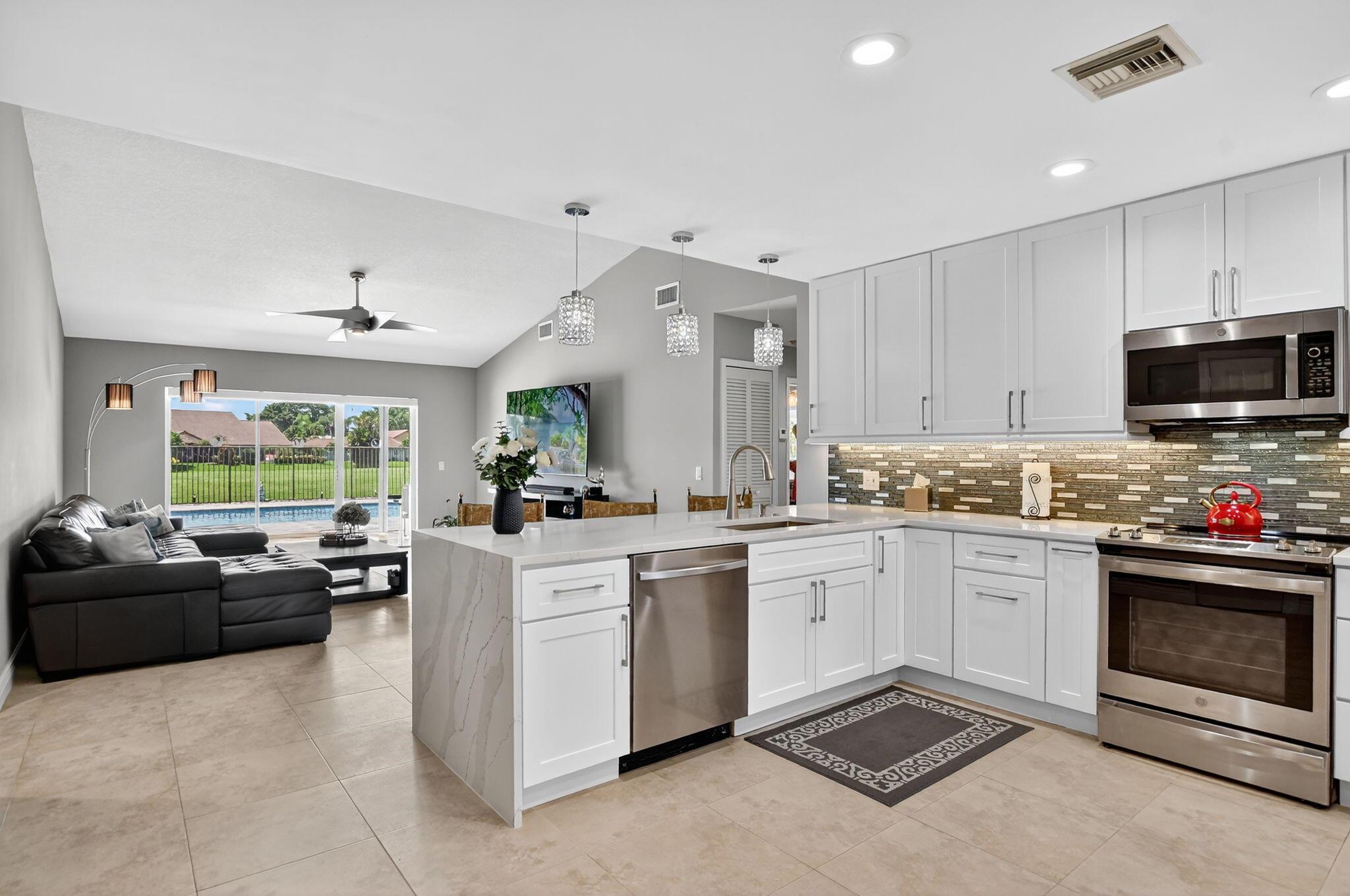 Contemporary and move in ready, recently renovated open kitchen with stainless steel appliances light and bright family room overlooking exquisite pool patio area with water and golf vistas. Everything you have been looking for, formal living and dining rooms, light and bright bedrooms, on a quiet interior lot. This community is also the home of the Boca Greens Golf Club. All residents can play the course on a pay for play basis. No membership is required. Premium cable package and high speed Internet included the low homeowners fee.