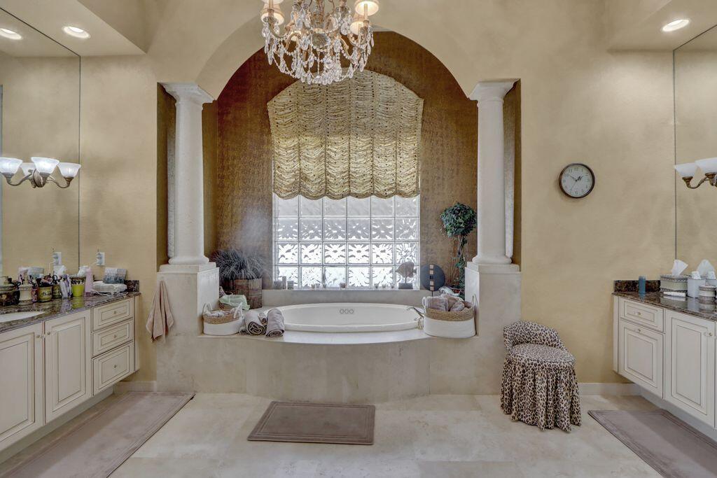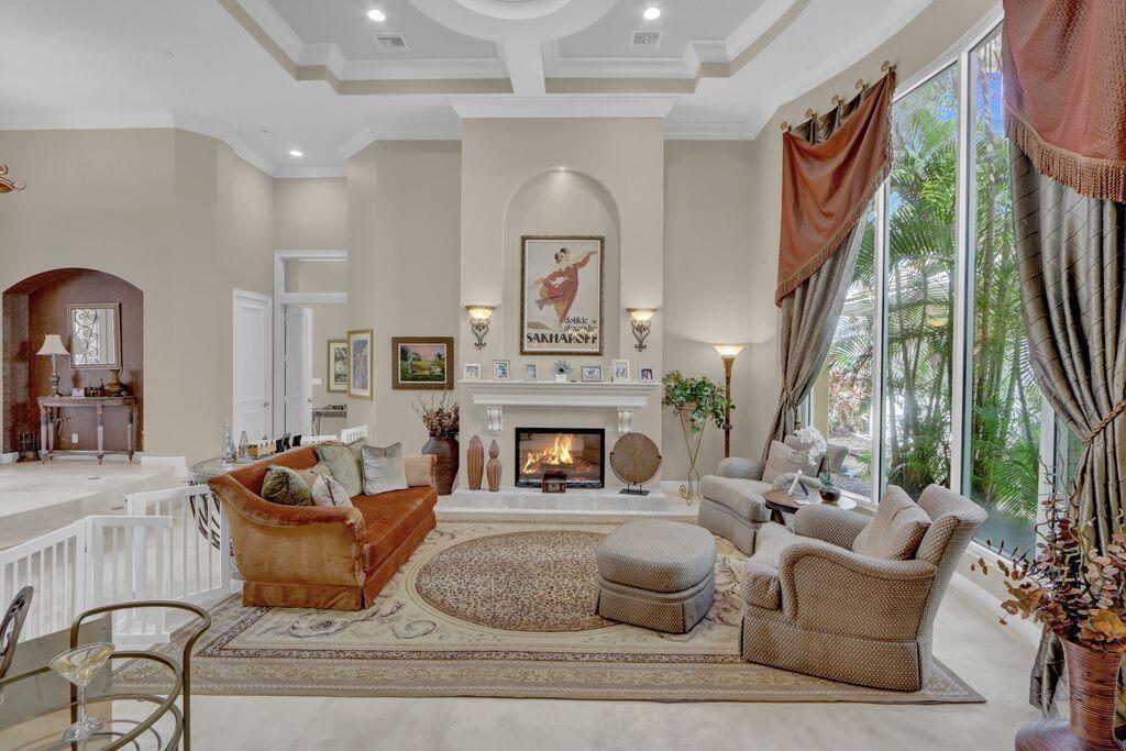 GOLF MEMBERSHIP AVAILABLE & CAN CLOSE BY OCT 31! Don't miss this opportunity for a GOLF MEMBERSHIP DAY 1 before the increase in initiation & transferability. This charming one-story courtyard of 3 bedrooms + office, 31/2 baths & 3-car garage is elegant & tastefully appointed featuring volume ceilings with crown moldings; Saturnia marble floors & neutral carpet; an inviting Living Room with an electric fireplace & wet bar; Family Room entertainment center; built-in office in Bedroom 4; solid core molded doors; custom window drapes & shades.The kitchen features maple cabinetry, granite counters,tumbled marble backsplash,butler's pantry and charming breakfast nook. Roof-2022; water heater-2023; pool resurfaced & tiles-2023; circular driveway;epoxy garage floor; accordion hurricane shutters.