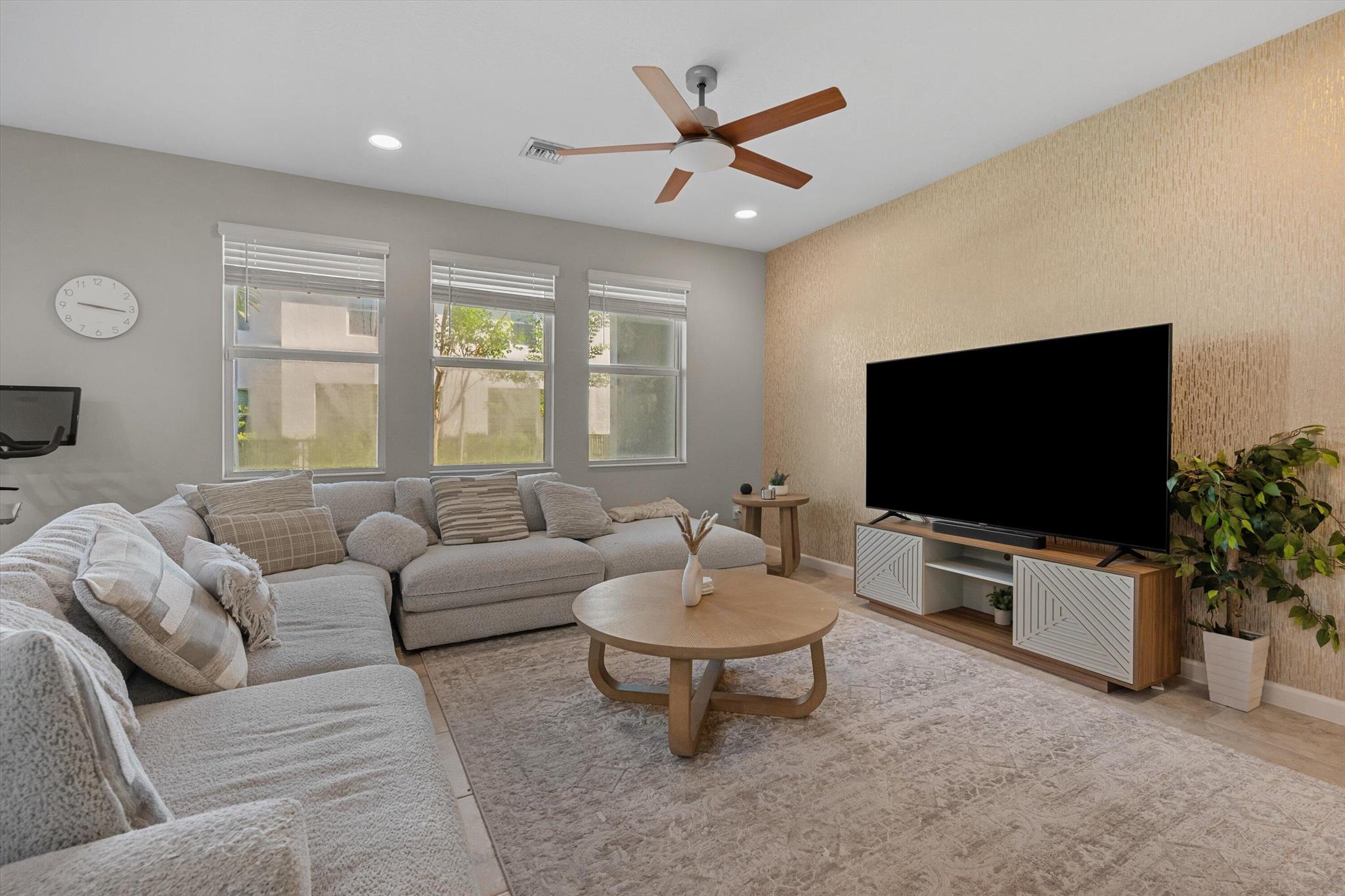 Welcome to the highly sought-after Biscayne model in The Crossings community in Westlake, FL! This spacious three-bedroom, two-and-a-half bathroom, two-story townhouse offers modern style and an inviting open layout. Step through the striking black front door into a bright first floor with tile flooring throughout and an expansive living room, a separate dining area, and abundant natural light. The chef's kitchen showcases rich brown shaker cabinets, granite countertops, stainless steel Whirlpool appliances, and a large island with ample storage--perfect for entertaining or family gatherings. A convenient powder bath is also located downstairs.
