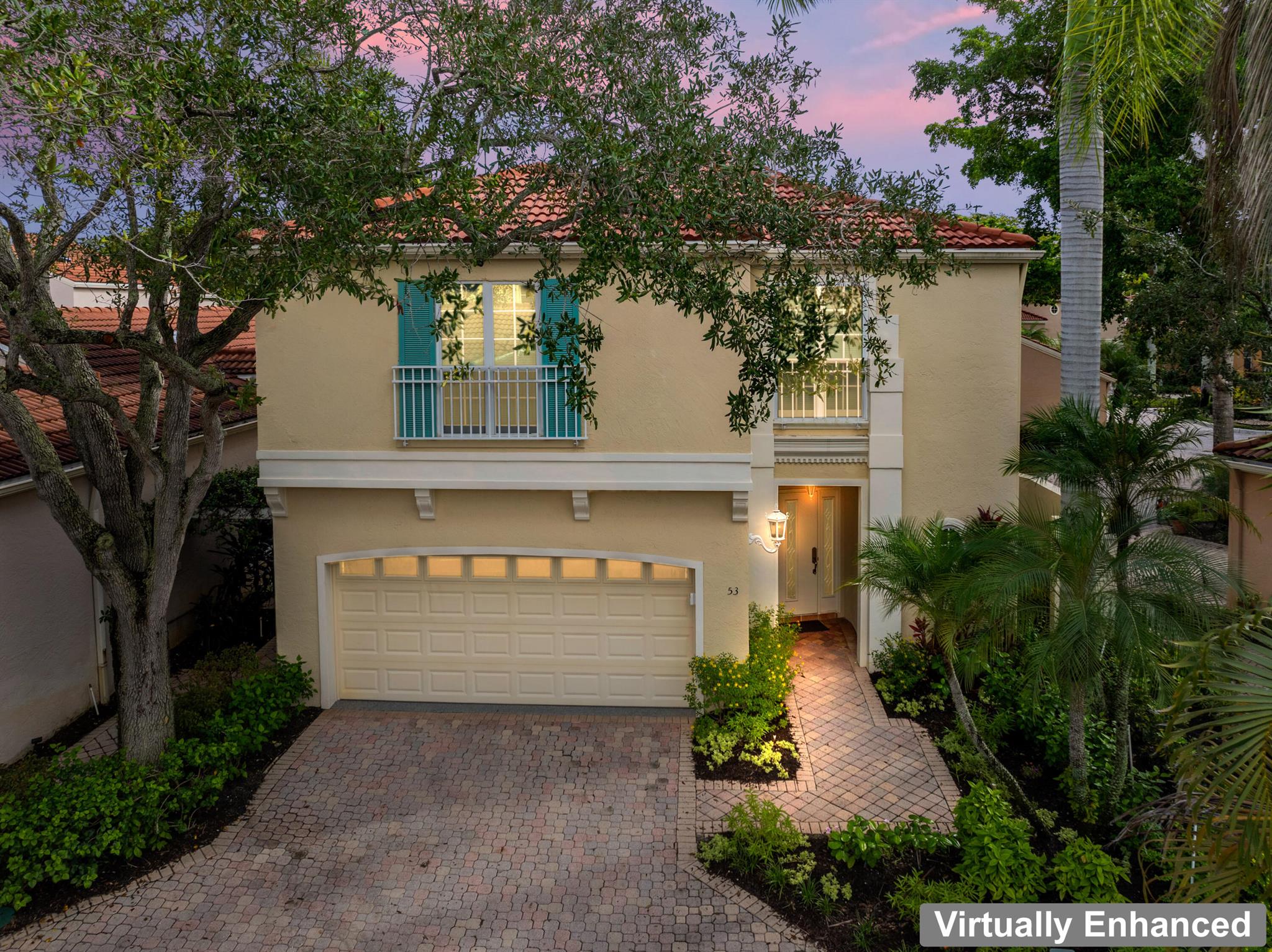 Immaculate 3BR/2.5BA home in Villa d' Este at PGA National. Features include a gourmet island kitchen, tile & wood floors, 2-car garage, cement S-tile roof (2016), and Max Guard impact windows/doors. Set on a cul-de-sac within a decorative piazza, with cobblestone streets and walking paths. Mediterranean charm meets modern comfort in a sought-after community.