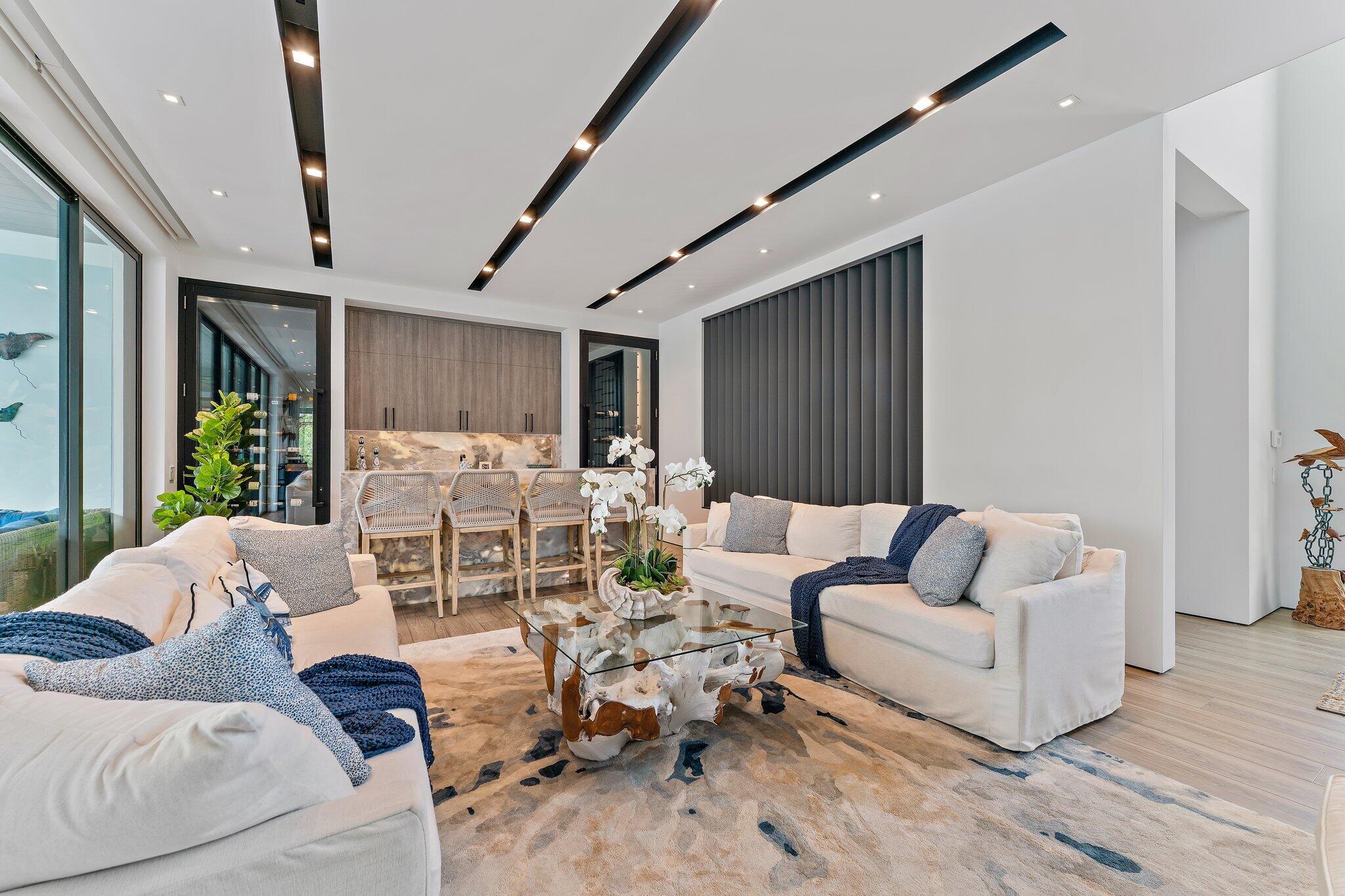 Located on a peninsula lot of 1.33 acres with 500 feet of deep waterfrontage on three sides with no fixed bridges, this truly is one of the finest waterfront properties in our area. Custom built in 2021 by Ocean Blue Custom Homes, this signature estate in the luxury, gated community - The Islands of Jupiter, meets the demands of the most sophisticated clients. Floor to ceiling walls of glass brings the outside in, offering a ''light and bright'' texture to a modern coastal interior palette. Views to the pool with spa, summer kitchen with bar, dock with two lifts, professional landscaping, and expansive backyard with endless artificial turf; all define a dreamlike setting for a family retreat. The current owner made the following additions/upgrades within the past 12 months: