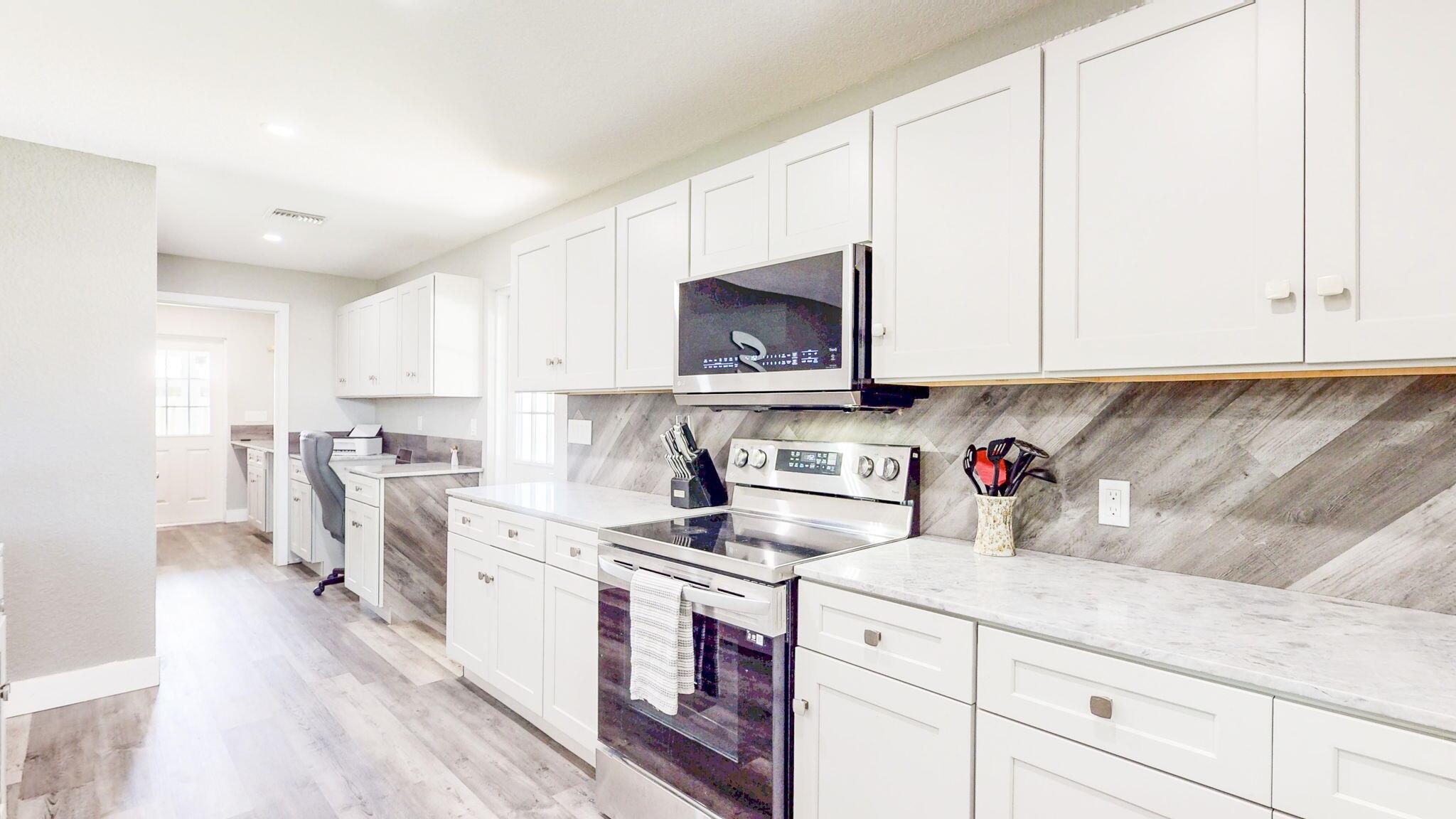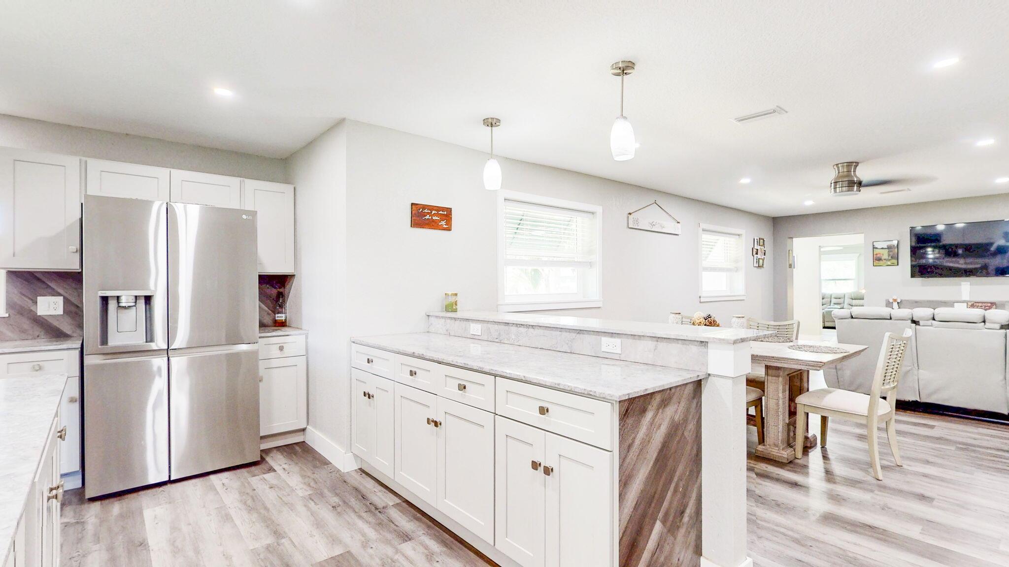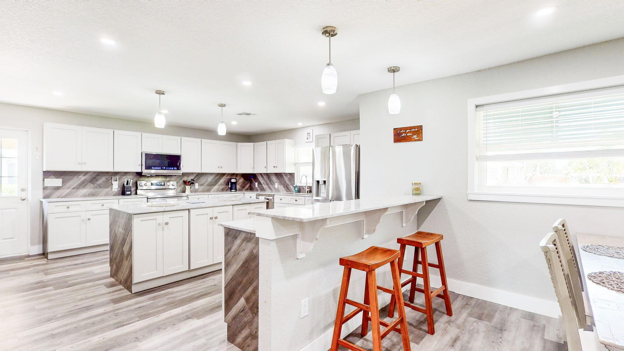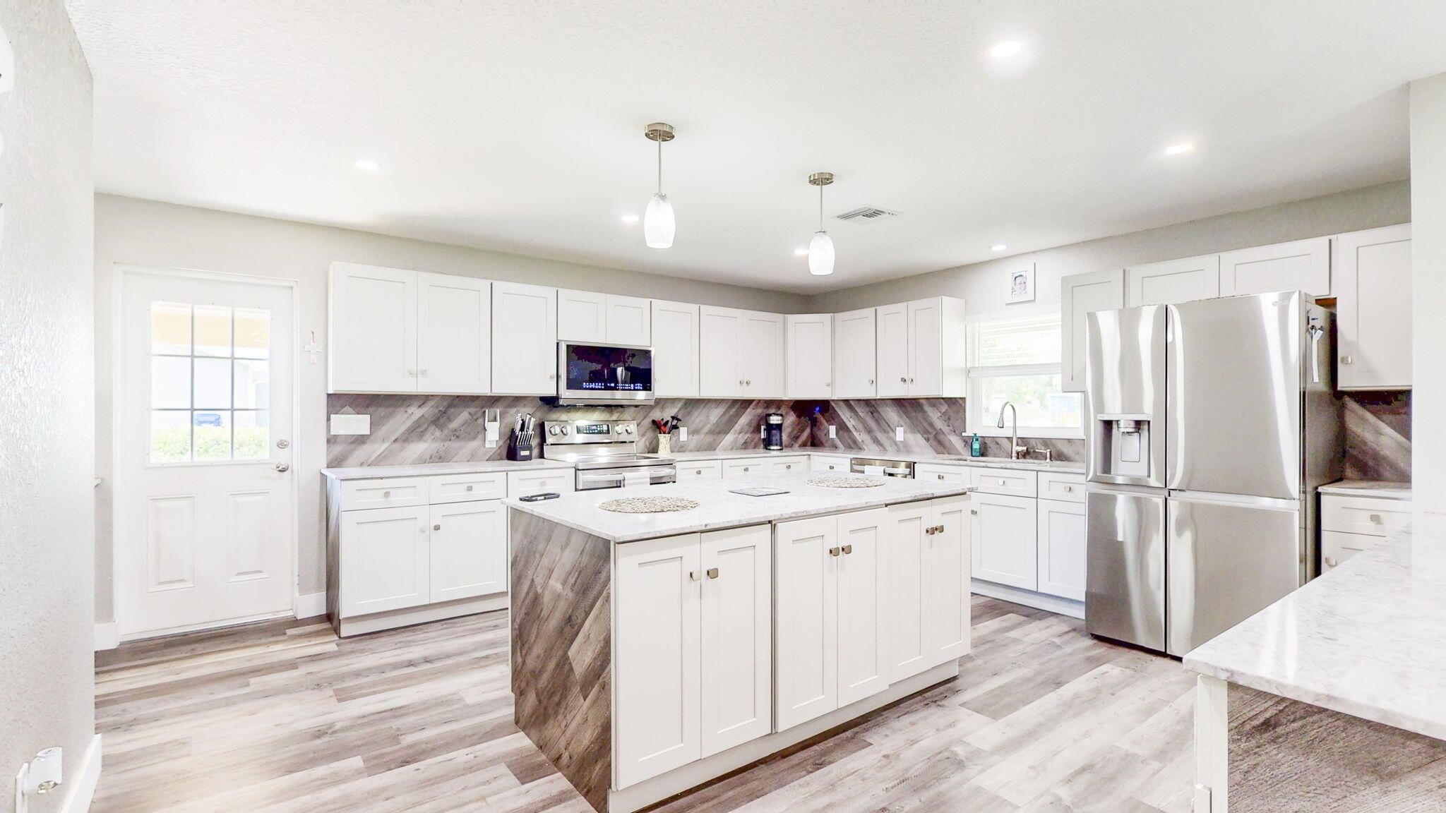 Price Drop! Welcome to this beautifully remodeled 4-bedroom, 3-bathroom home. Designed for both comfort and functionality, the property offers a spacious layout and a wide range of modern enhancements. Inside, you'll find luxury vinyl flooring throughout, two new air conditioning systems and two new hot water heaters, The guest bathroom features a jacuzzi tub, and impact windows and doors provide energy efficiency and storm protection. The home is also equipped with a setup for a whole-house generator. The kitchen, baths, and living spaces have all been completely remodeled, creating a fresh and move-in ready environment. Outdoor living is maximized with a wrap-around porch finished with Trex decking, a fire pit in the front yard, a carport, and a detached garage. The expansive