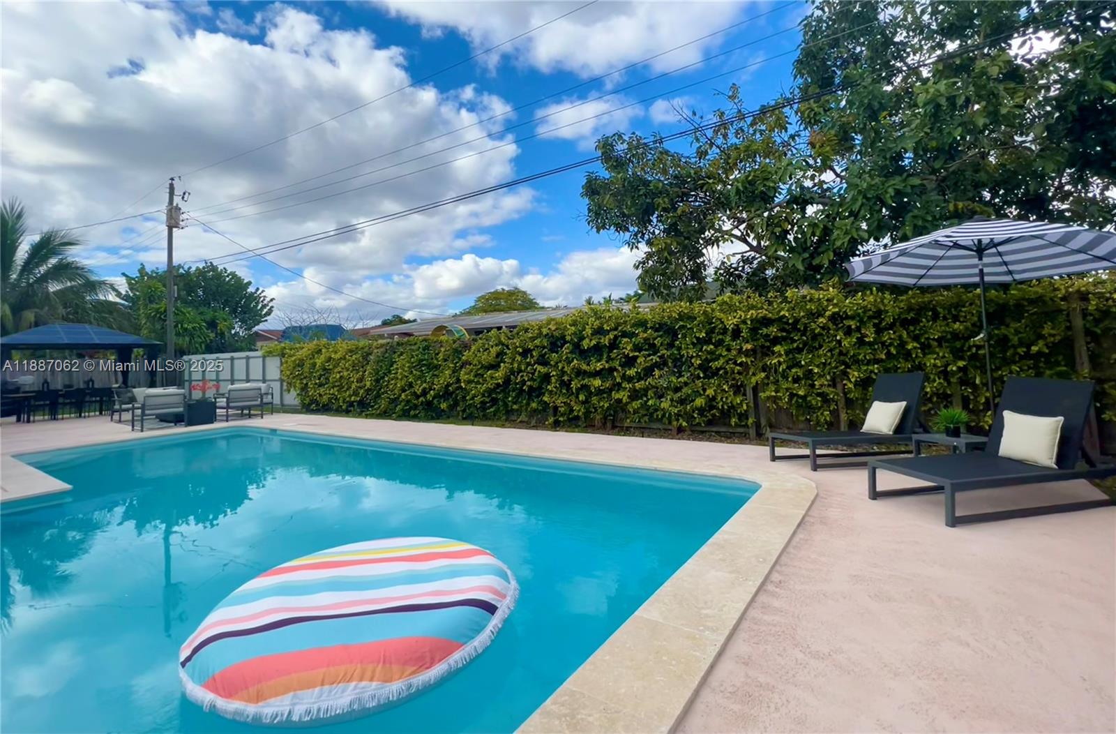 LOCATION LOCATION!!! BEAUTIFUL SINGLE FAMILY HOME 3 BEDROOMS, 2 BATHROOMS,TWO CAR GARAGE WITH AMAZING BIG POOL. ONE-STORY HOME, WITH 5 YEAR NEW METAL ROOF, PATIO CONCRETE, HURRICANE IMPACT WINDWS AND DOORS, SIX-CAMARAS CCTV SECURITY SYSTEM, SMART THERMOSTAT AND BIG SPACE TO PARK ONE BOTE.OPEN FLOOR PLAN WITH LIVING, KITCHEN AND EXTENDED DINING / FAMILY ROOM. TILED FLOORS. NO OWNERS ASSOCIATION, EASY TO SHOW.
