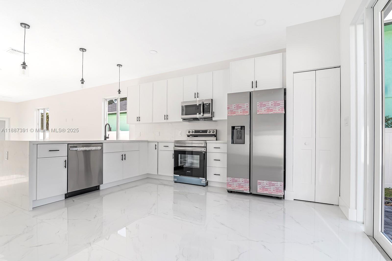 NEW CONSTRUCTION on a new Site Development of 5 Single Family Homes with no HOA. Quiet Street, Beautiful house with modern design, open kitchen concept and modern finishes. 1,560 Sqft. 3 bedrooms, 2 full baths, 1 Half Bath. Equipped with New stainless steel kitchen appliances, Quartz counter top, white kitchen cabinets made of pine wood, wall cabinets upgraded to 42'' height. Modern floors in glossy white big format Venatto porcelain tile throughout the house, Impact windows, concrete pavers driveway. Easy access from i-95. Fast growing new Neighborhood. Very close to Dania Pointe, Ft Lauderdale Airport, and the beach.
