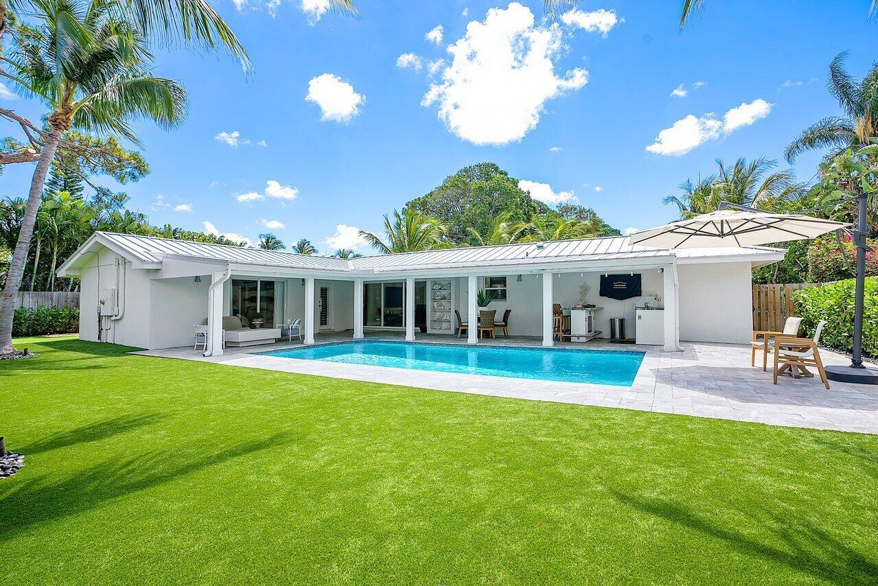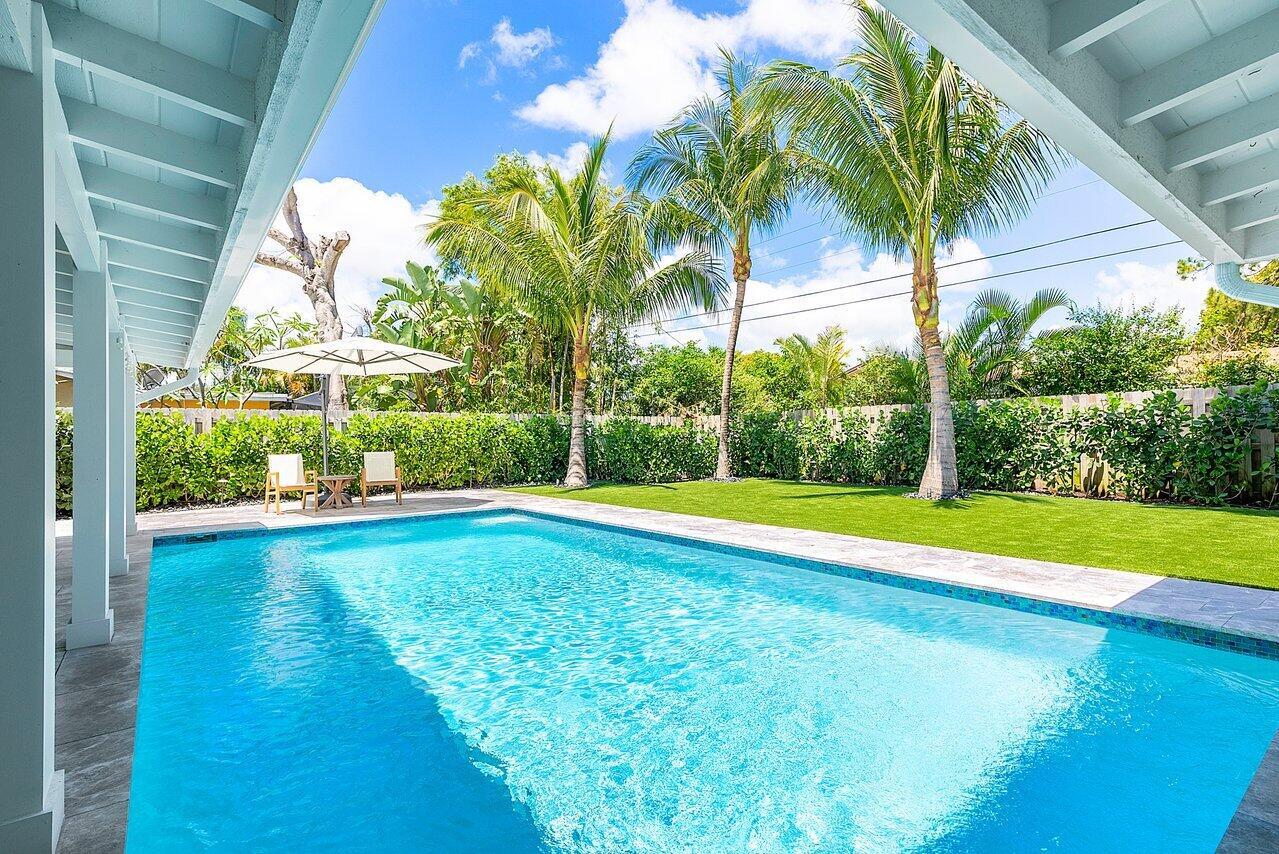 Step into luxury living at its finest with this completely renovated home in the heart of Boynton Beach. No detail has been overlooked in the transformation of this home, where modern amenities blend seamlessly with timeless elegance. From the moment you enter, you'll be greeted by the impeccable craftsmanship and attention to detail evident throughout. New electrical and plumbing (no cast iron pipes)! Step outside to discover an expansive pool area with covered loggia and summer kitchen/bar, perfect for outdoor entertaining. Custom landscaping, complete with landscape lighting and security cameras, enhances the curb appeal and security of the property. Practice your putting skills on the backyard putting green.