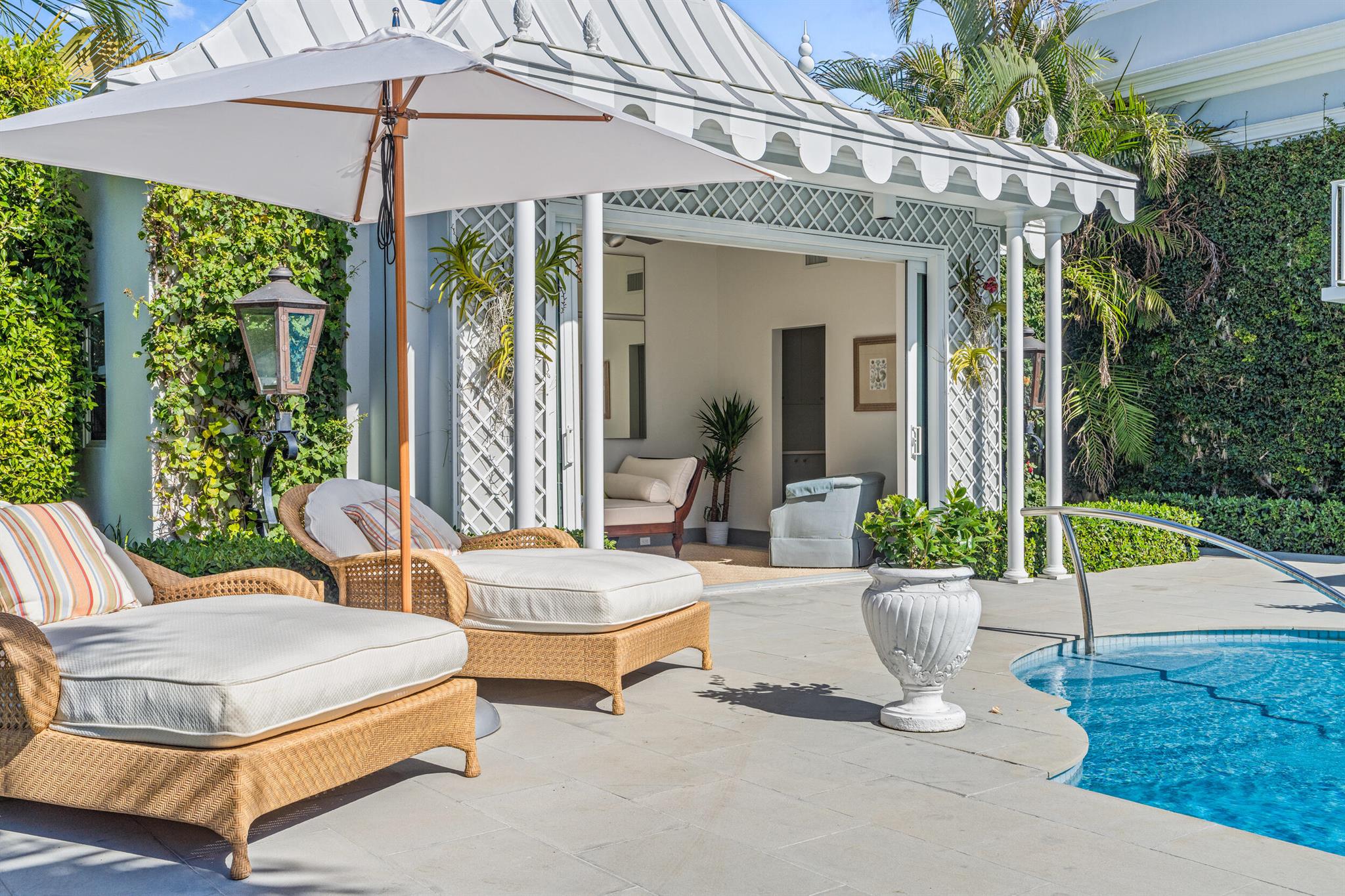 Regally elevated on over half acre this very proper Palm Beach residence showcases quintessential Palladian architecture set within beautifully landscaped pool gardens. Featuring hallmarks such as symmetry and proportion, the home offers very generous room sizes, ceiling heights, floor to ceiling windows and doors, an abundance of natural light from the many skylights throughout the home. Formal living and dining rooms are balanced with warm, inviting family gathering areas and spacious guest suites and quiet, lovely views from every window. Perfectly manicured landscaping envelopes the home, and the cabana with full guest suite anchors the north side of the grand heated swimming pool. A 3-car attached garage and plenty of driveway parking completes this wonderful north end offering.