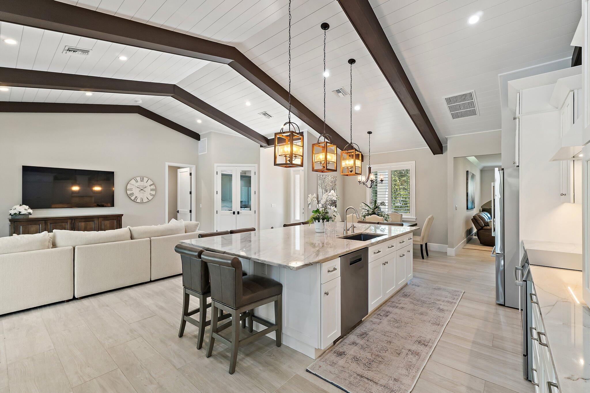 A rare opportunity to own 2.4 acres of pure sophistication, privacy, and purpose anchored by an extraordinary 1,750 square foot CBS garage that is fully air conditioned with 16 foot ceilings, ideal for car collectors, RV enthusiasts, guest quarters, or a business retreat. The space alone redefines versatility and luxury.Every inch of this remodeled estate home reflects thoughtful design and refined craftsmanship. With 3 bedrooms, 2 baths, and a spacious den, the interior features elegant 7 inch crown moldings, solid 8 foot core doors, vaulted beam ceilings, custom cabinetry, plantation shutters, and designer lighting throughout. The beautifully curated home office creates an inspiring environment to work or create from home.The gourmet kitchen is a showpiece of style and function,