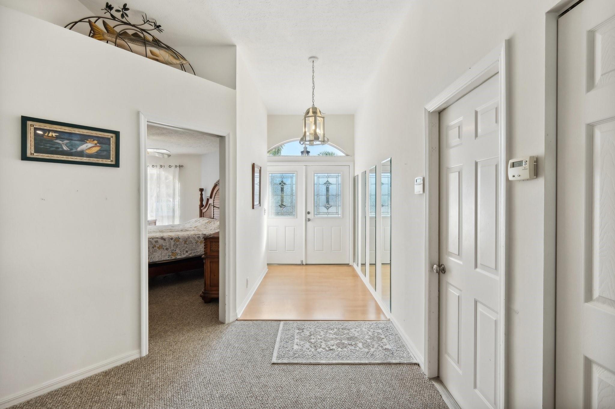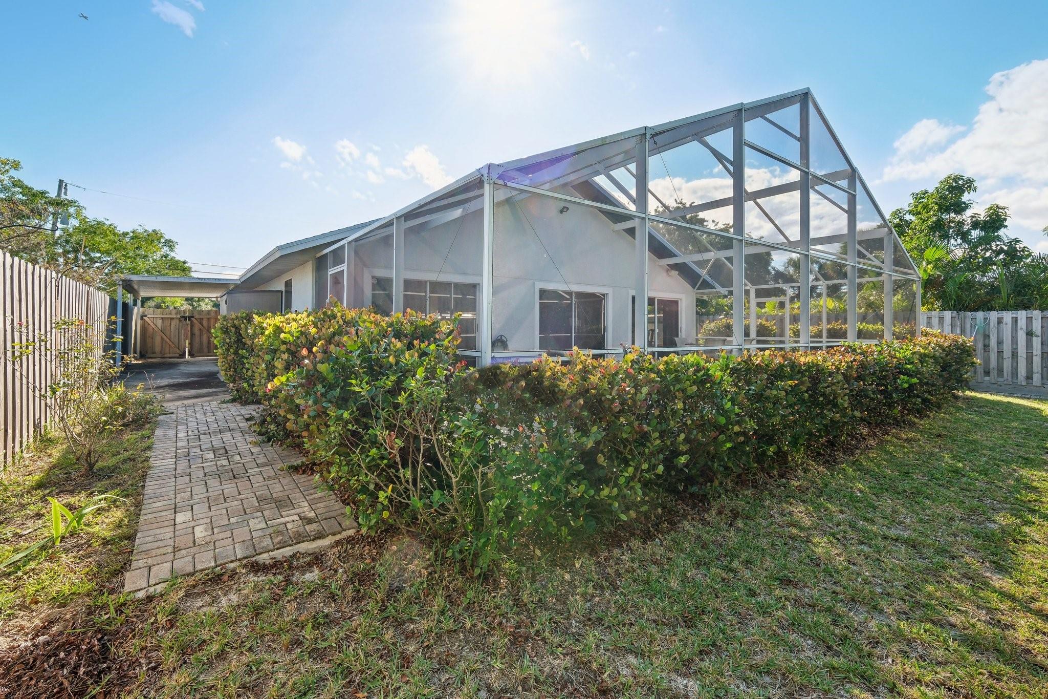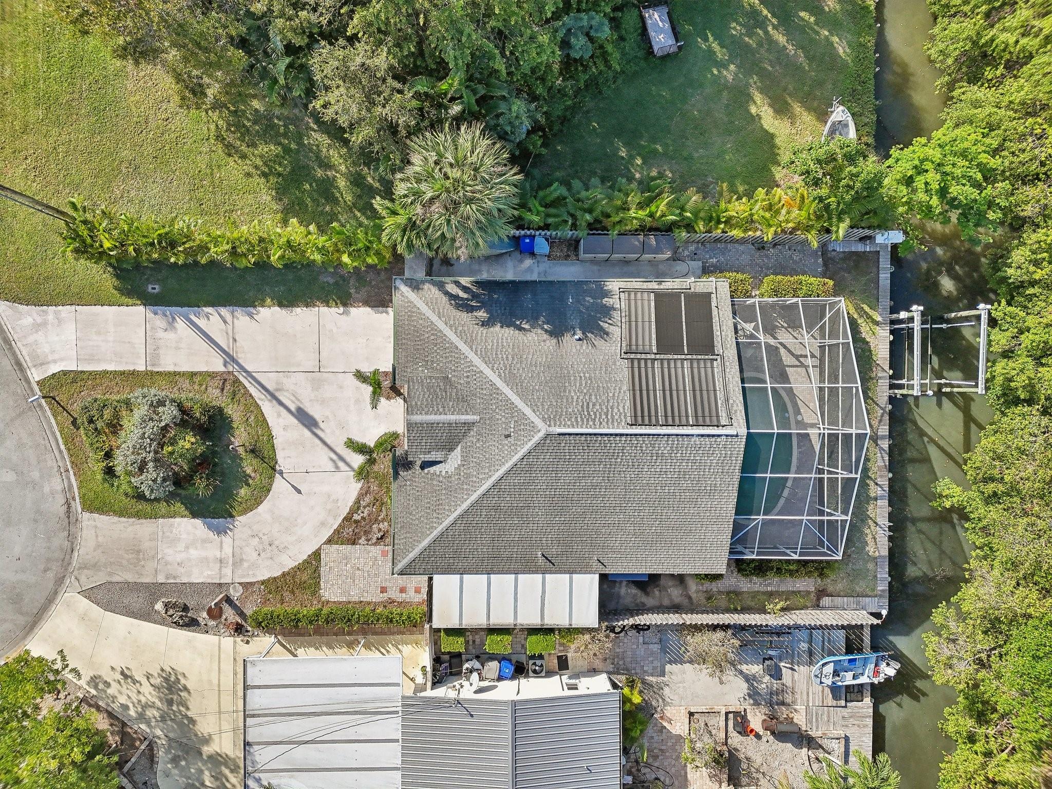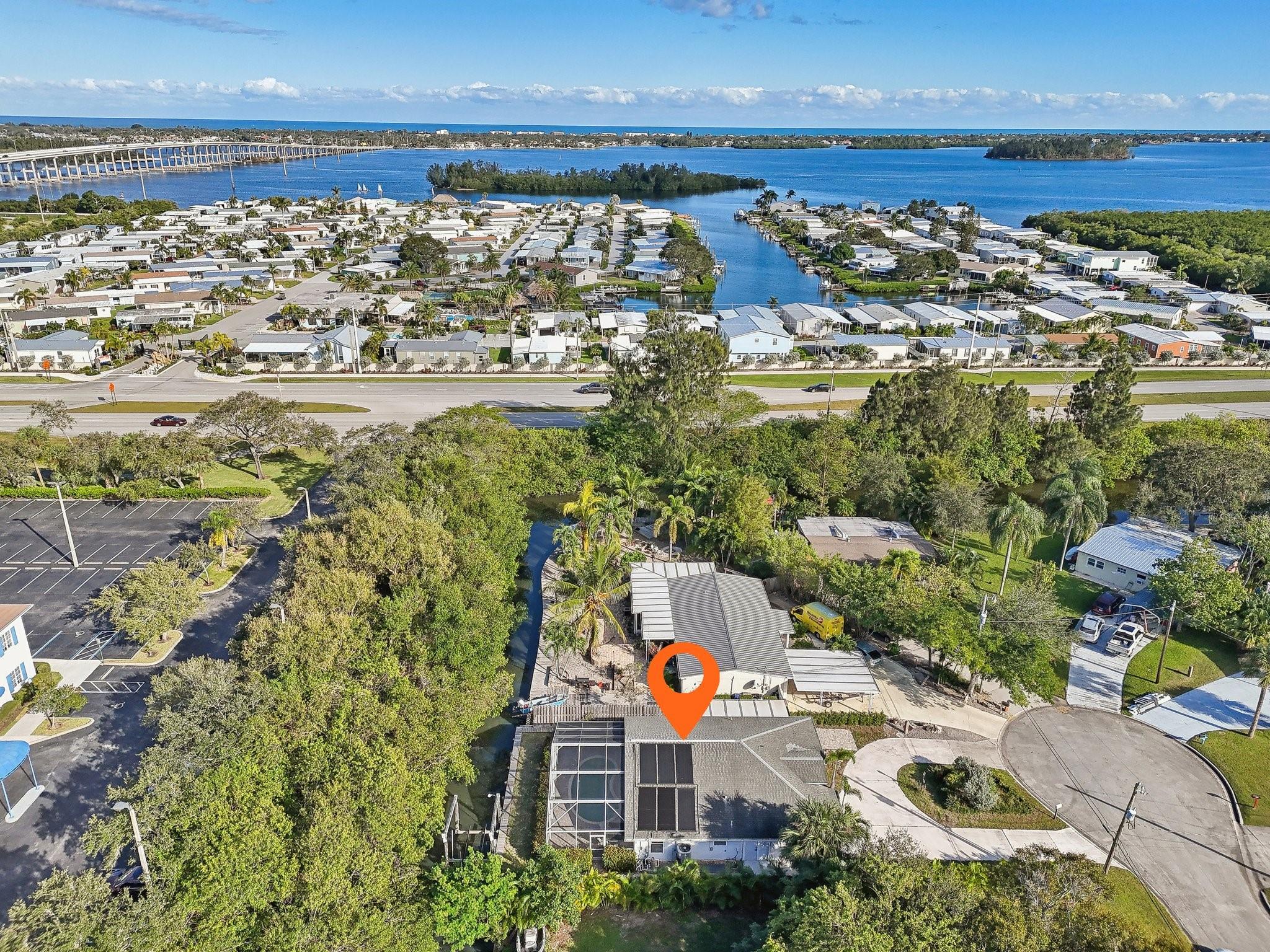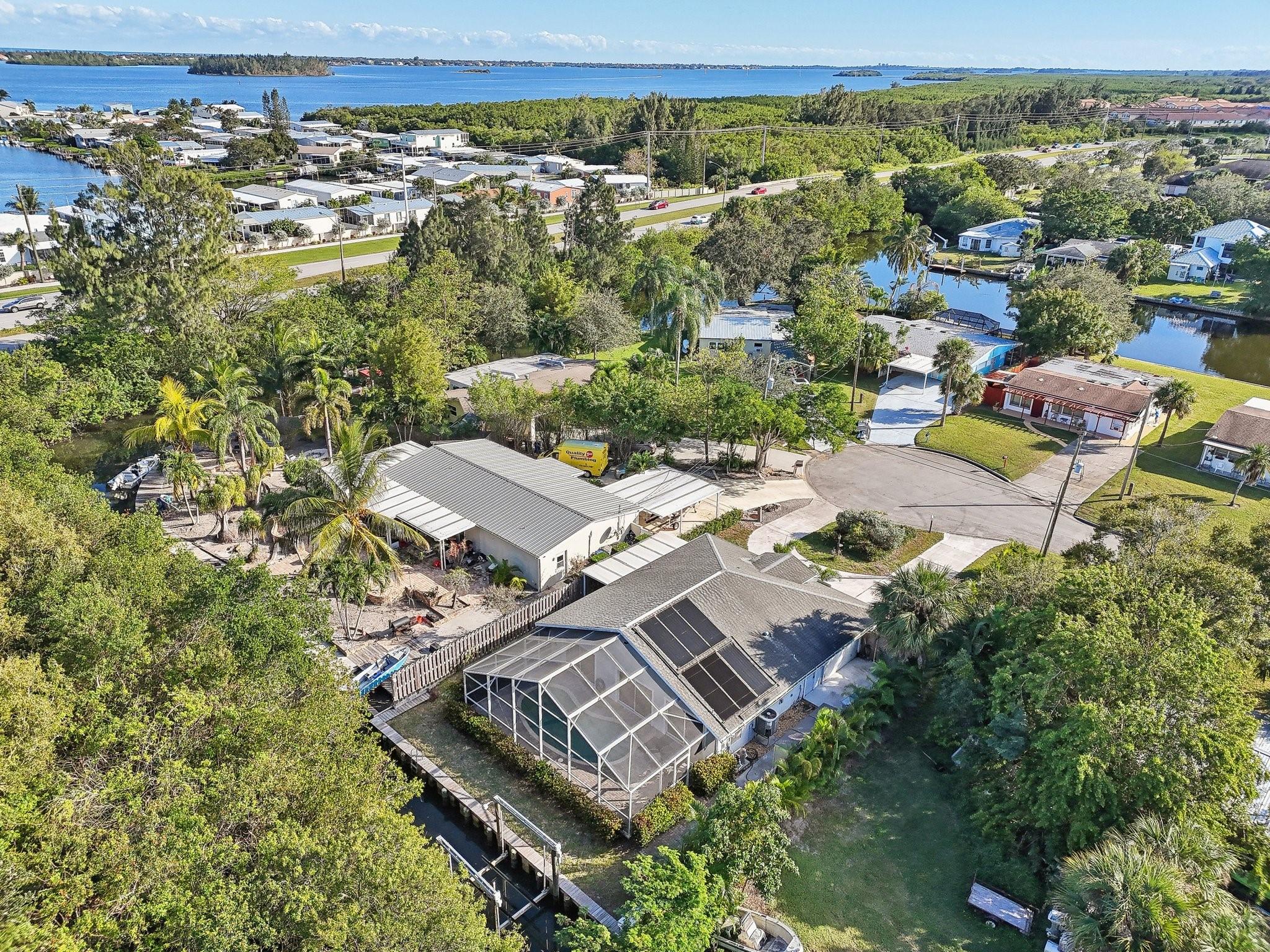 WATERFRONT WITH POOL! BRAND NEW ROOF 11/2025! This tropical retreat is a mariner’s paradise, offering two bedrooms, two bathrooms, and endless charm. Relax by the screened-in, solar-heated pool or enjoy the private dock with a 9,000-pound lift and fish cleaning station. Located at the end of a cul-de-sac, the property features a circular driveway and trailer pad. Fully furnished and move-in ready, just bring your boat! Inside, vaulted ceilings and sliding glass doors lead to a screened lanai with an outdoor shower. Equipped with two en suite bedrooms, an open kitchen, a bonus room, and home security and irrigation systems, this home blends comfort and convenience, just minutes from the beach. Seller financing available with 20% down payment and 6% interest. Don’t wait, this won’t last!