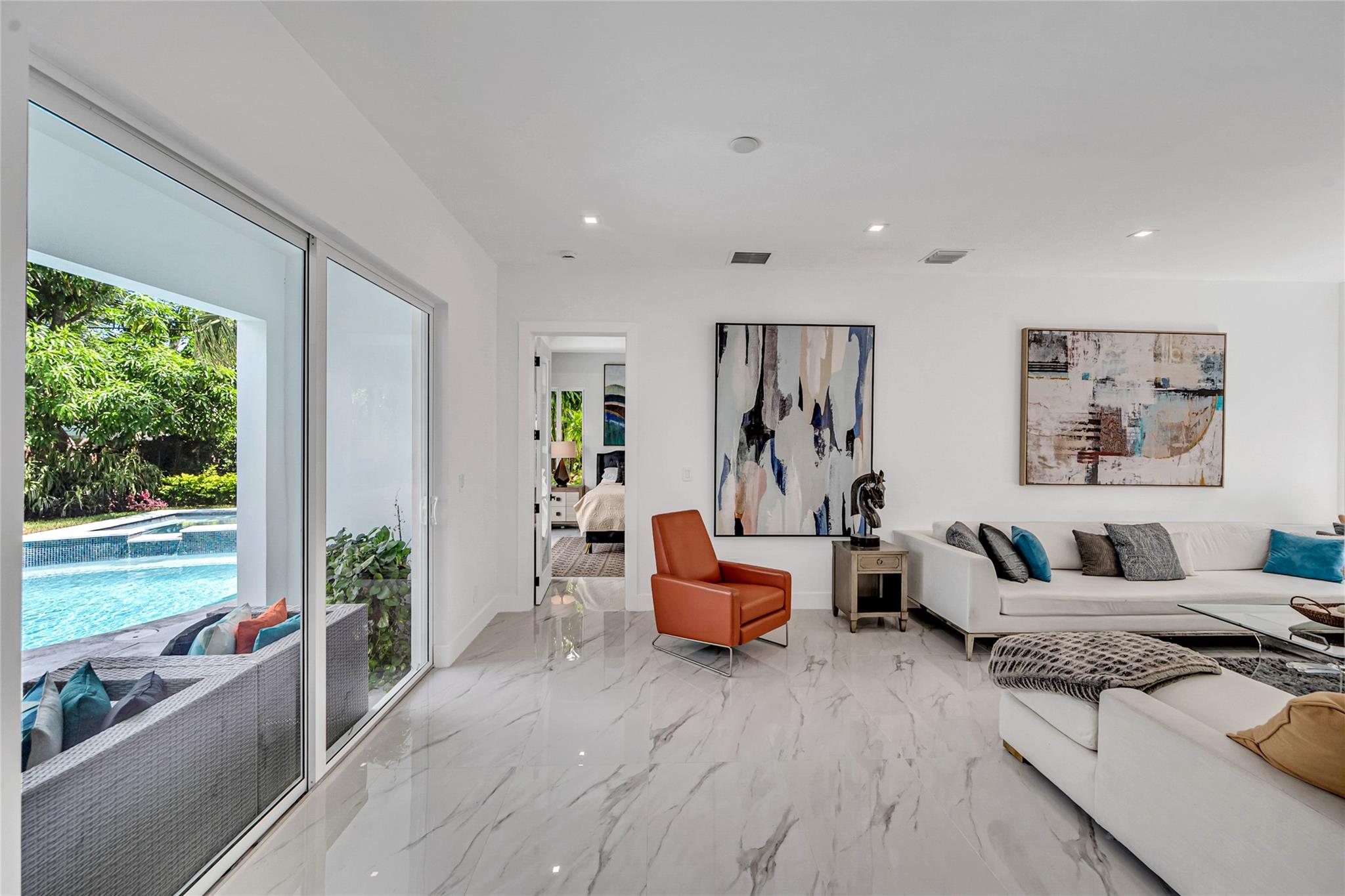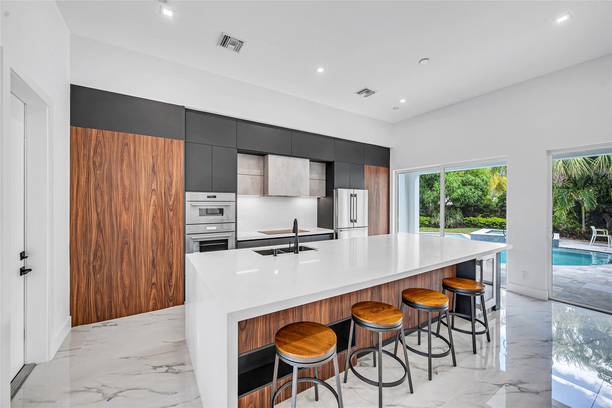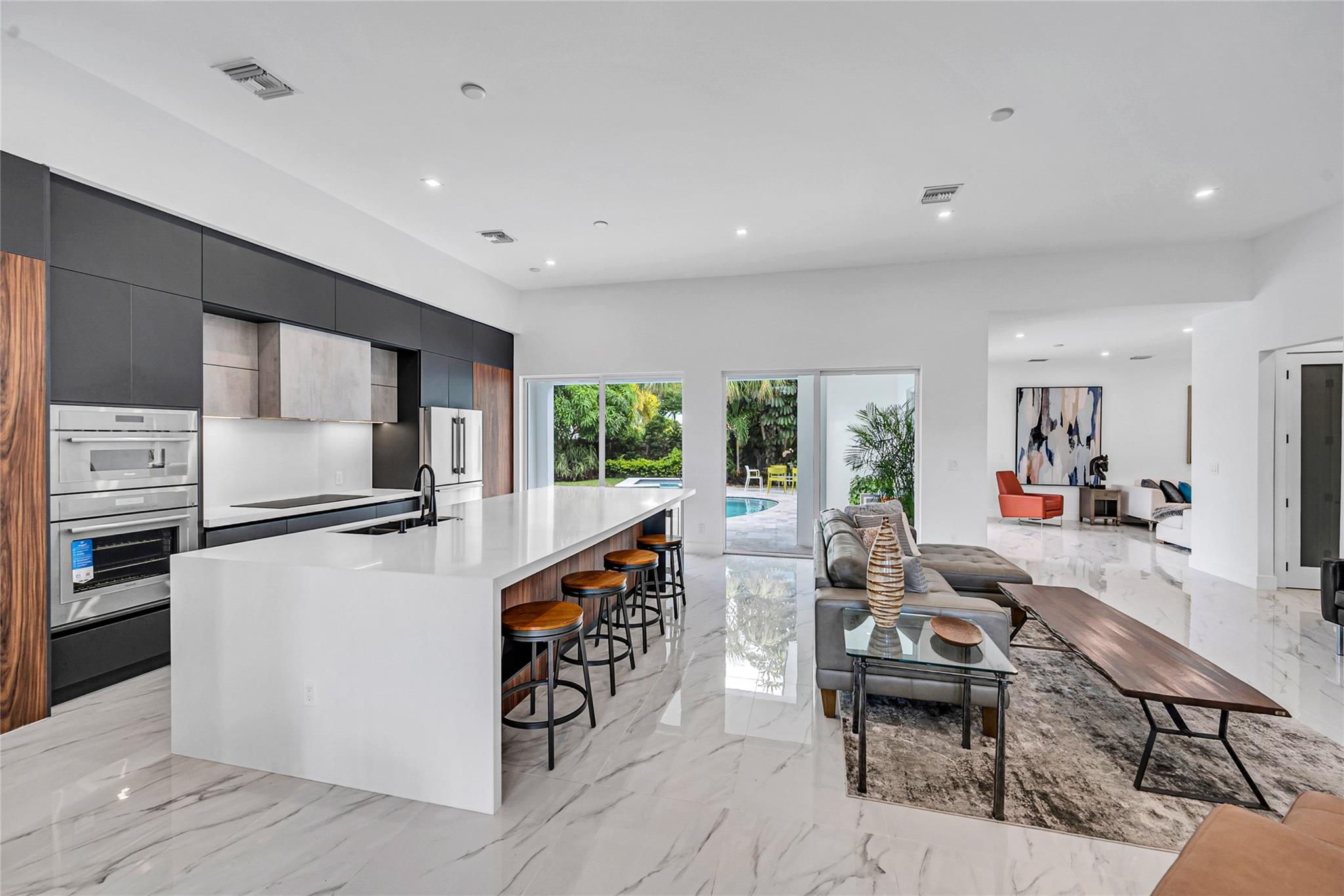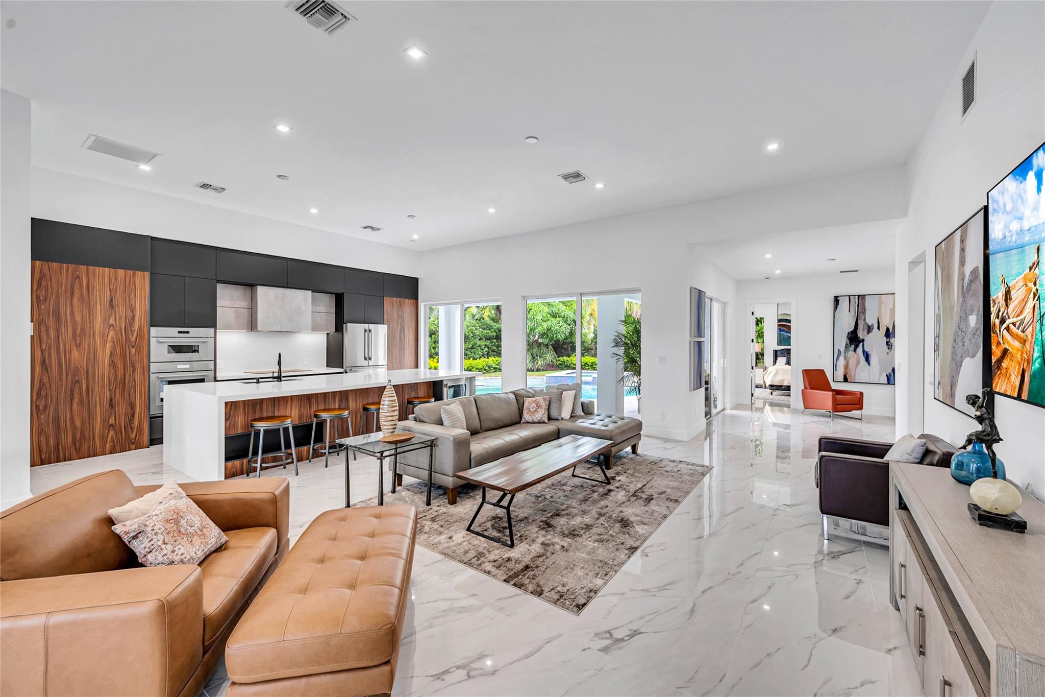 Experience refined luxury in this 2025 new construction offering over 3,480 sqft under air with soaring 12–14 ft. ceilings and an open-concept design. The Italian kitchen stuns with Thermador appliances and a massive 14 ft quartz island. Four spa-style en suites plus a flexible family room (optional 5th bedroom). Advanced smart home with voice activation and automated lighting. Outdoors, a private landscaped oasis showcases a heated saltwater pool with beach shelf for 30 people, 12 person spa, and marble surround - Perfect for pool parties & entertaining! Extras include a gleaming epoxy garage equipped w/ EV charger. Pitched tile upgraded roof, superior to flat roofs found in many modern builds. Prime location near Wilton Drive, beaches, airport & Brightline on a quiet no-pass-thru street.