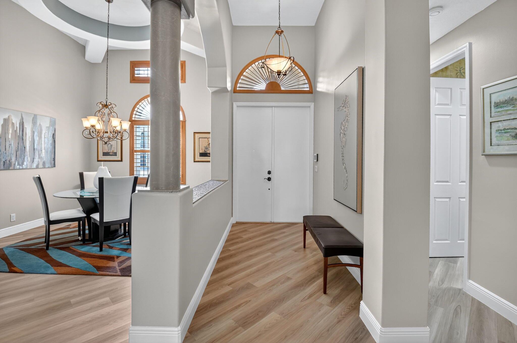 This stunning 4-bedroom residence showcases sweeping lake views, soaring coffered ceilings, plantation shutters, and timeless architectural details. The gourmet kitchen offers abundant custom cabinetry, stainless appliances, and a quartz waterfall breakfast bar. A luxurious primary suite provides two custom closets, a spacious sitting area, and spa-inspired bath. French doors open to a serene, screened patio, perfect for entertaining or quiet relaxation.Upgrades include new AC, whole-house generator, professional landscaping, and paver hardscape. Coronado Estates offers gated entry, clubhouse with fitness, tennis, basketball, playground, and social spaces--all in a prime location near top schools, shopping, and within walking distance to houses of worship.